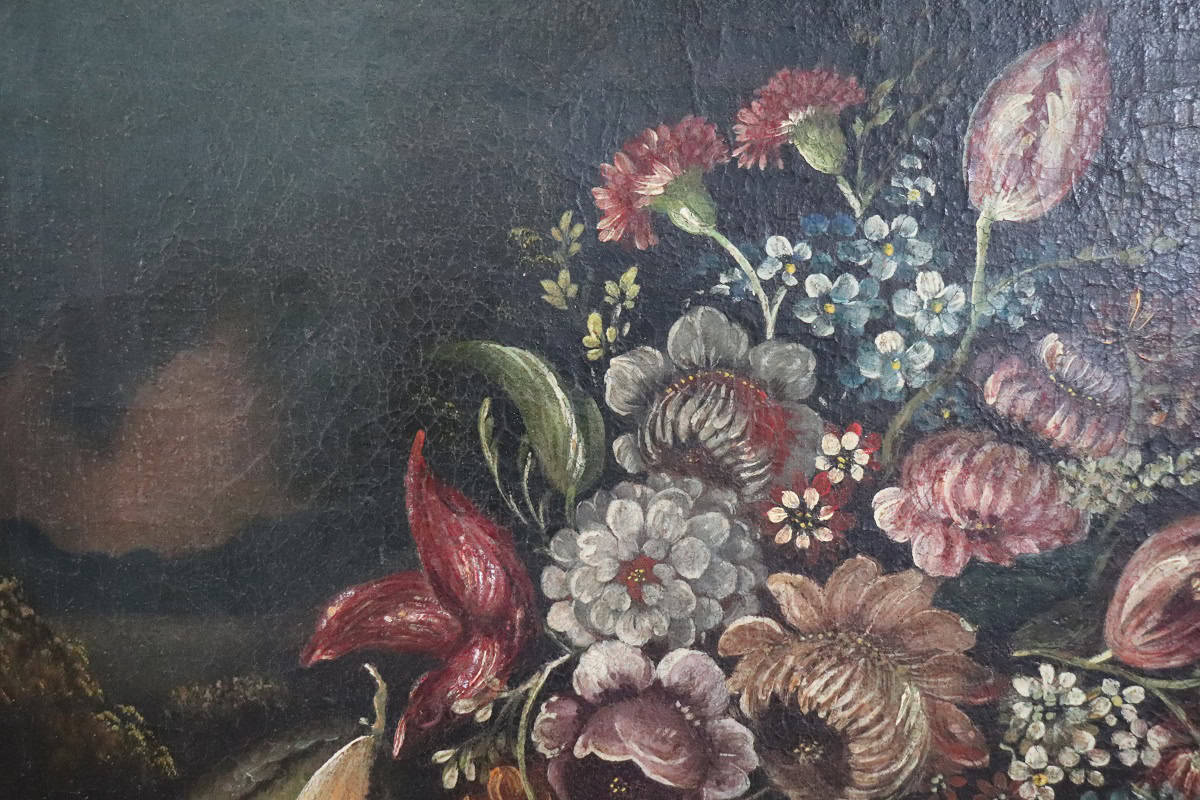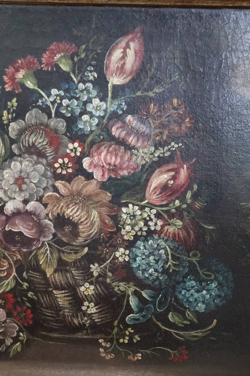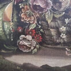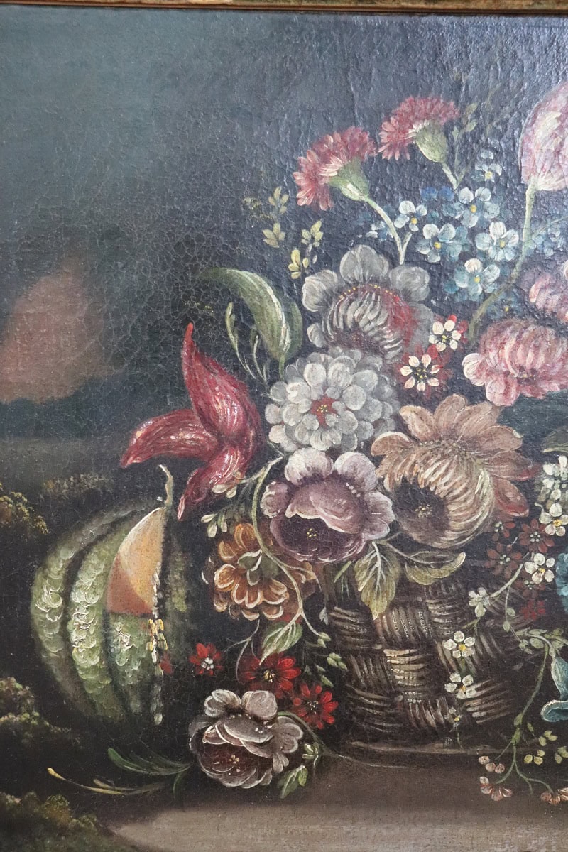 Discover this refined Italian 18th Century Painting, executed in oil on canvas. This artwork presents a classic Baroque still life composition. The scene features a basket filled with tulips, roses, and carnations. A pumpkin or melon rests on the left side. A subtle landscape appears in the background and adds depth. This painting reflects the rich tradition of Italian and Flemish Baroque art. Artists used strong contrasts and deep tones to enhance visual drama. The composition also suggests vanitas symbolism and the fleeting nature of life.
