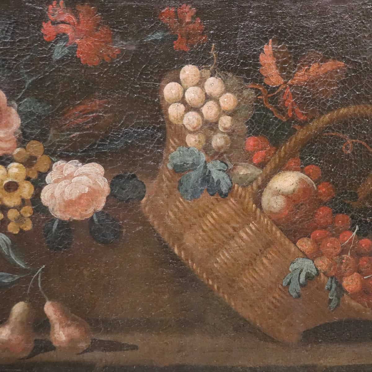 Discover this authentic Italian Antique Oil Painting from the 18th century. This oil on canvas artwork showcases a refined still life composition. The scene features white and black grapes, ripe pears, and a central basket of red fruits and apples. Roses and vibrant flowers add balance on the left side. Every element reflects the precision of Italian still life painting.