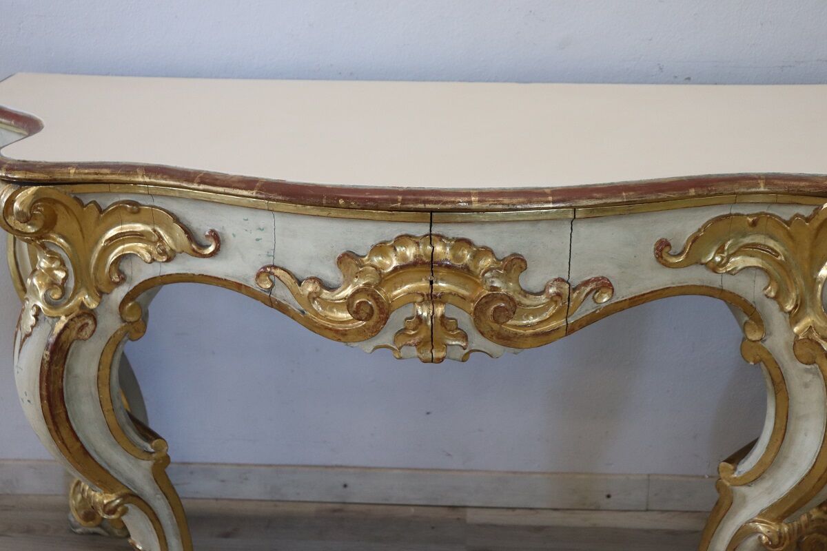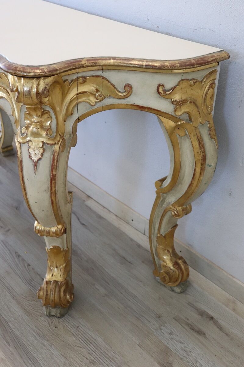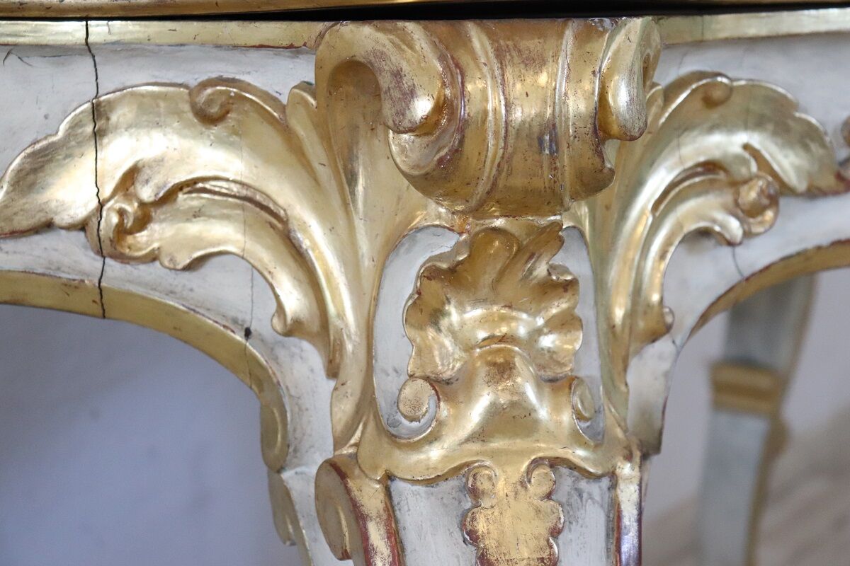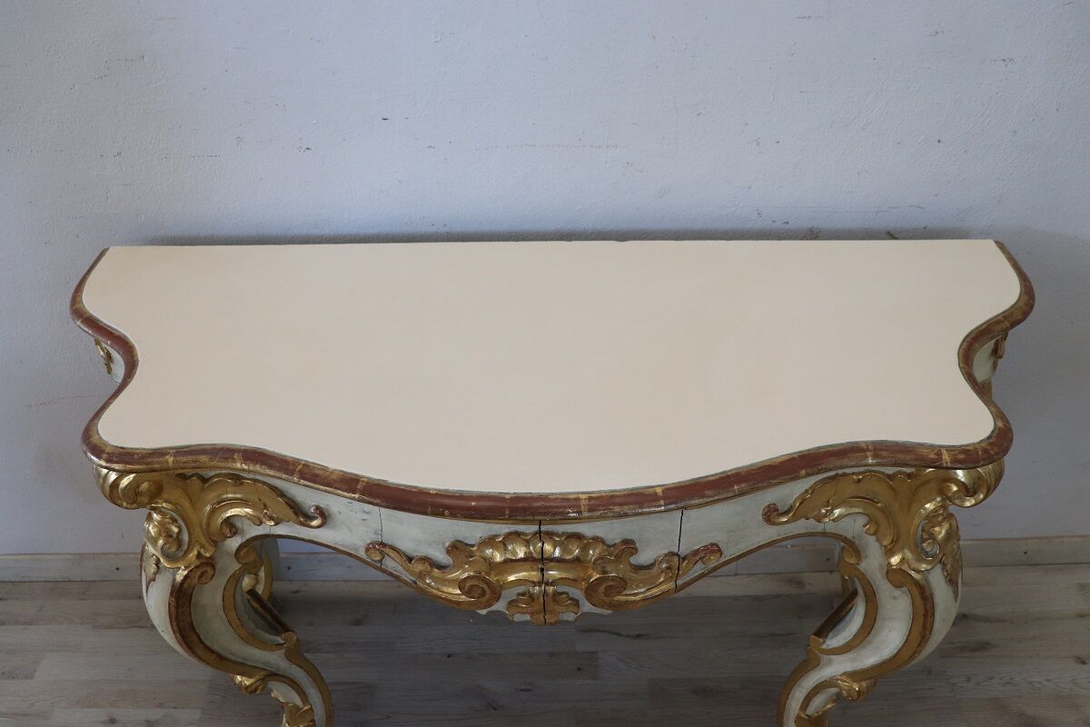 Beautiful majestic Italian gilded wood console table in Baroque style, 20th century. Made of wood with wavy legs and characterized by a refined decoration carved in relief with acanthus leaves, shells and curls. The base is lacquered, while the relief decorations are finely decorated with gold leaf and increase the preciousness of this piece of furniture. Signs of wear in the lacquering and gilt, the top had several signs of wear and the lacquering was redone, please look carefully at all the photos. Perfect for decorating an entrance or hall. A wonderful vintage table ready for your home today.