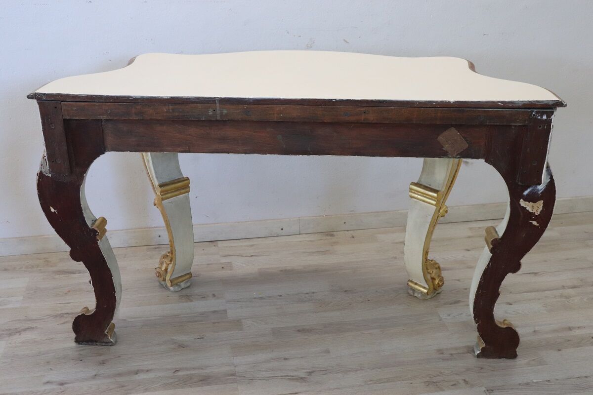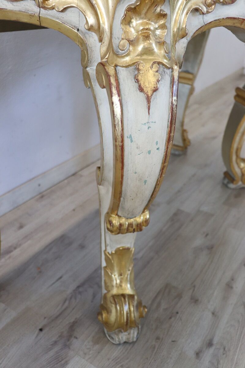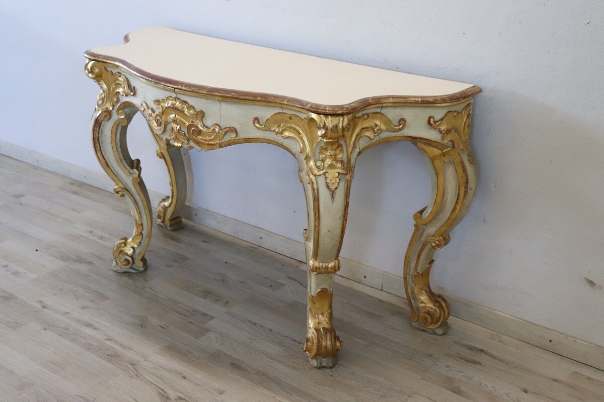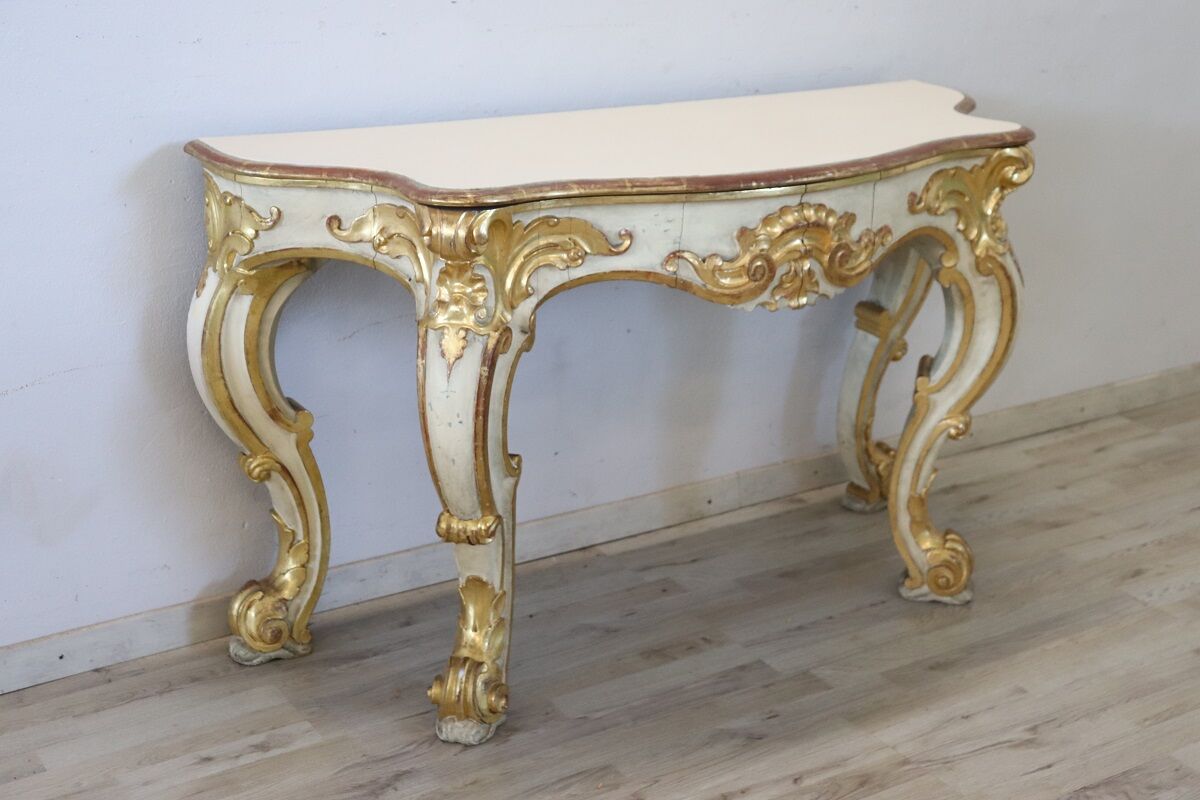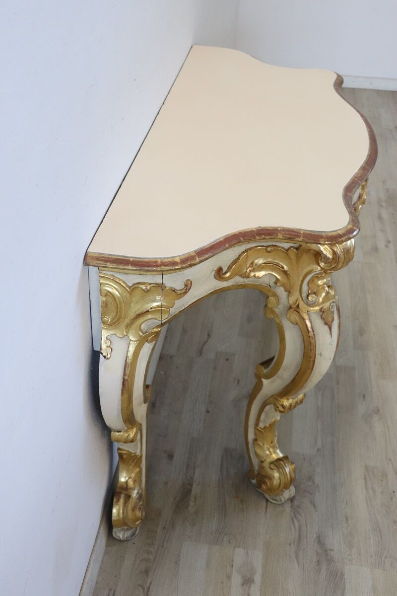 Beautiful majestic Italian gilded wood console table in Baroque style, 20th century. Made of wood with wavy legs and characterized by a refined decoration carved in relief with acanthus leaves, shells and curls. The base is lacquered, while the relief decorations are finely decorated with gold leaf and increase the preciousness of this piece of furniture. Signs of wear in the lacquering and gilt, the top had several signs of wear and the lacquering was redone, please look carefully at all the photos. Perfect for decorating an entrance or hall. A wonderful vintage table ready for your home today.