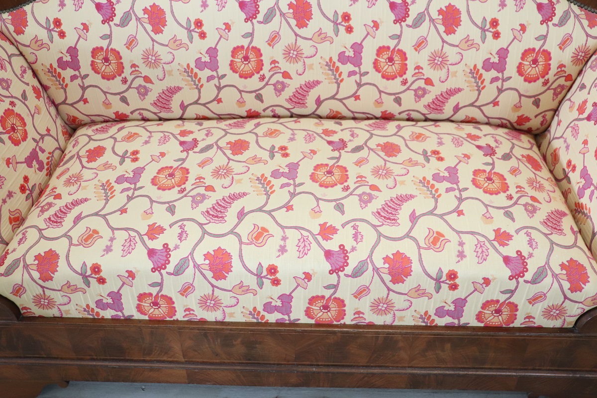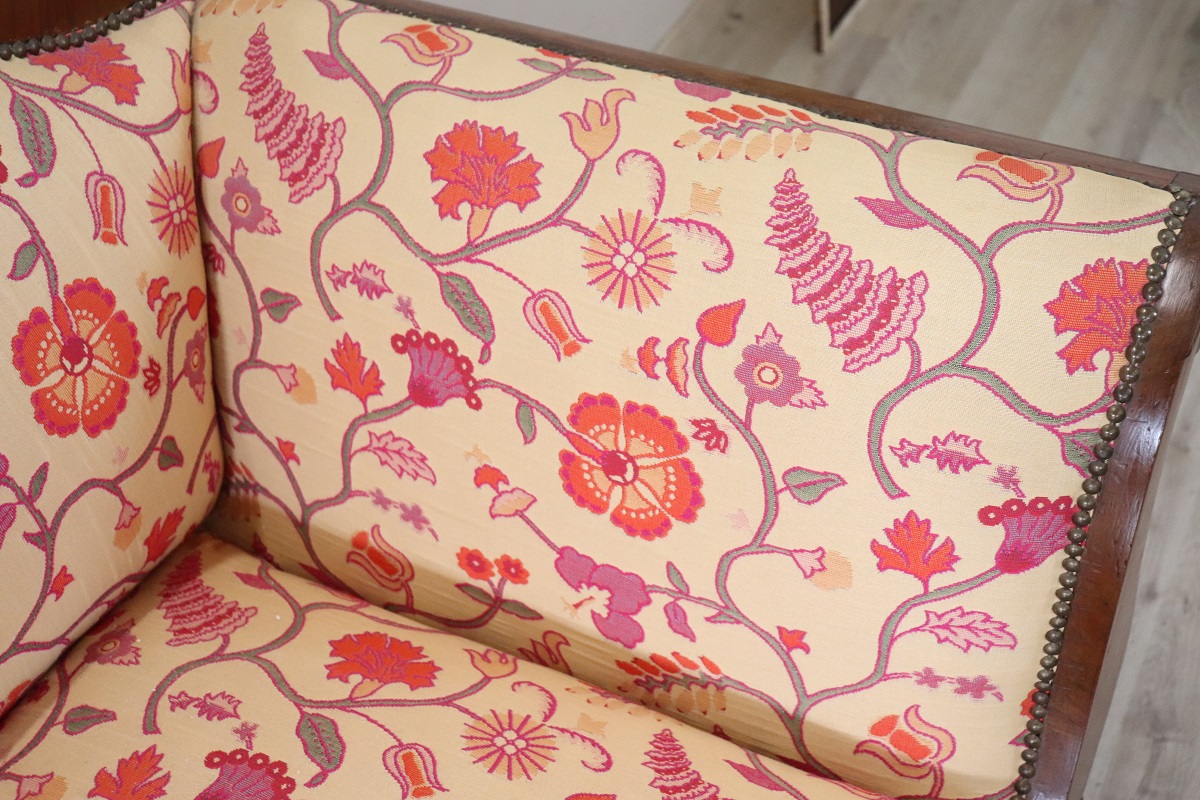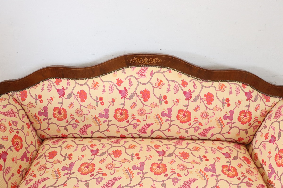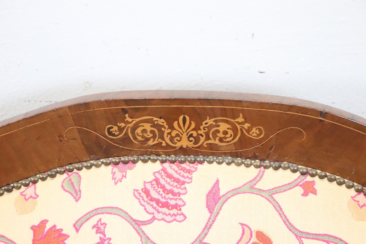 This elegant Italian Charles X Settee dates back to the first half of the 19th century. It features a solid walnut frame with refined inlaid details and flowing lines typical of the Charles X period.
