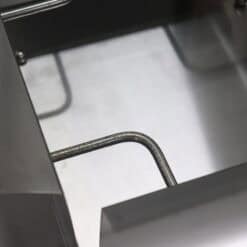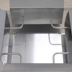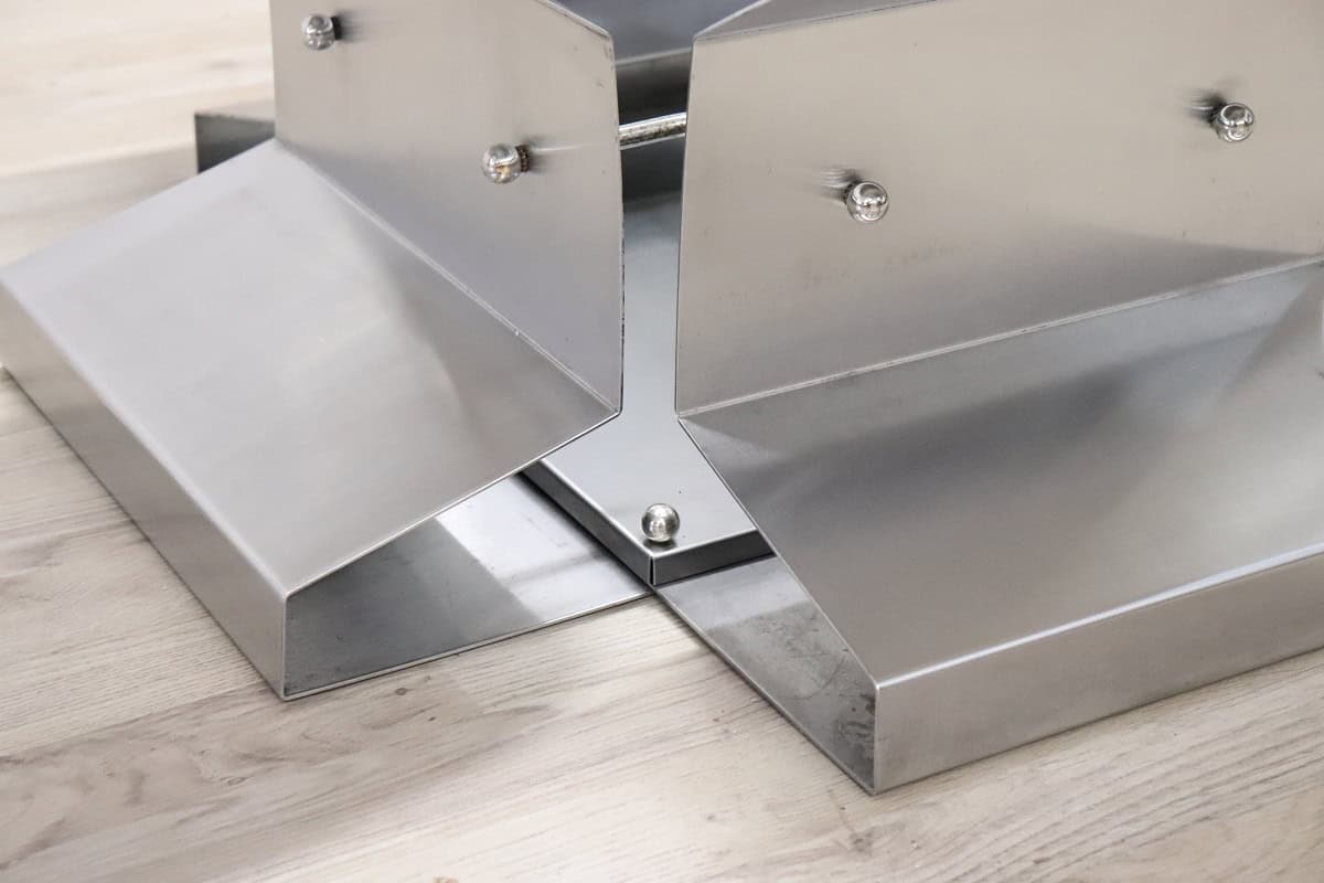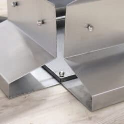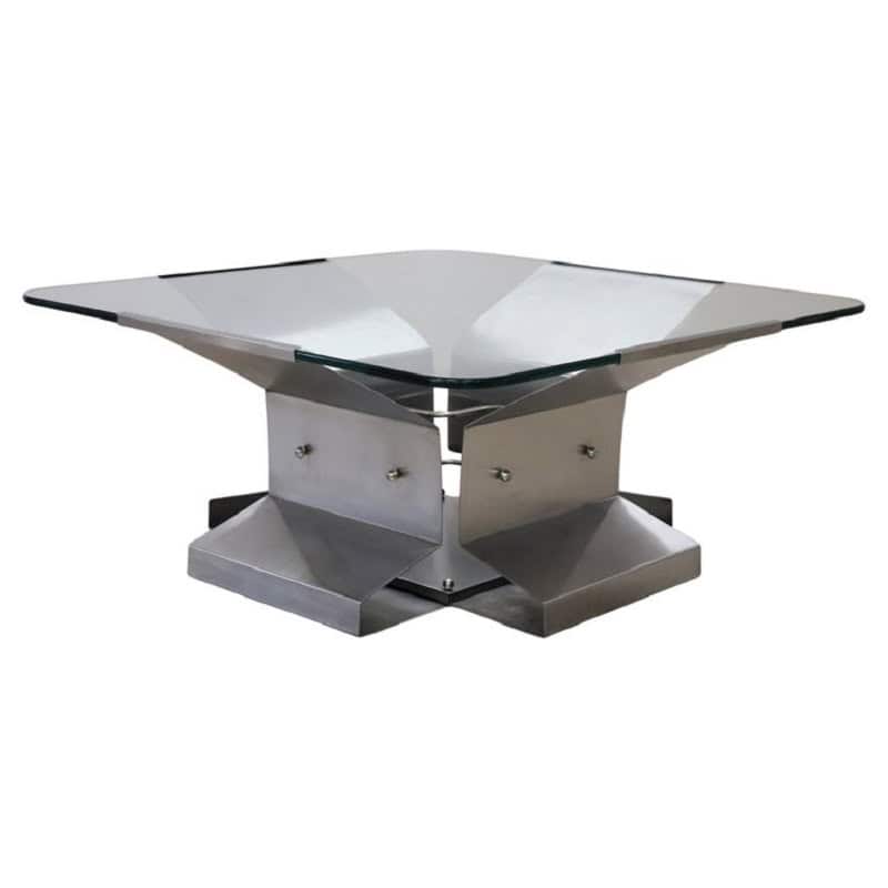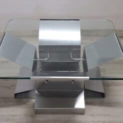 Discover this striking Italian Coffee Table from the 20th century. This piece showcases innovative design and refined craftsmanship. The structure features four expertly folded steel plates joined with precision. Steel rods connect each corner and ensure stability. The brushed steel finish adds a sleek and modern look. A thick glass top completes this table and enhances its bold geometry. Clean lines create a strong visual presence in any living space.