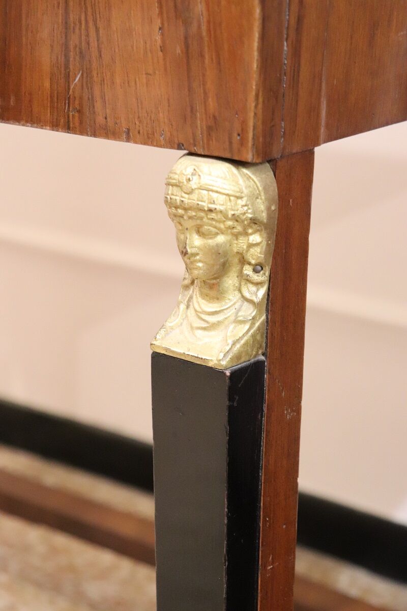 Made from fine walnut, the desk showcases clean lines and balanced proportions. Two black pilasters with gilded bronze caryatid capitals highlight the front, adding luxury and historical character.