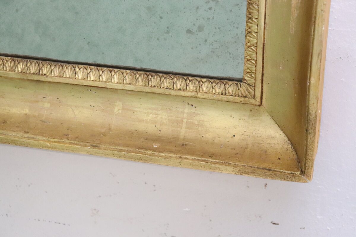 The gilding shows natural age marks, so review the photos for details. These marks add character and confirm its authentic antique charm. The mirror glass does not date to the same period as the frame, yet it reflects an antique look with intentional spotted areas that mimic historic mirrors.