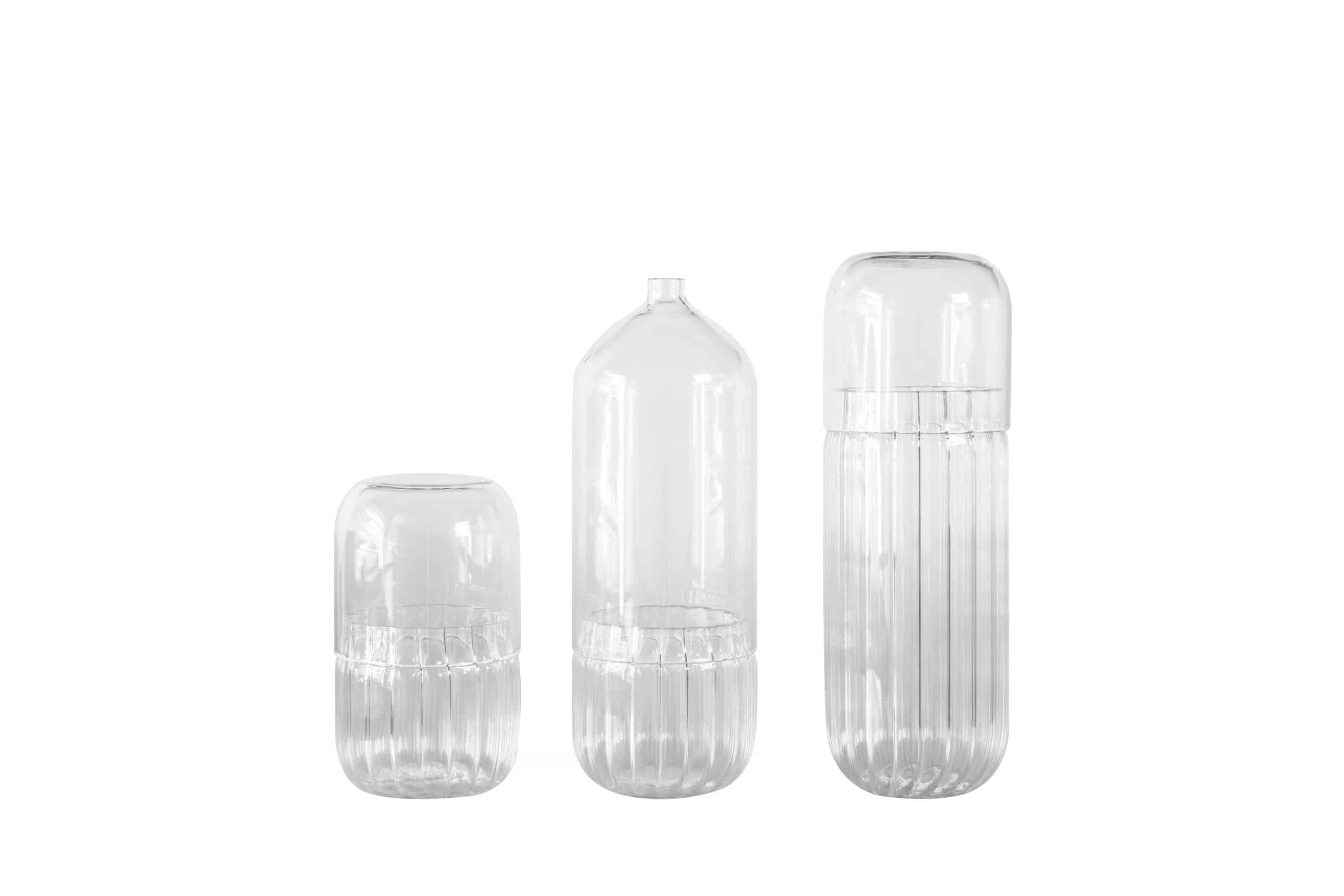 The Italian glass vase “Innesti” is a minimal yet amazing vase in two pieces, characterized by the contrast between the smooth and the lined glass. Designed by Gum Design and masterfully blown in Venice by Soffieria for Hands on Design.
