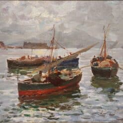 This Italian Oil Painting captures an early 20th-century view of the Gulf of Naples. The work is signed lower right: R. Leone, likely by Italian painter Leone Romolo (Naples, 1883–1958). The painting shows Castel dell’Ovo rising from the sea on the left and Mount Vesuvius in the background. Fishermen and their boats dominate the foreground, creating lively coastal scenery.
