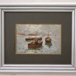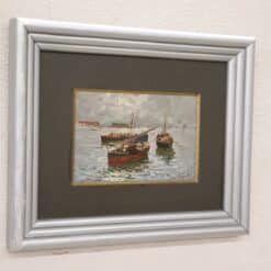 The painting comes in a lacquered wooden frame, enhancing its visual appeal and presentation. This piece suits collectors, coastal-themed interiors, or art enthusiasts.