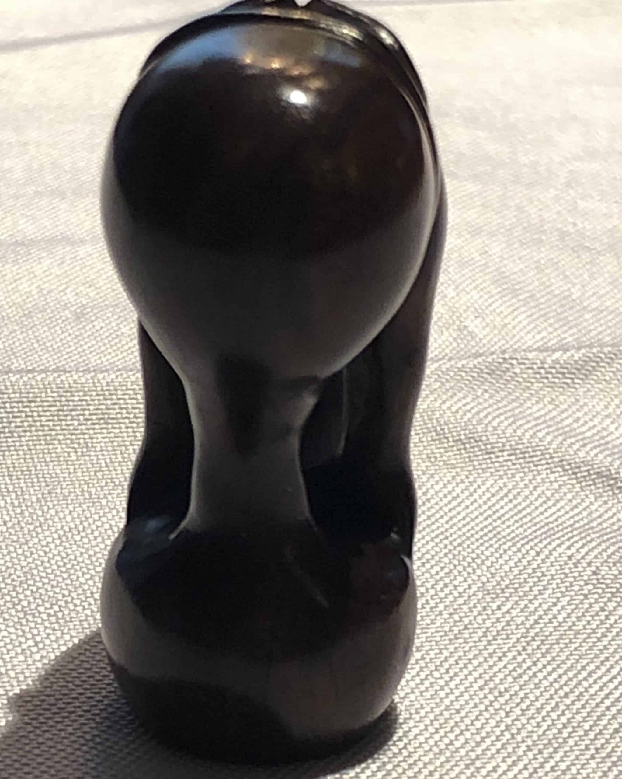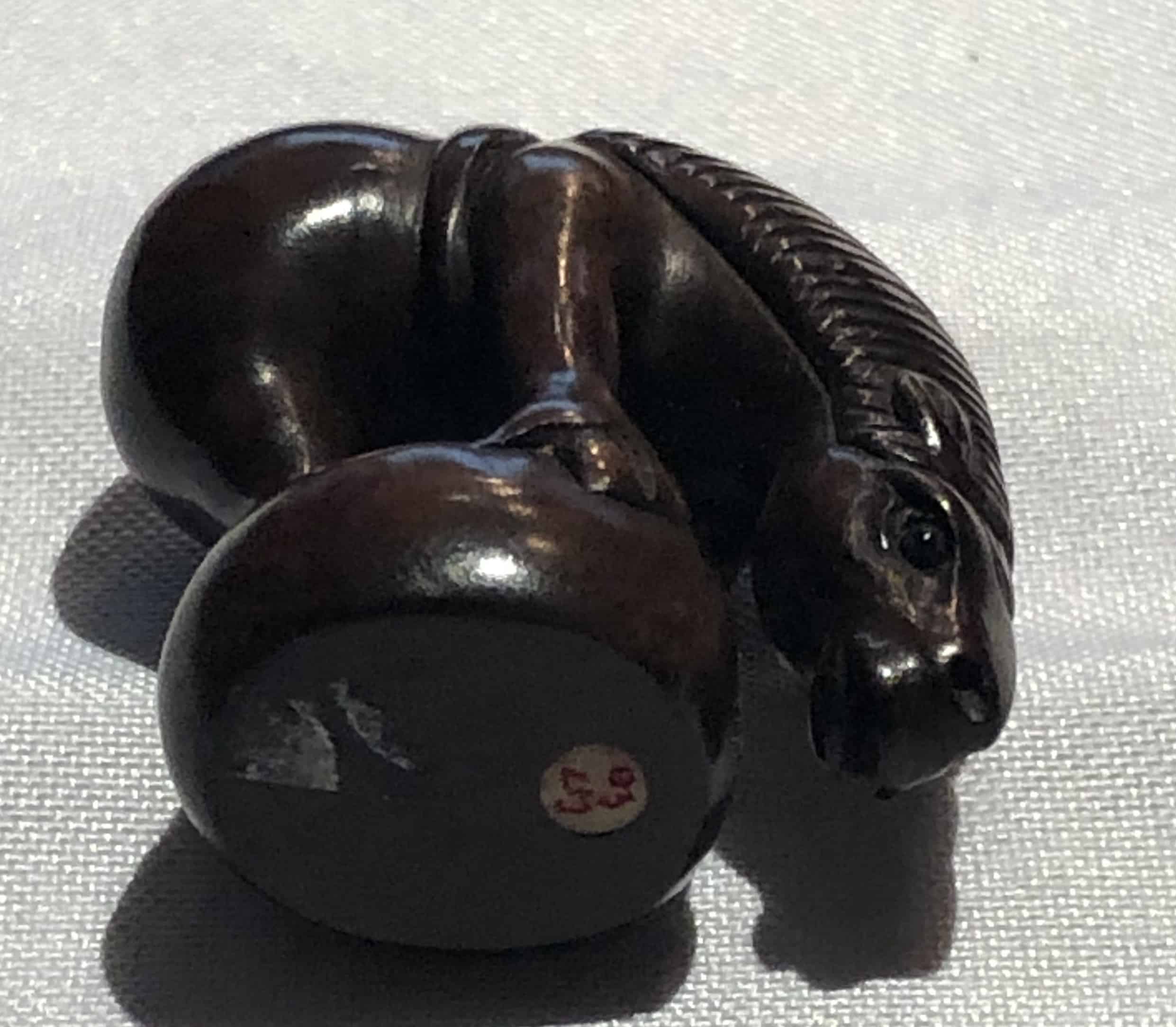 The Japanese netsuke measures Height: 1.5 in. (3.81 cm), Width: 1.8 in. (4.58 cm), Depth: 0.8 in. (2.04 cm) and is in very good condition.