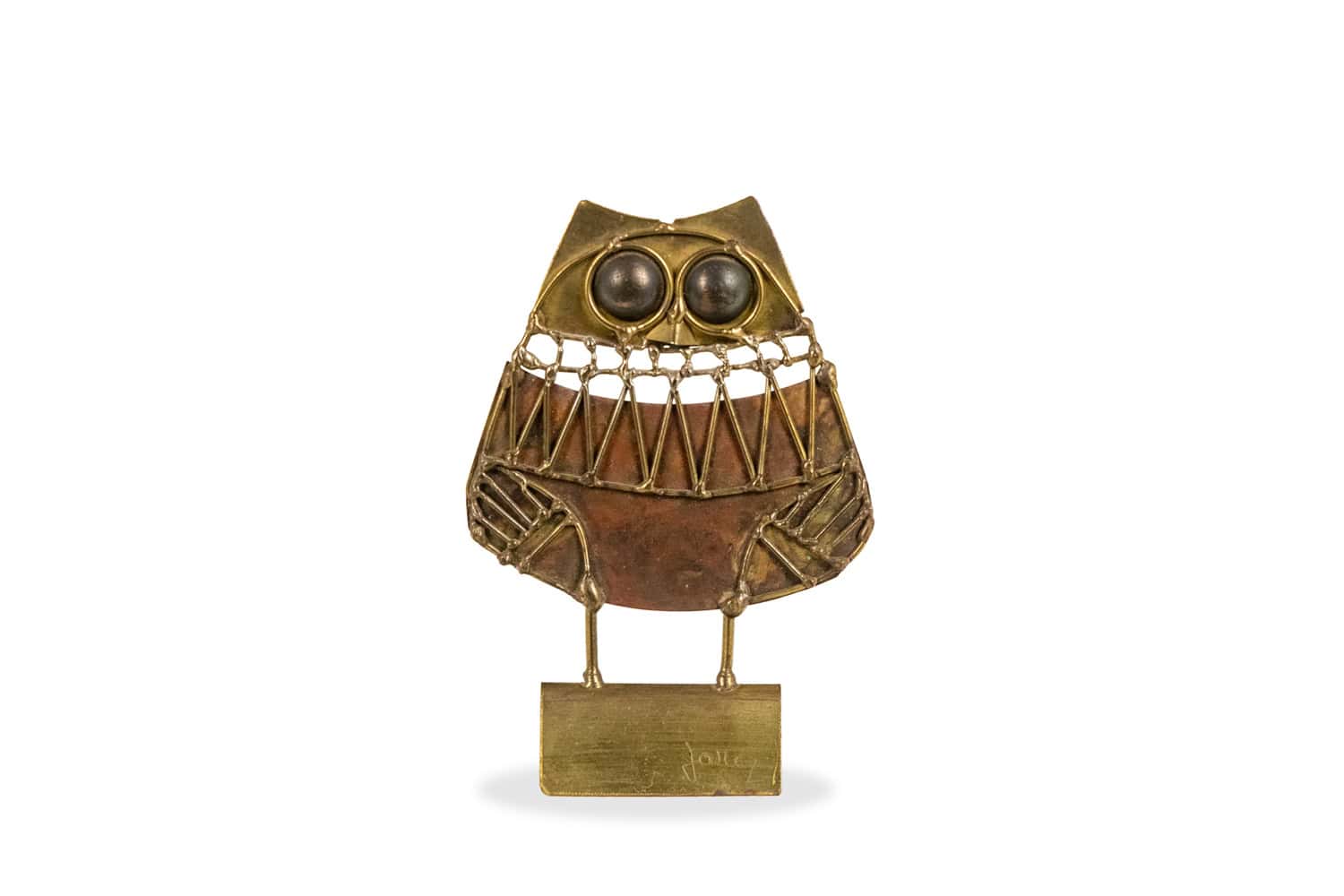 Discover this rare Jarcz Brutalist Owl Sculpture, signed by the artist. Jarcz crafted this unique brass owl in France during the 1970s. This piece features hand-shaped brass with strong geometric lines. The compact form captures the owl’s alert posture and expressive gaze. Textured surfaces enhance its raw Brutalist character.