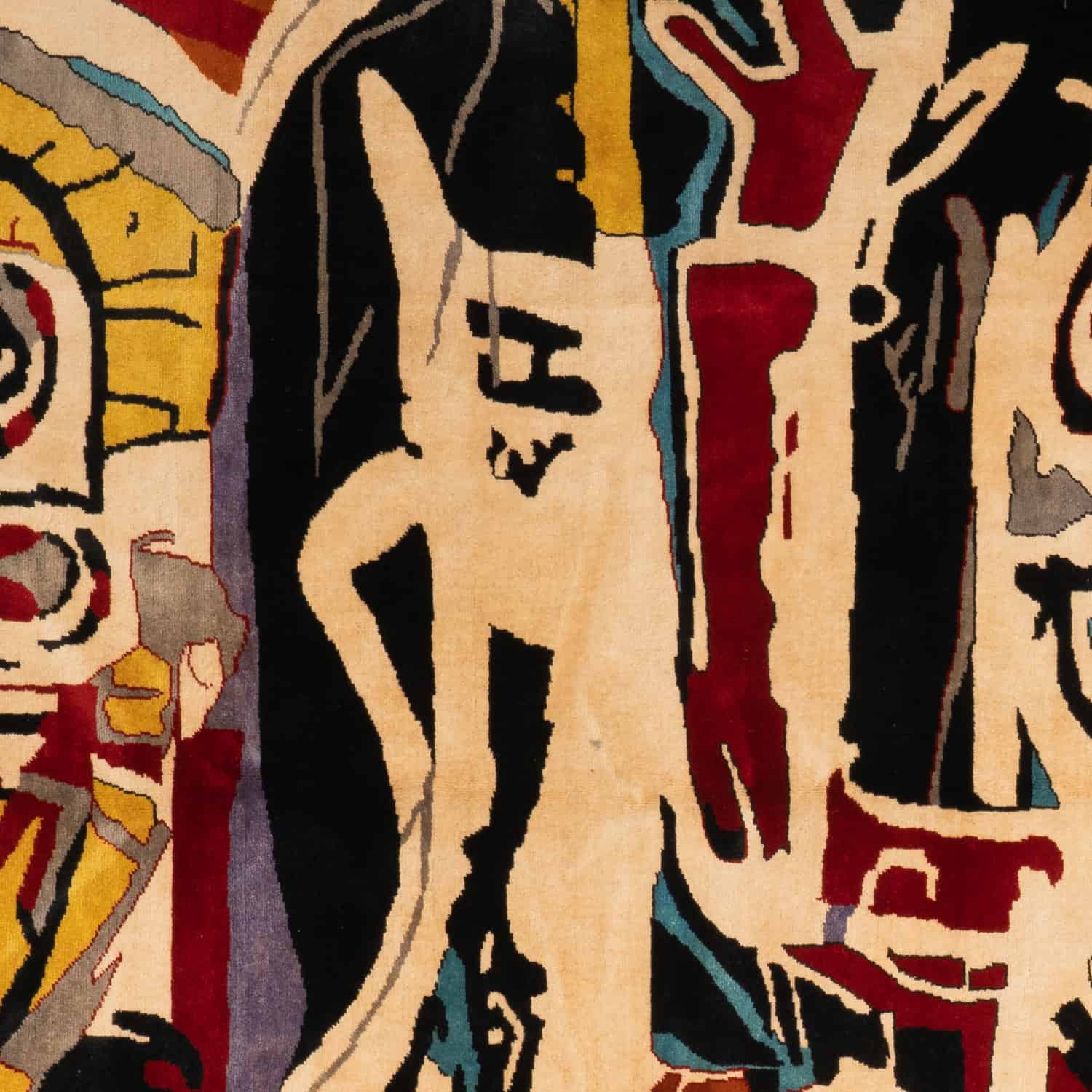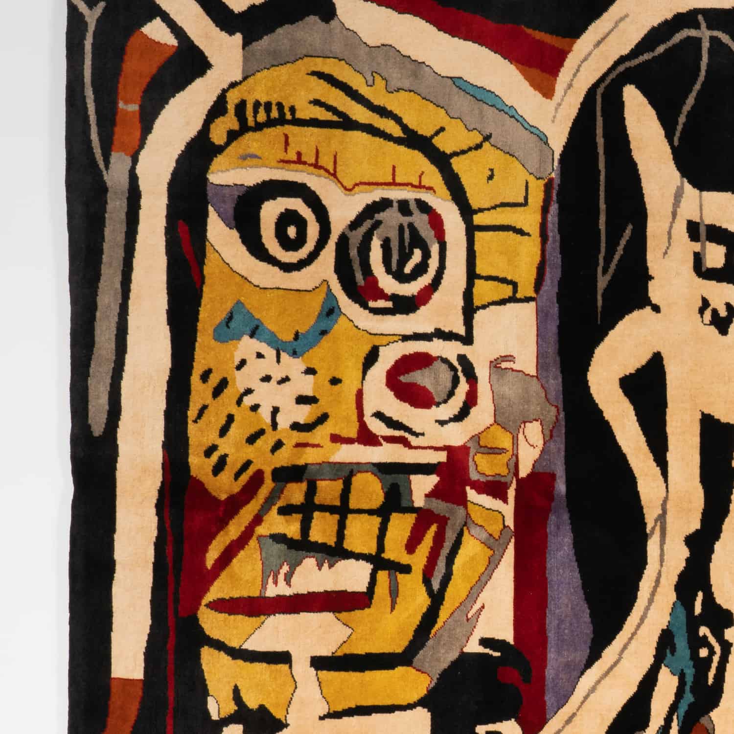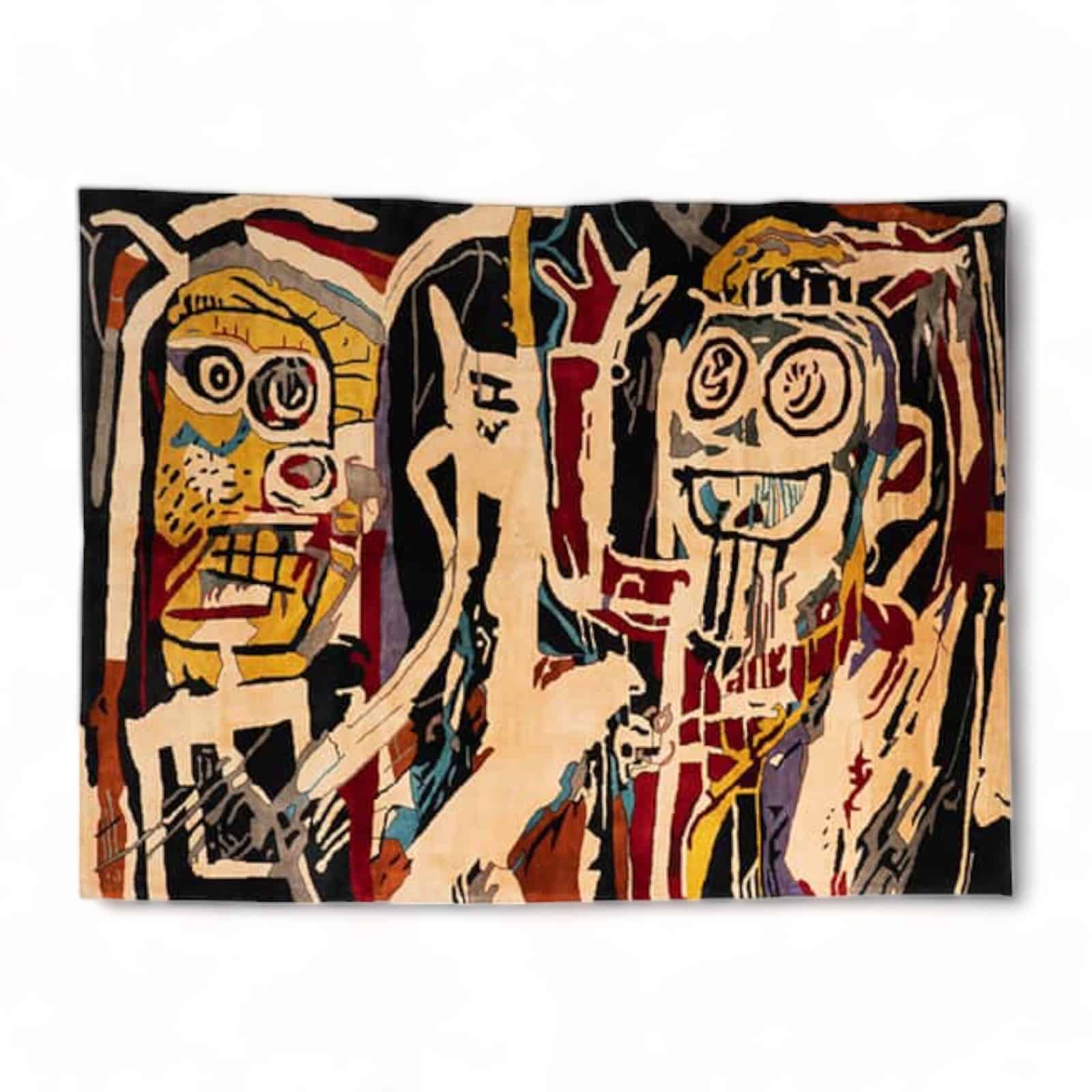 This contemporary Jean-Michel Basquiat inspired tapestry is a striking homage to the artist’s iconic work. It specifically refers to his piece titled “Têtes de poule” from 1982. Crafted with precision and artistic flair, this tapestry is hand-knotted using luxurious Merino wool. Its versatility allows you to use it as a unique floor covering or a captivating wall display. With a limited edition numbering of 2/8, it offers exclusivity and a touch of artistic sophistication to your environment. This wonderful piece of contemporary artwork is ready for your home.