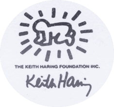 This Keith Haring Color Print features bold silkscreen artwork in a light oak frame. Keith Haring created expressive, graphic compositions that define this vibrant piece. This print carries the edition number 32/150. It includes the official stamp and embossed seal of the Keith Haring Foundation in the lower left corner. These details confirm authenticity and strengthen collector value.