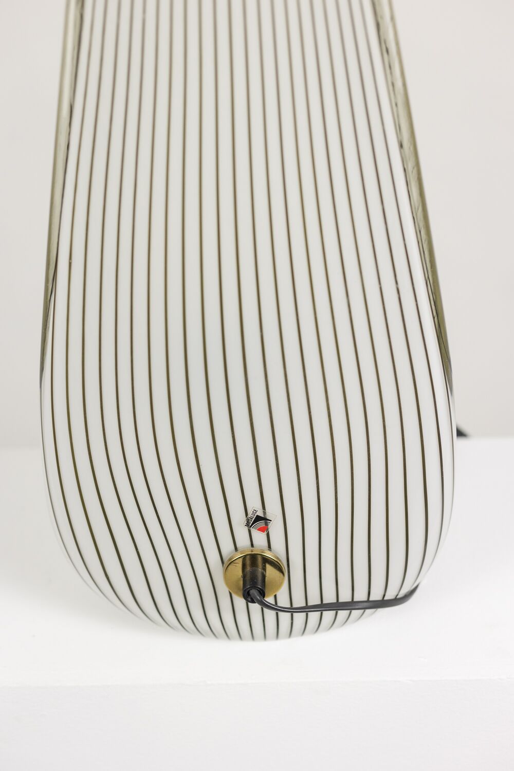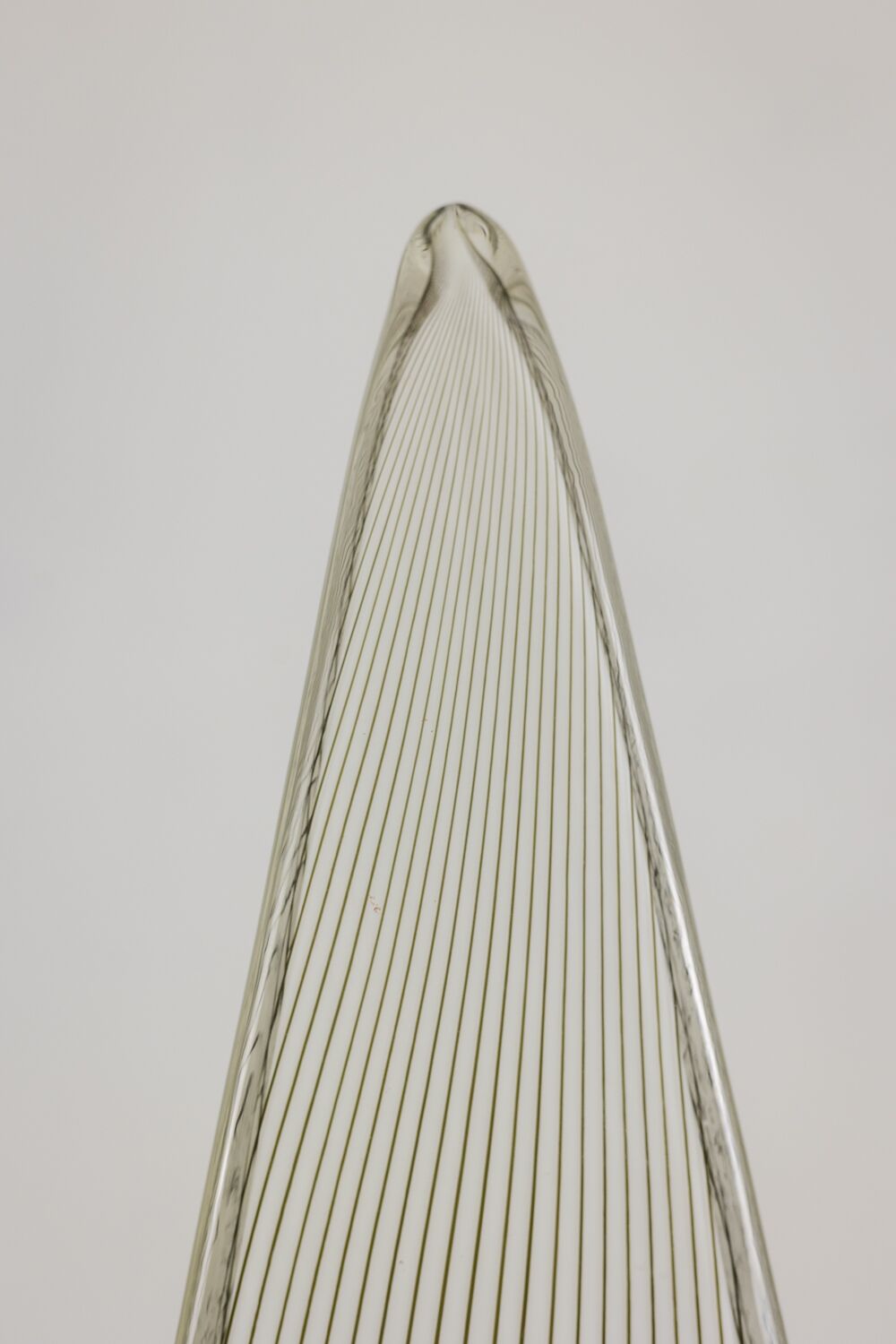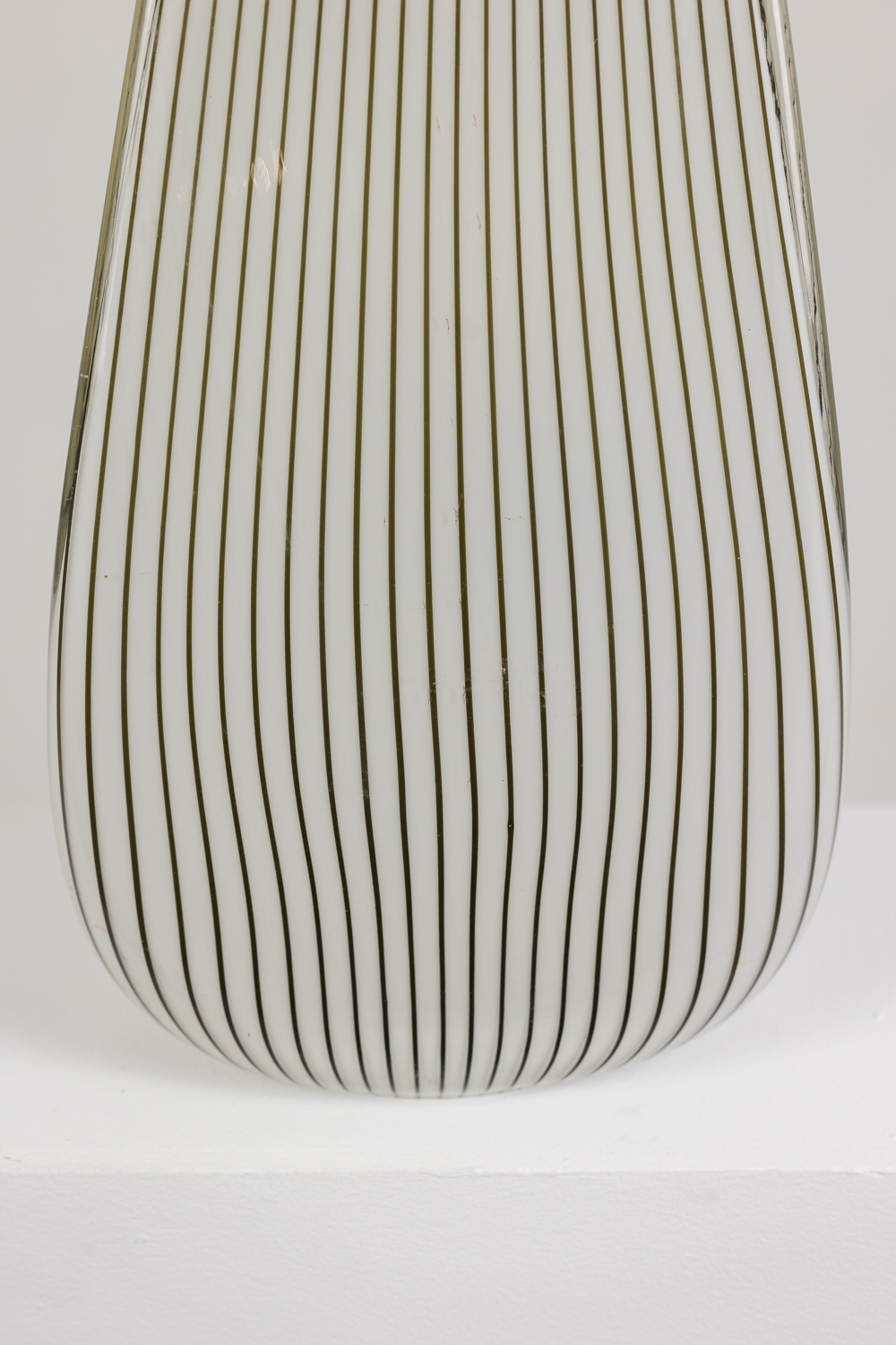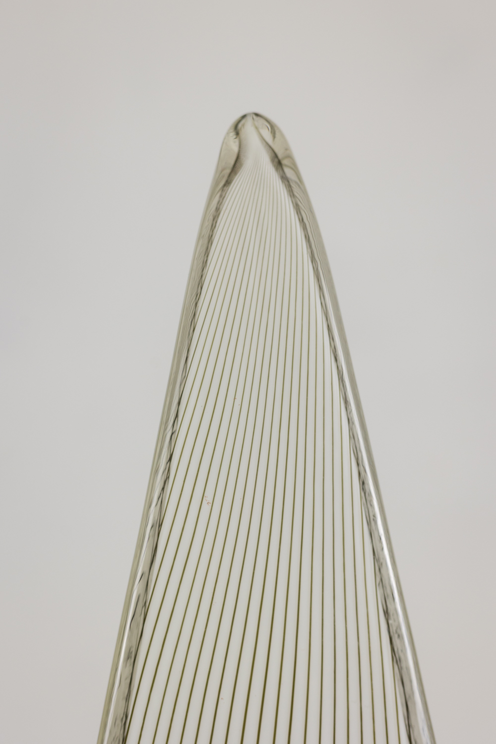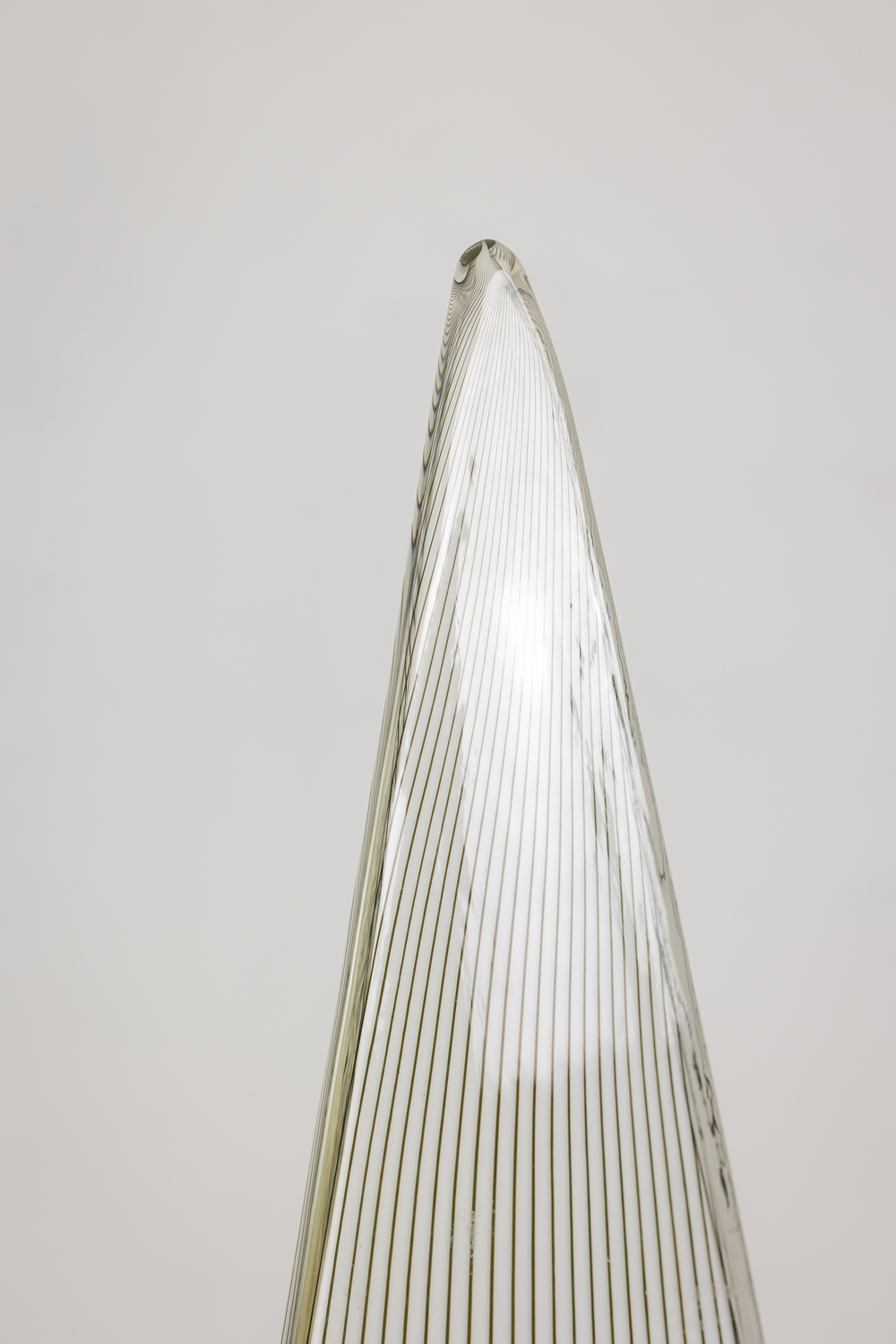 Discover this exceptional Lino Tagliapietra Cone Lamp, crafted in Murano glass during the 1970s. Lino Tagliapietra showcases his mastery of Venetian glassmaking in this striking design. This lamp features a refined cone shape with a white striped pattern. The Murano glass surface creates depth, rhythm, and visual movement. The elegant silhouette enhances modern and vintage interiors alike.