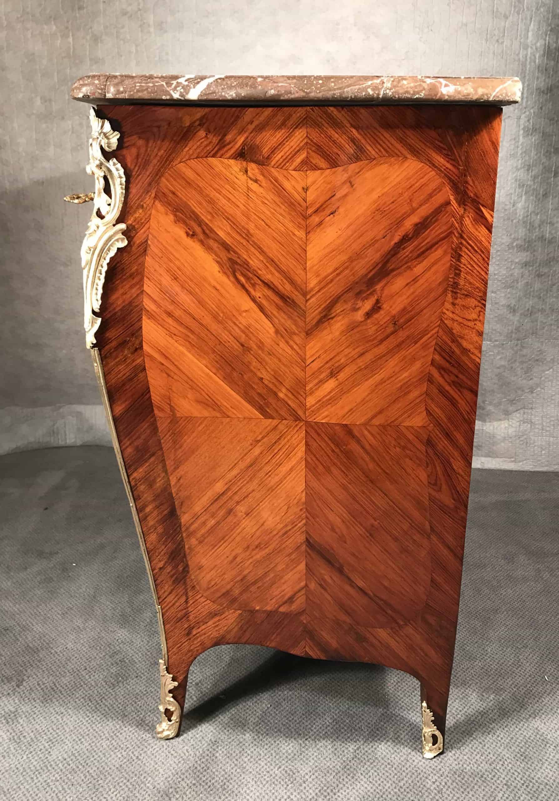 In our case the commode is divided by a total of four drawers, two larger ones on the lower part and two smaller ones on the top. It has its original marble top and the superb original bronze fittings, composed of acanthus leaves, flowers and rocailles.