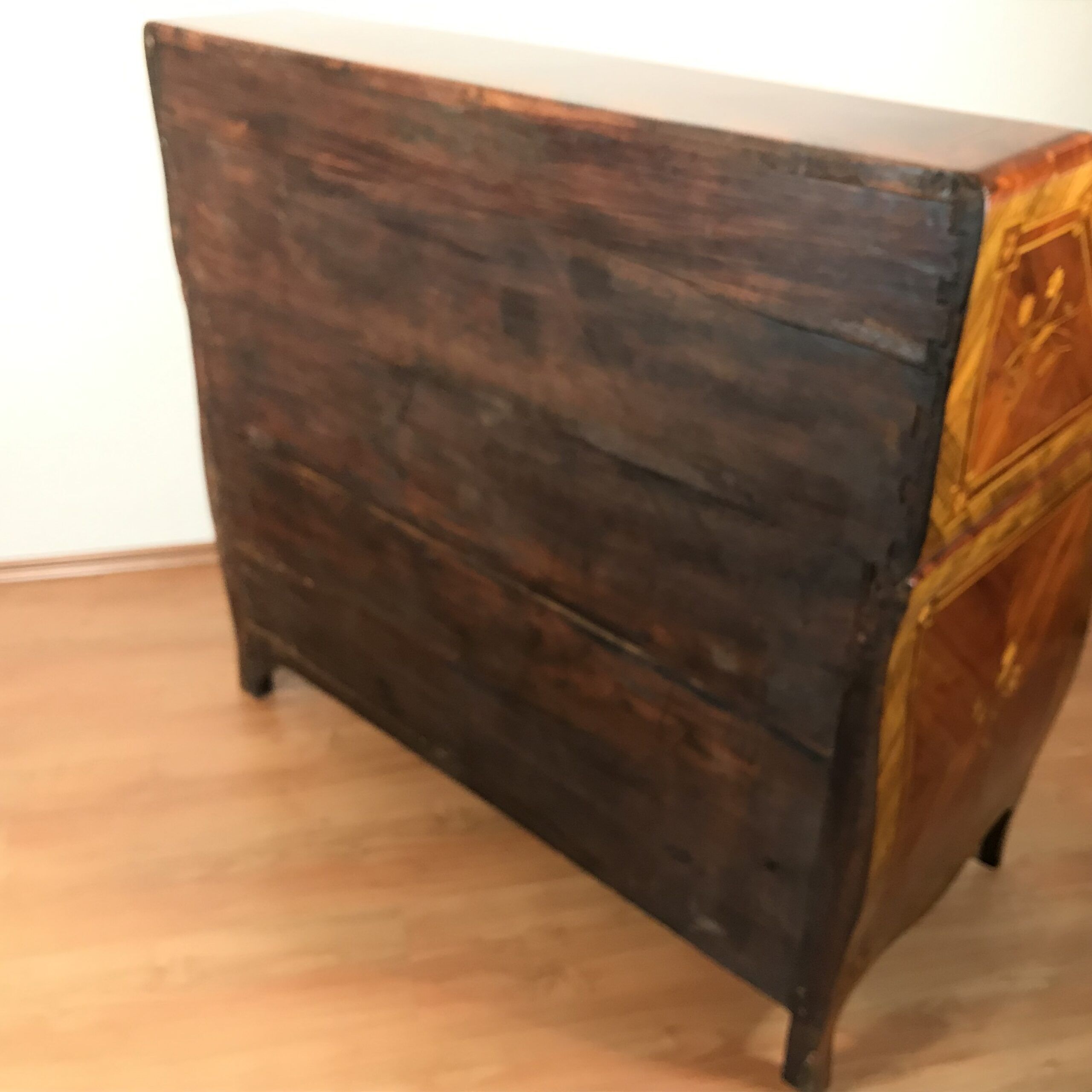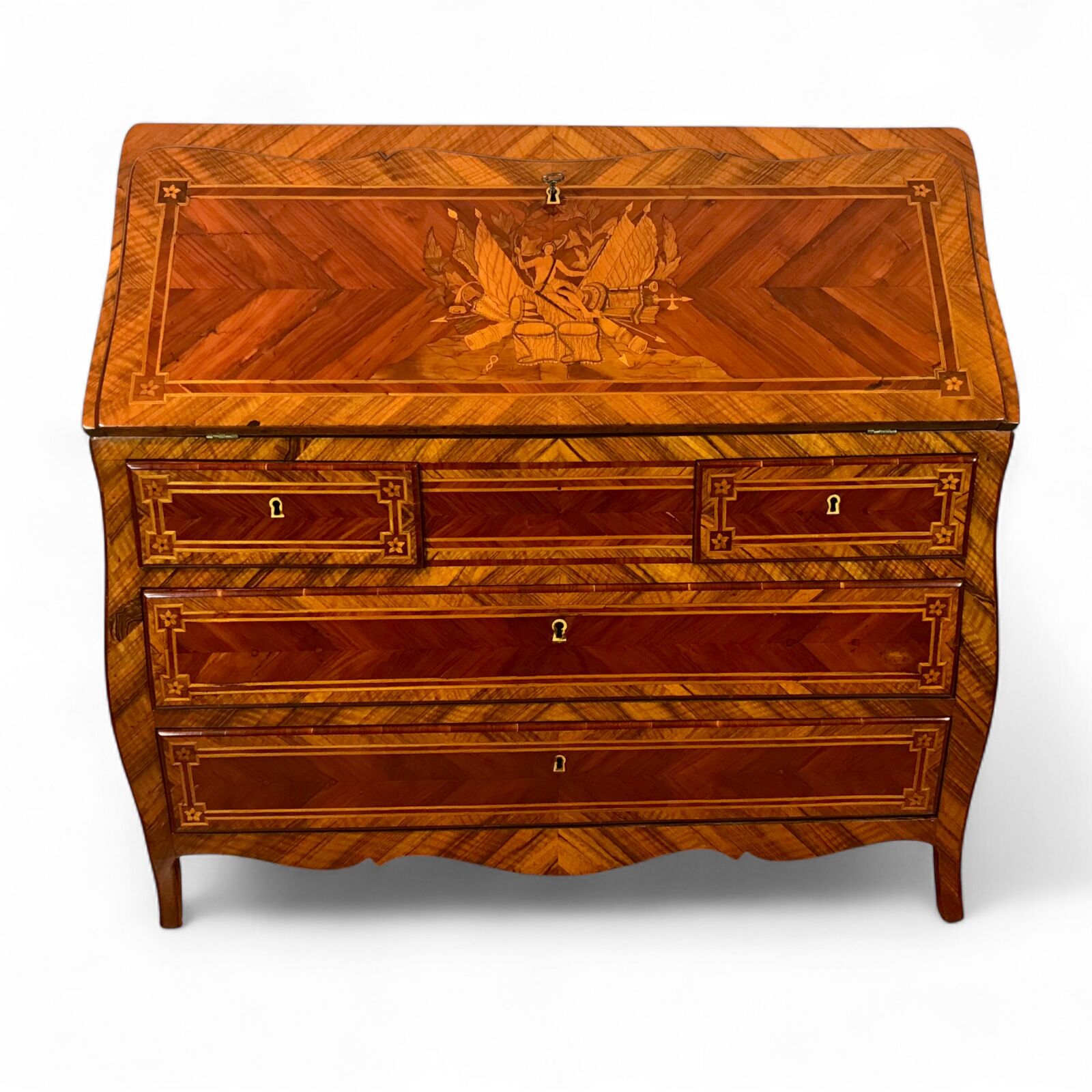 This exquisite Louis XV secretary desk, crafted in France around 1770, showcases the refined artistry of the 18th century Rococo period. The piece is veneered in beautiful kingwood and features intricate marquetry and inlay work, typical of the elegant craftsmanship of Louis XV furniture.
