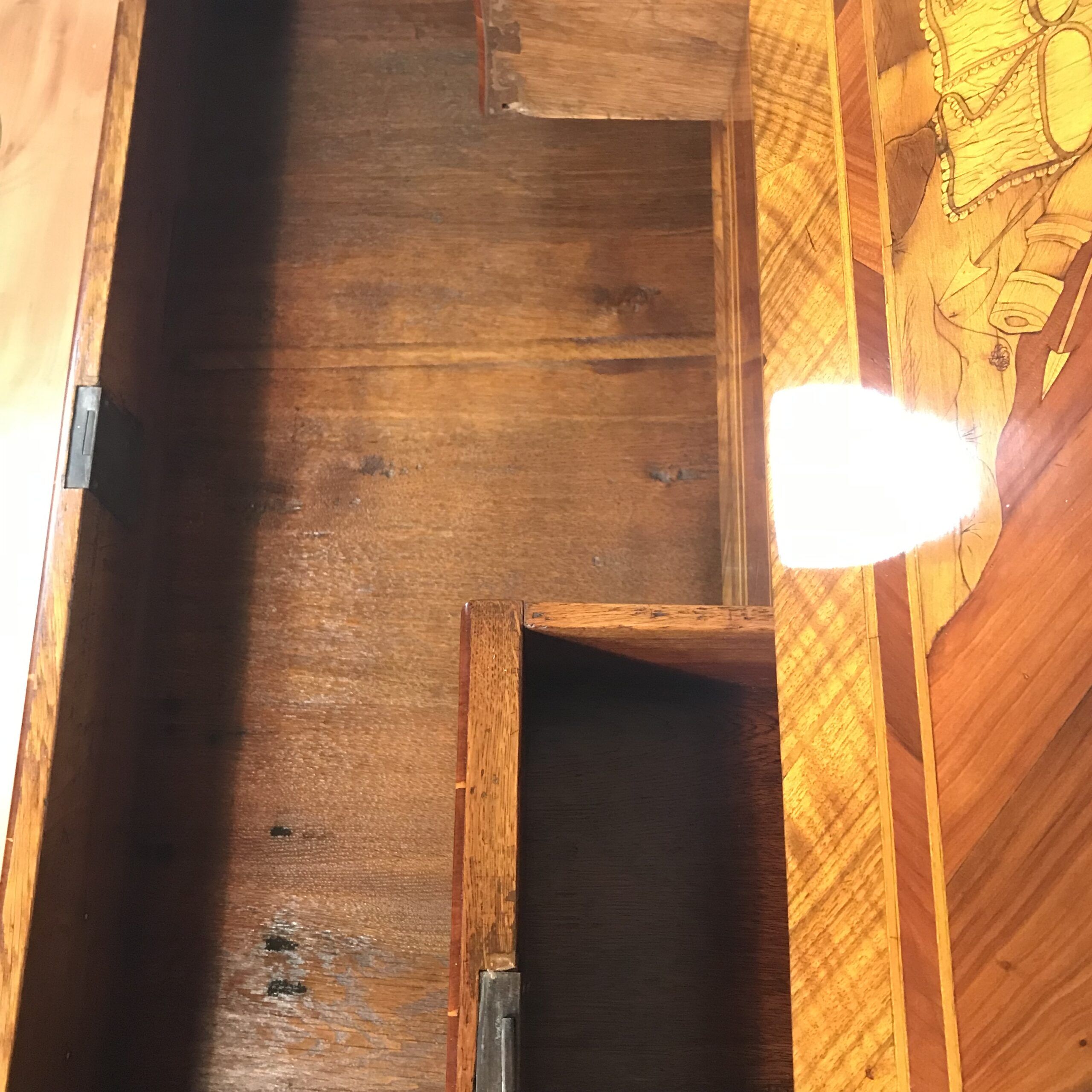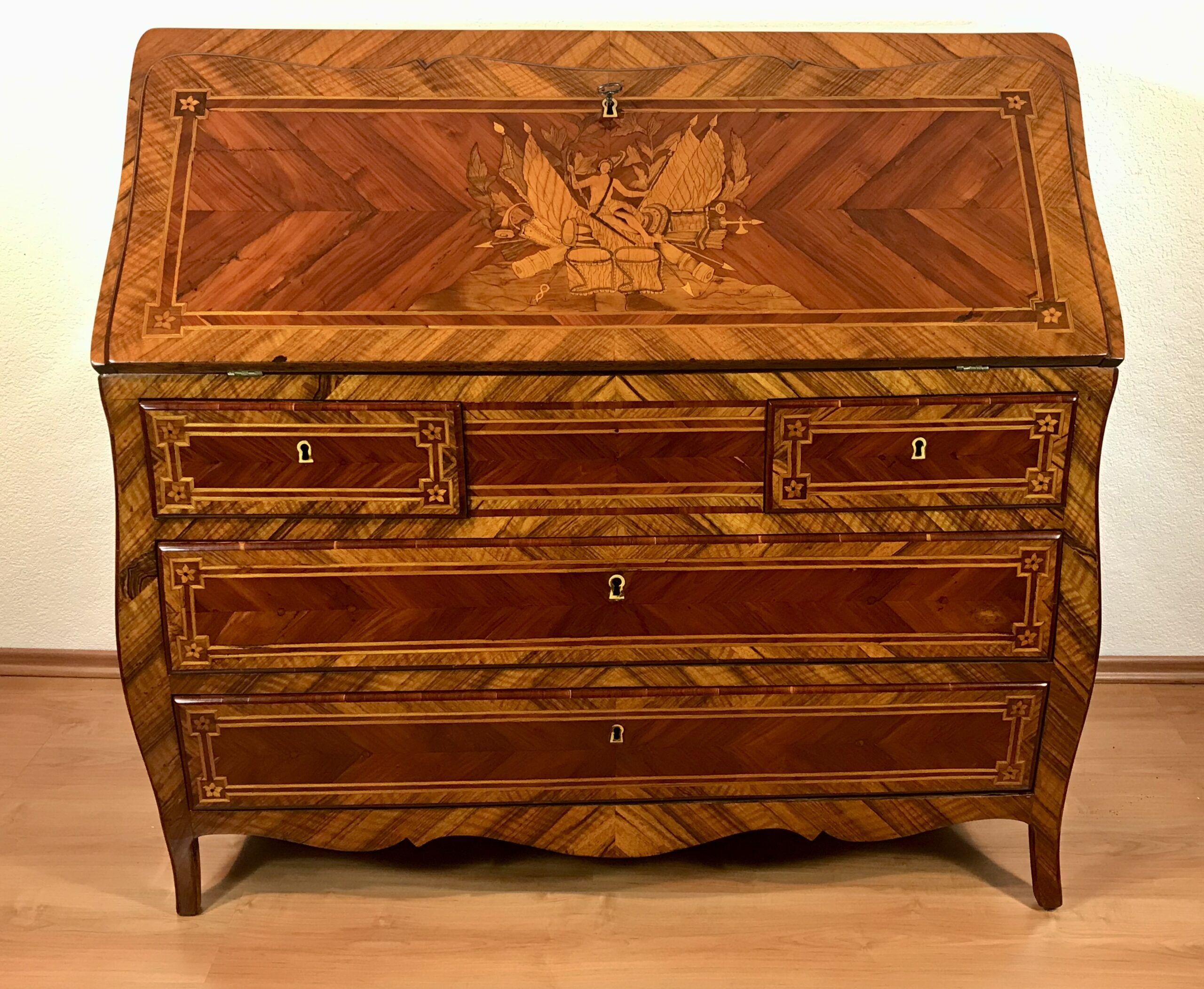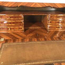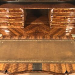 >>The slanted writing flap reveals a spacious interior fitted with a leather-lined writing surface, six small drawers, open compartments, and even a hidden secret compartment—a hallmark of fine 18th-century cabinetmaking. Below, the desk includes four drawers offering generous storage.