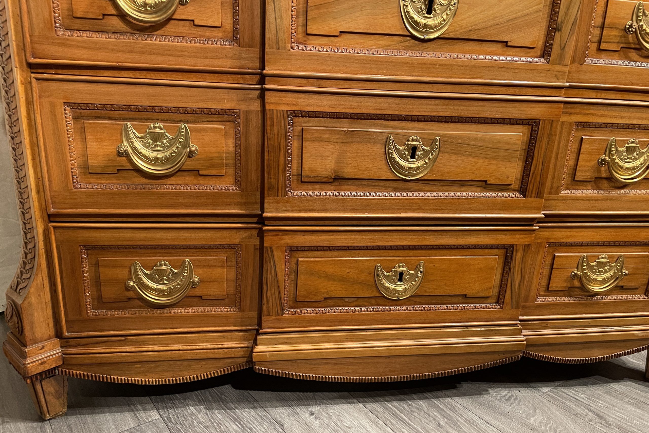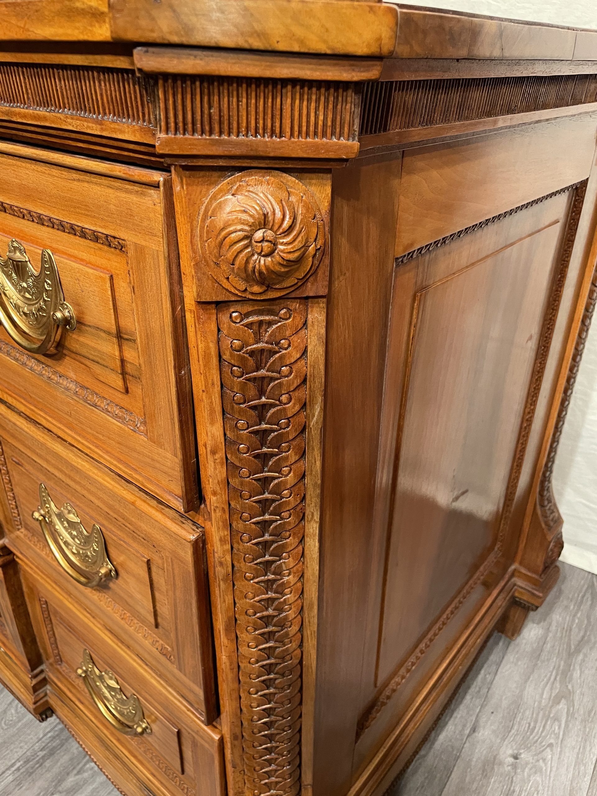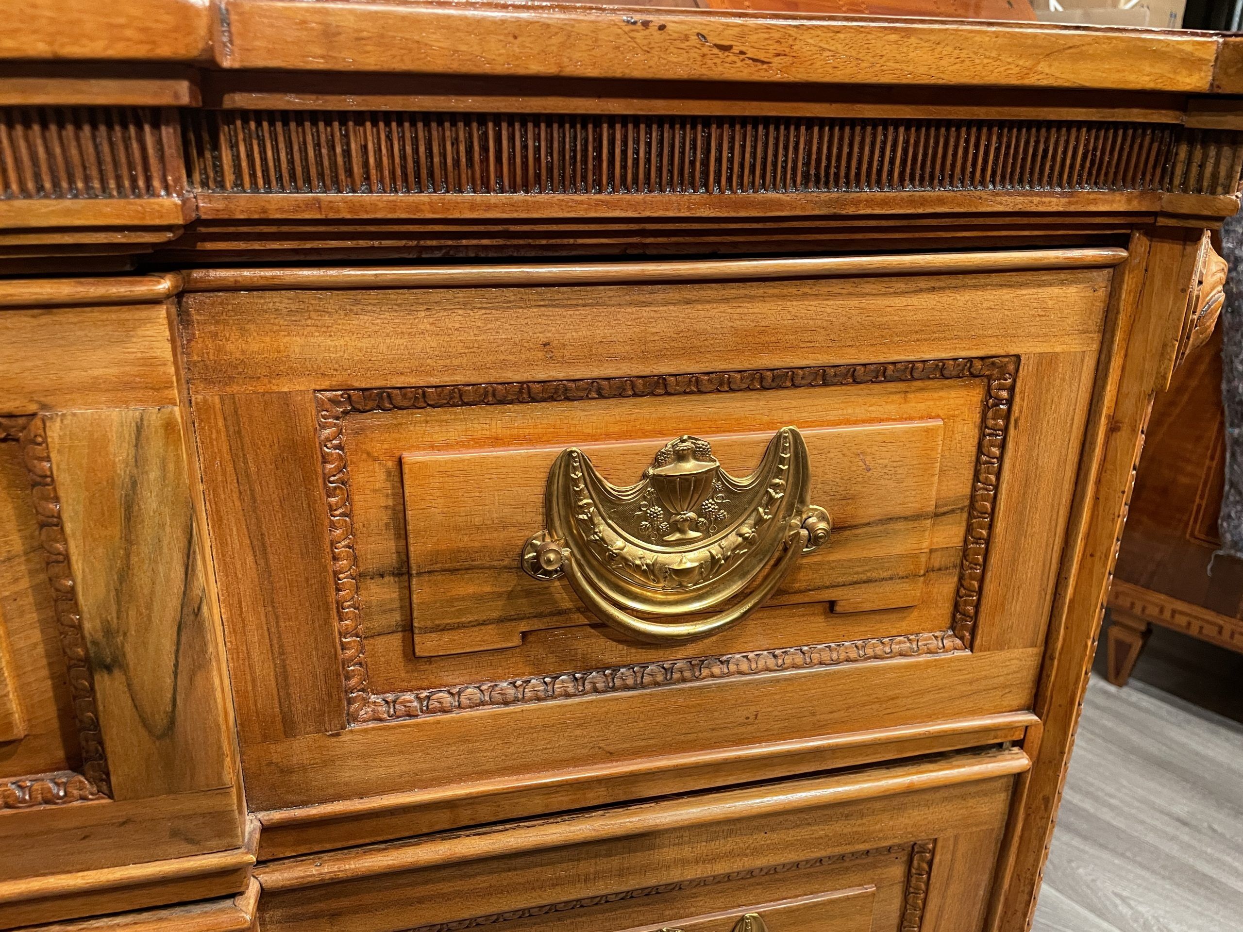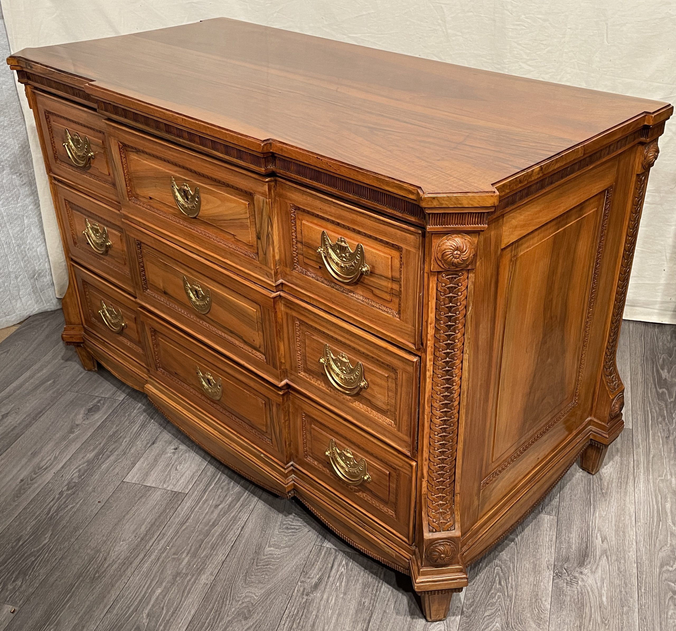 This chest of drawers is a gorgeous original piece of the 18th century. Hand carved fine neoclassical decorations embellish the solid walnut dresser. It is a typical piece of the Electoral Palatinate region in Germany and was probably made in the area of Mannheim or Heidelberg. The three drawer commode is in very good original condition. The brass fittings have been replaced at one point.