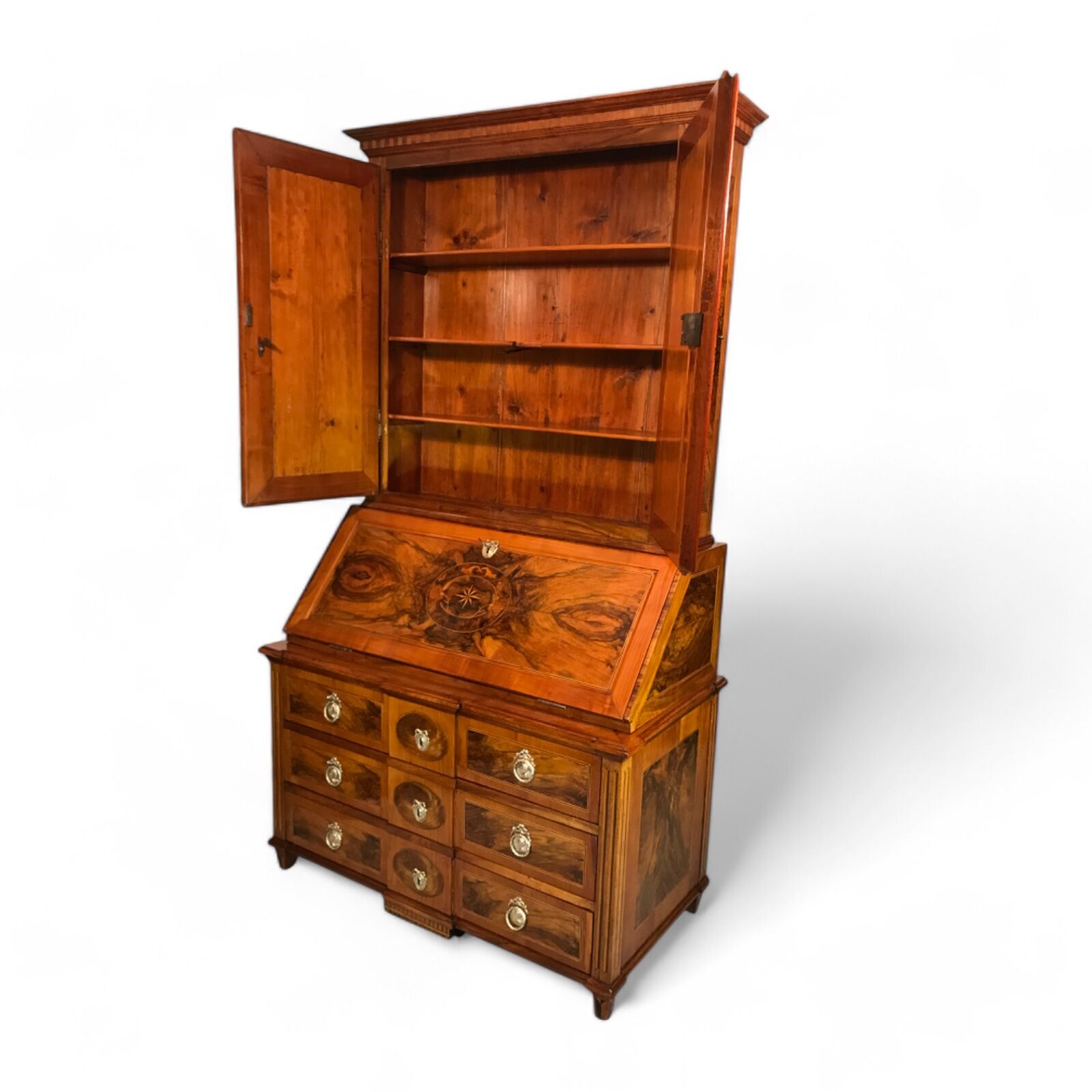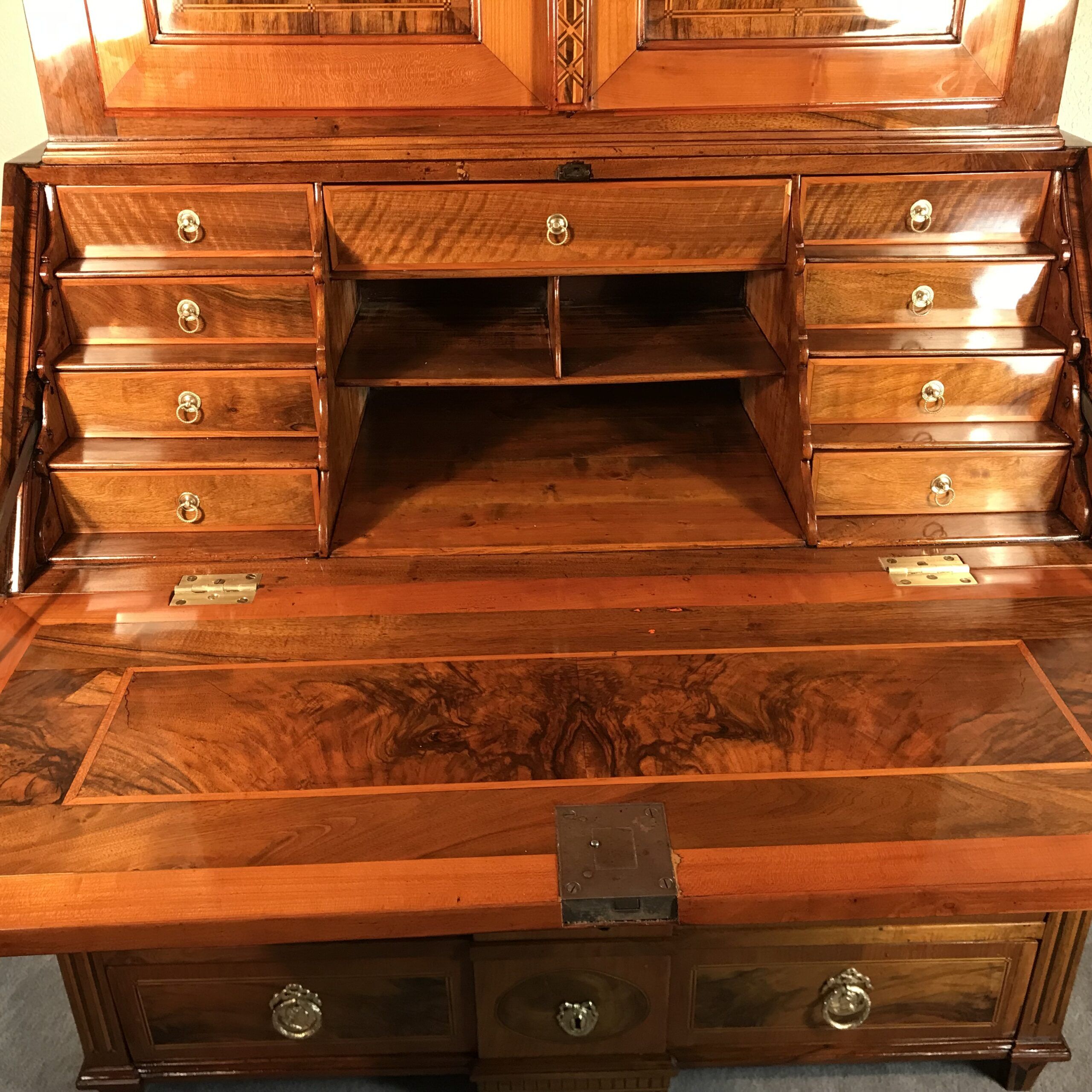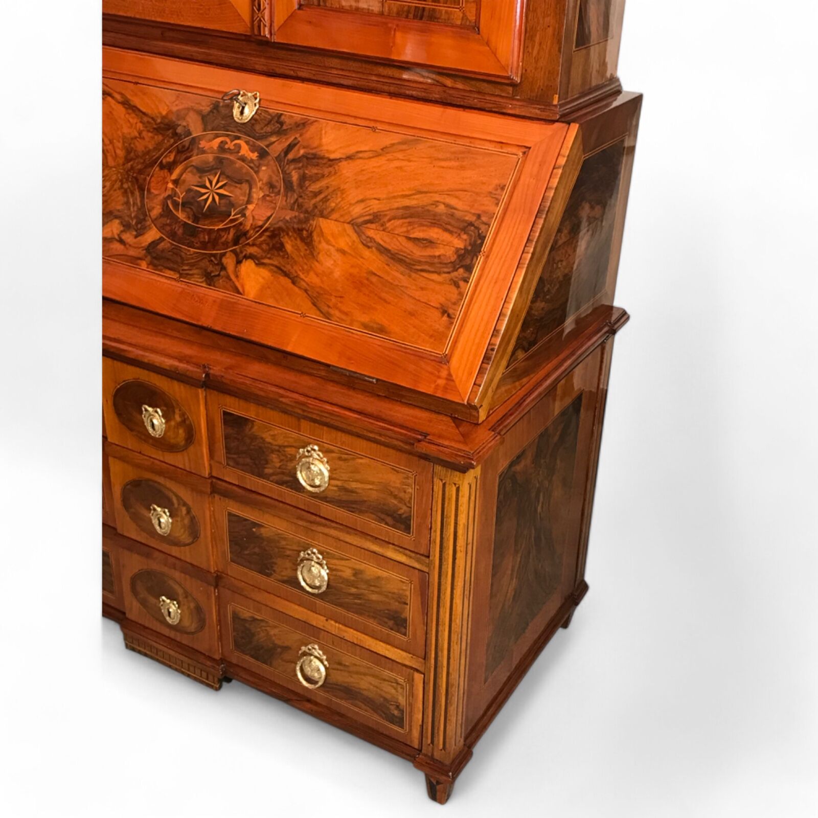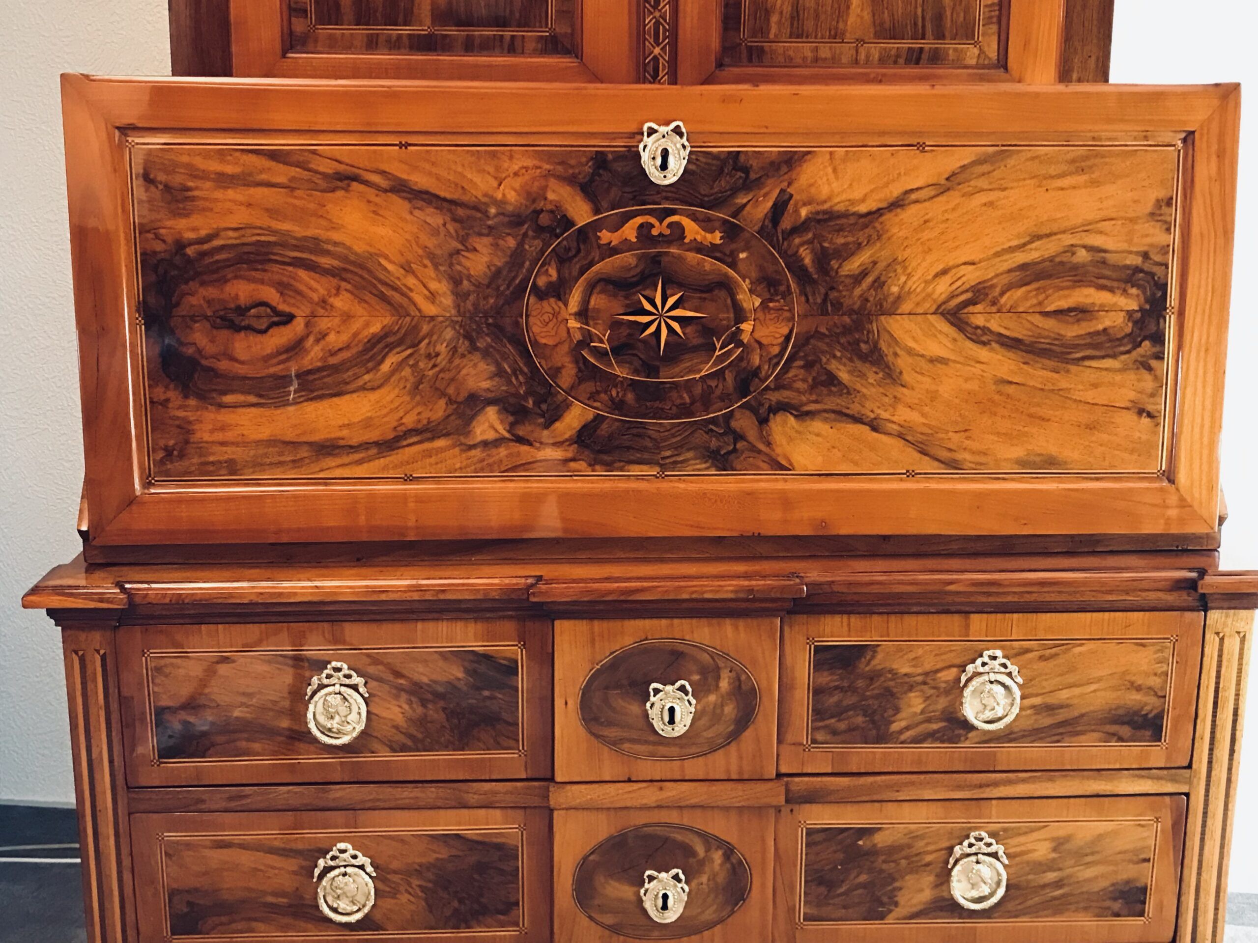 Middle Section: A writing flap adorned with stunning walnut root veneer and a central medallion featuring star marquetry, framed by floral and acanthus leaf motifs.