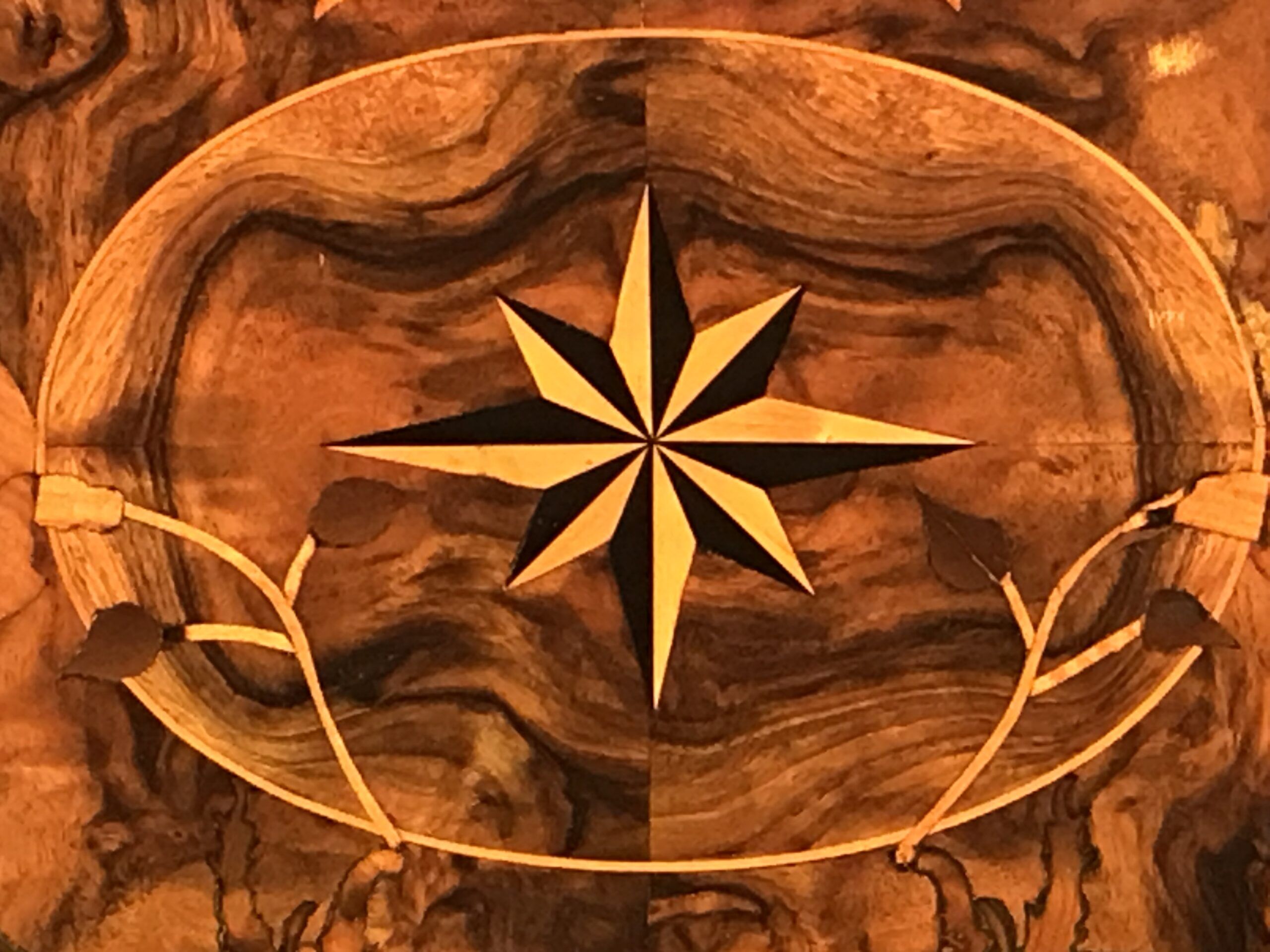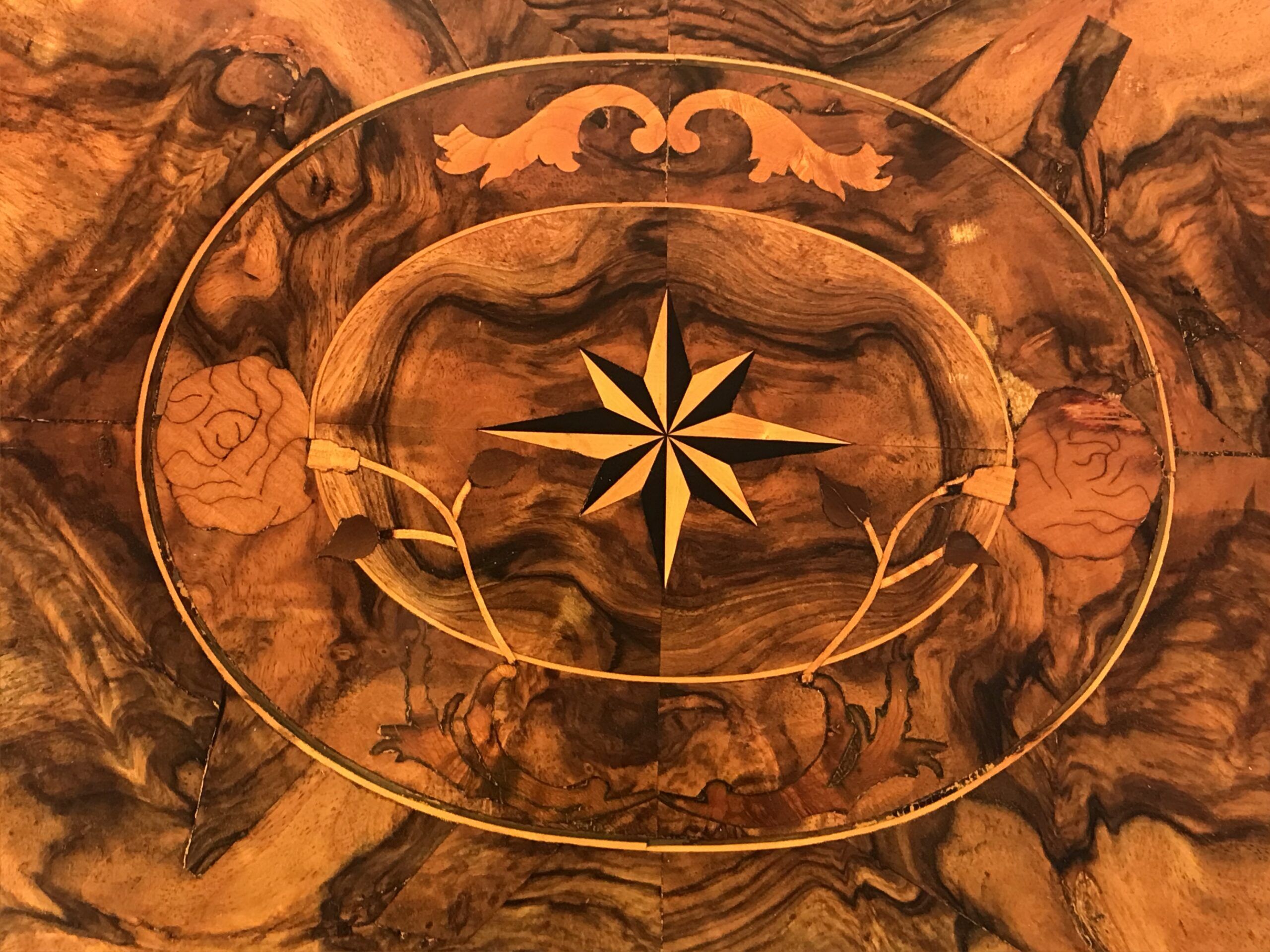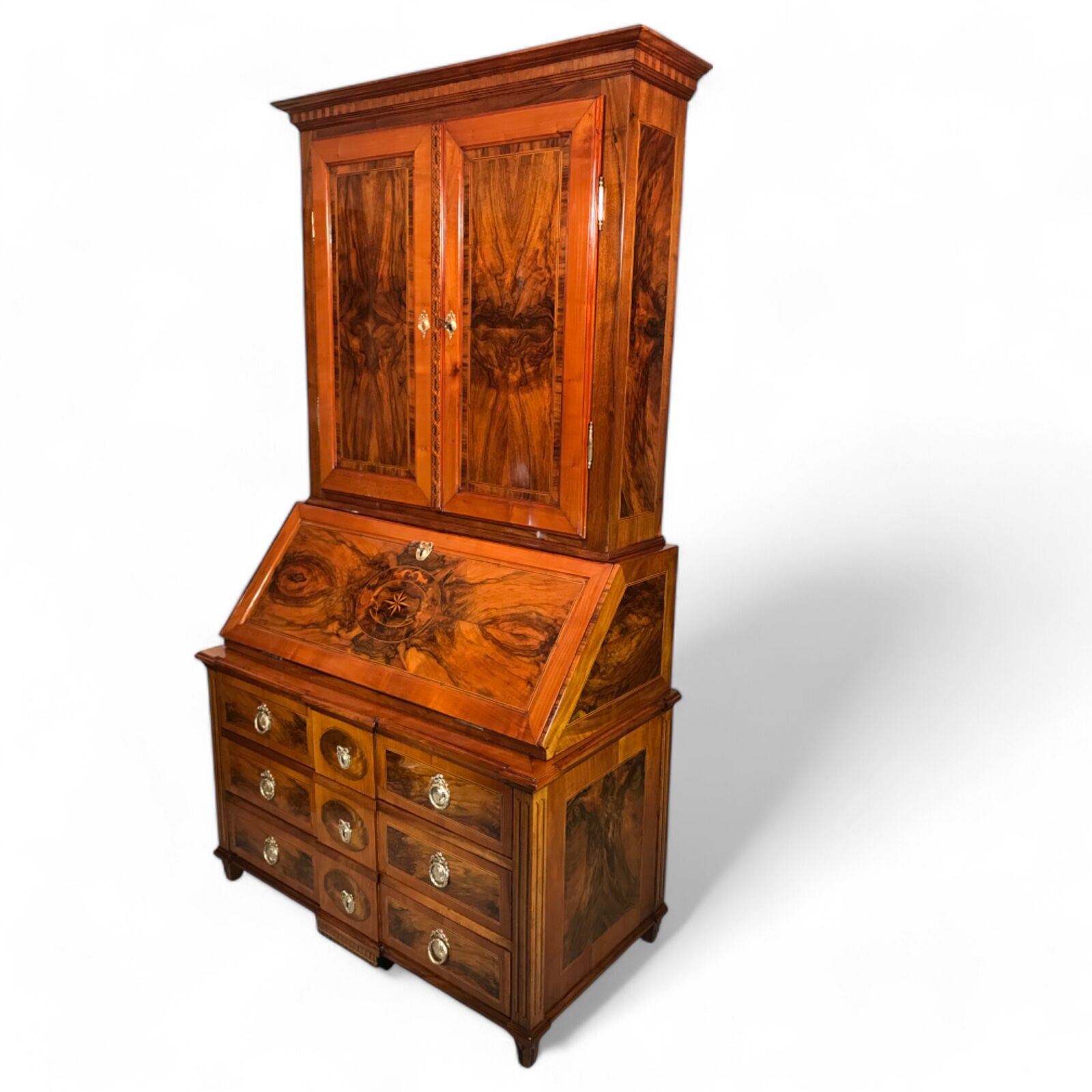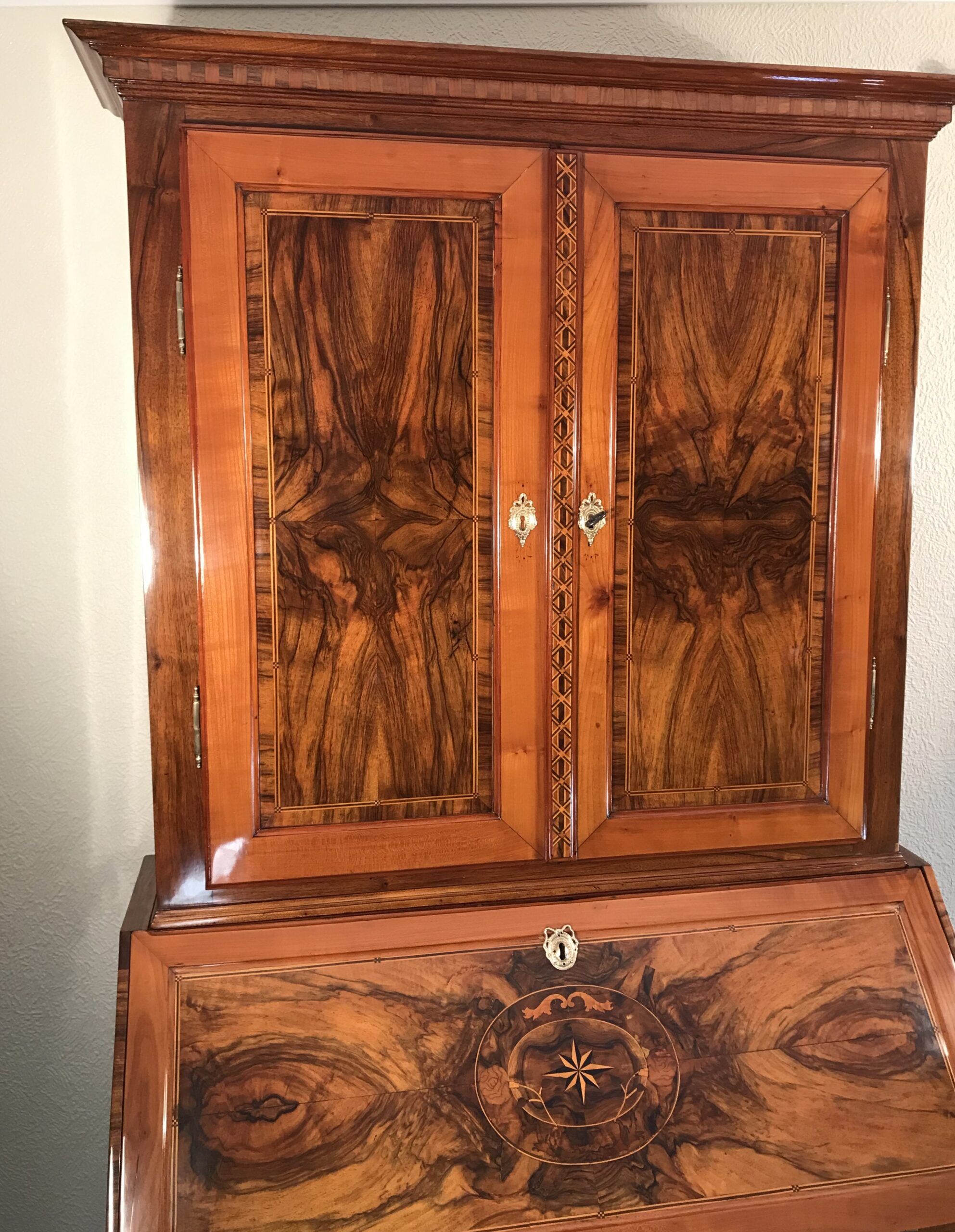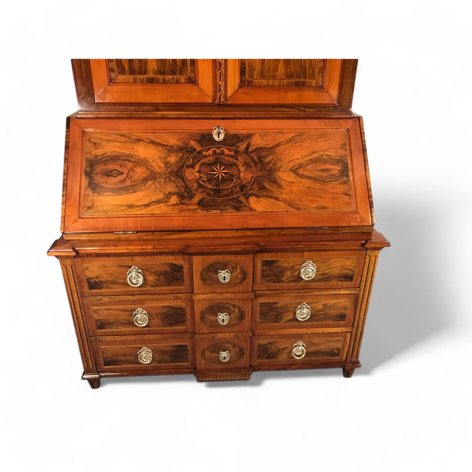 Middle Section: A writing flap adorned with stunning walnut root veneer and a central medallion featuring star marquetry, framed by floral and acanthus leaf motifs.