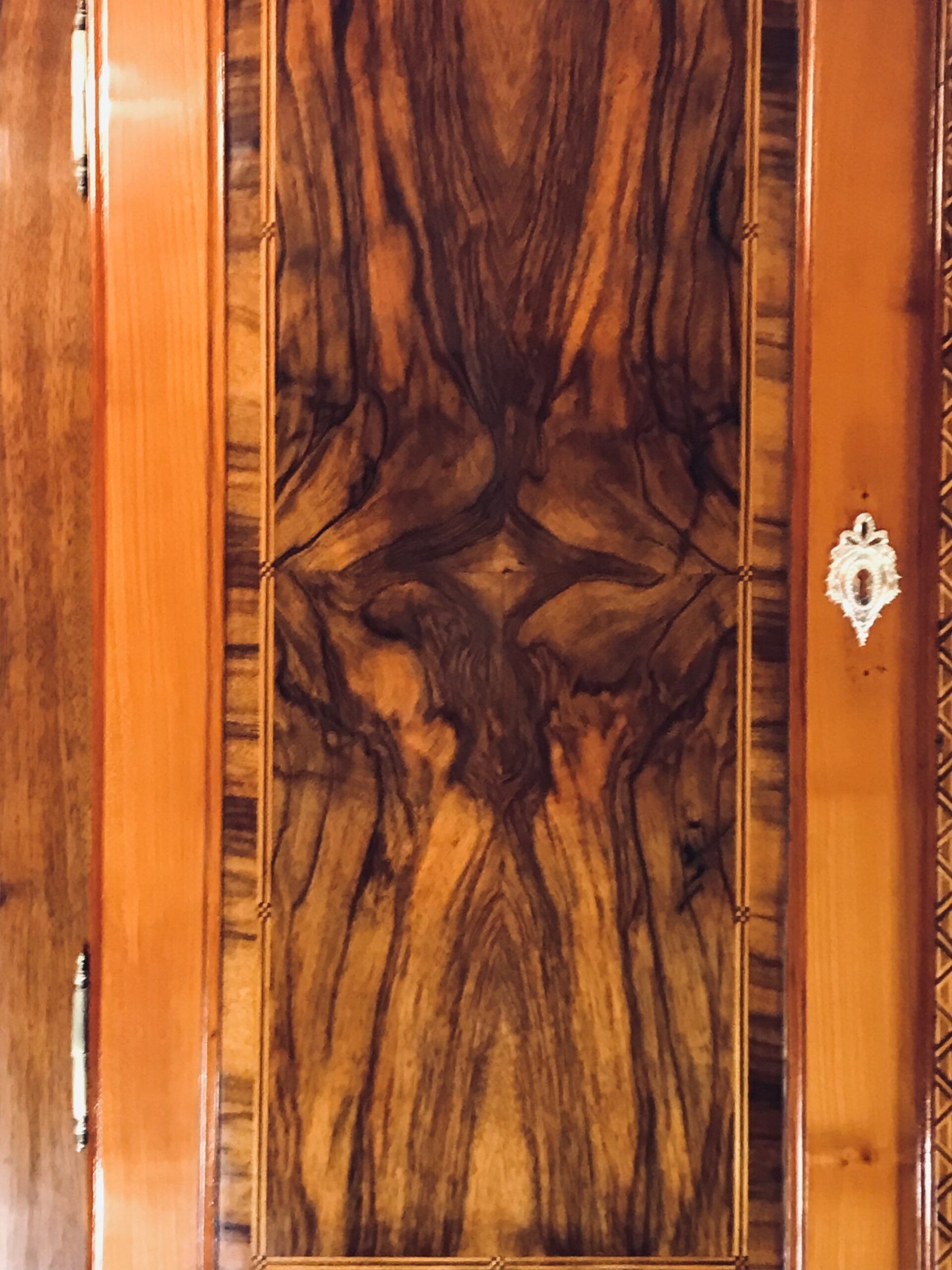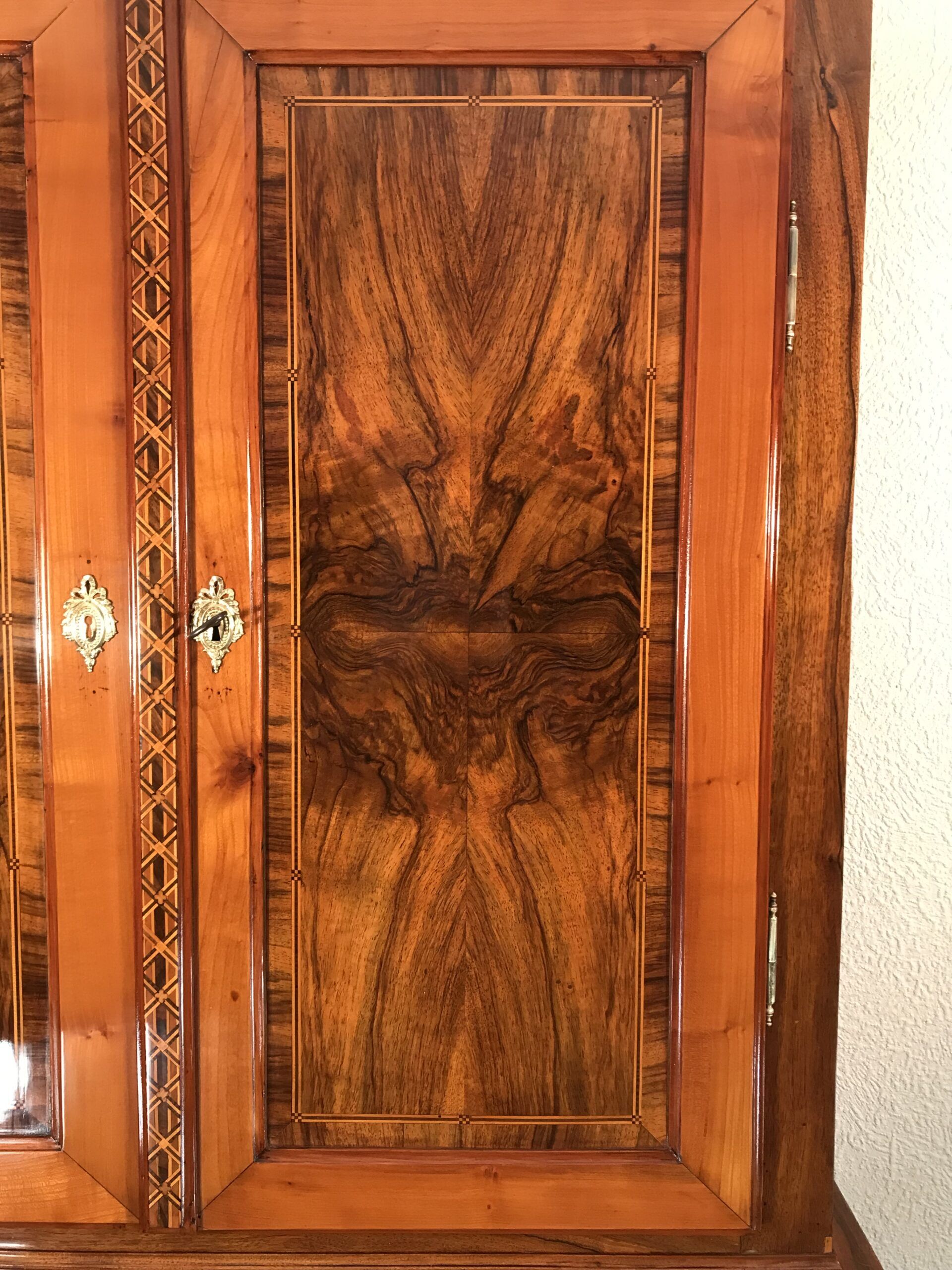 Upper Section: Two doors with book-matched walnut veneer framed by cherry veneer. The mullion boasts geometric marquetry, opening to reveal three functional shelves.