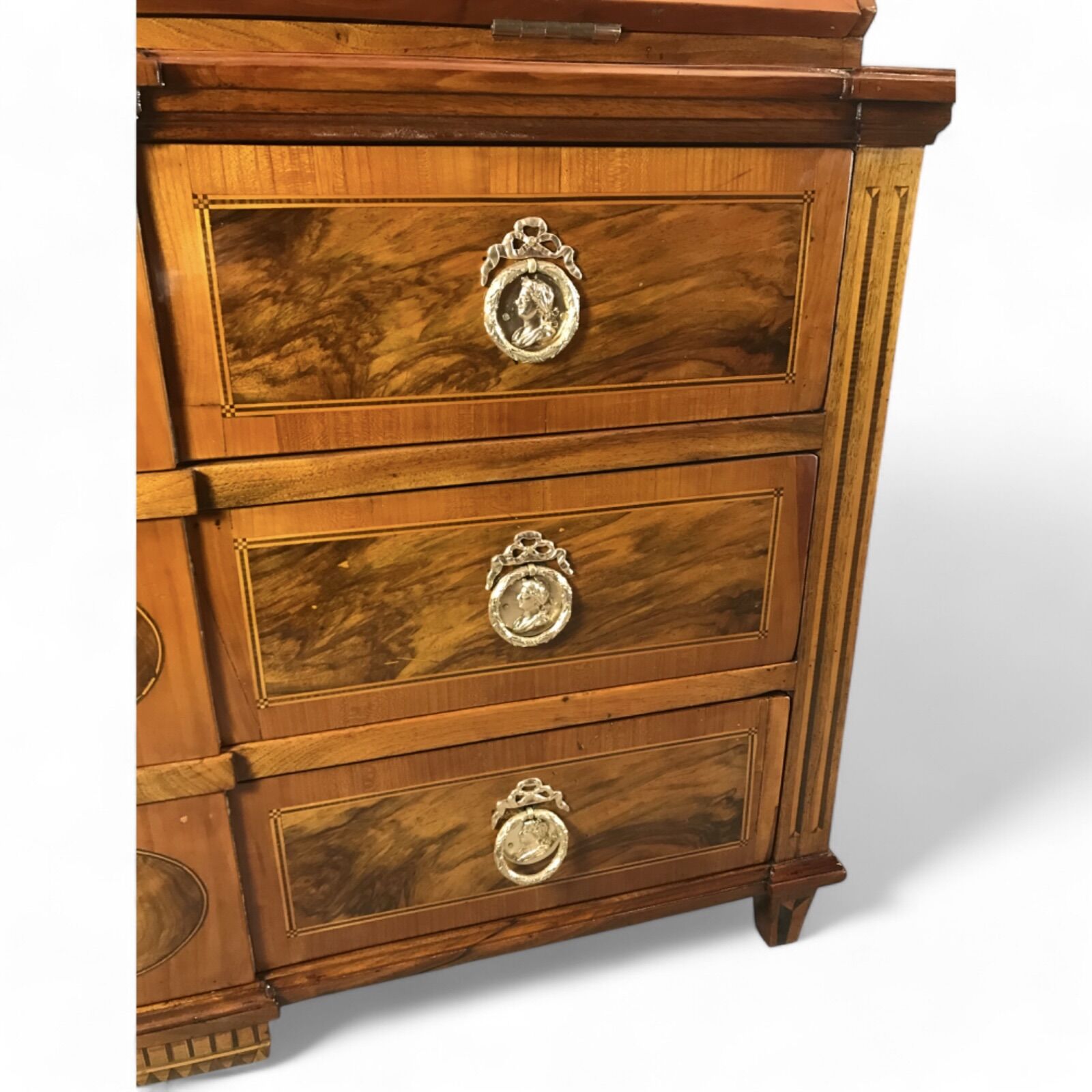 Lower Section: Three spacious drawers, supported by carved fluted feet in classic Louis XVI design.