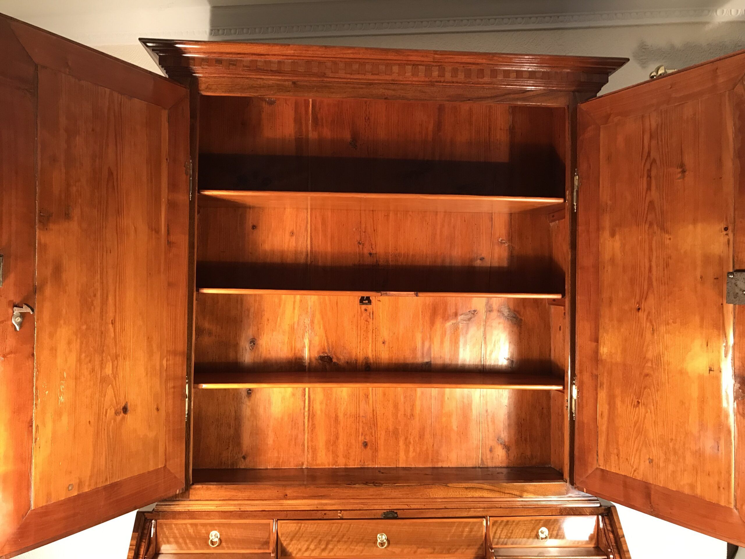 Expertly refinished in Germany, this antique secretary cabinet is in excellent condition.
