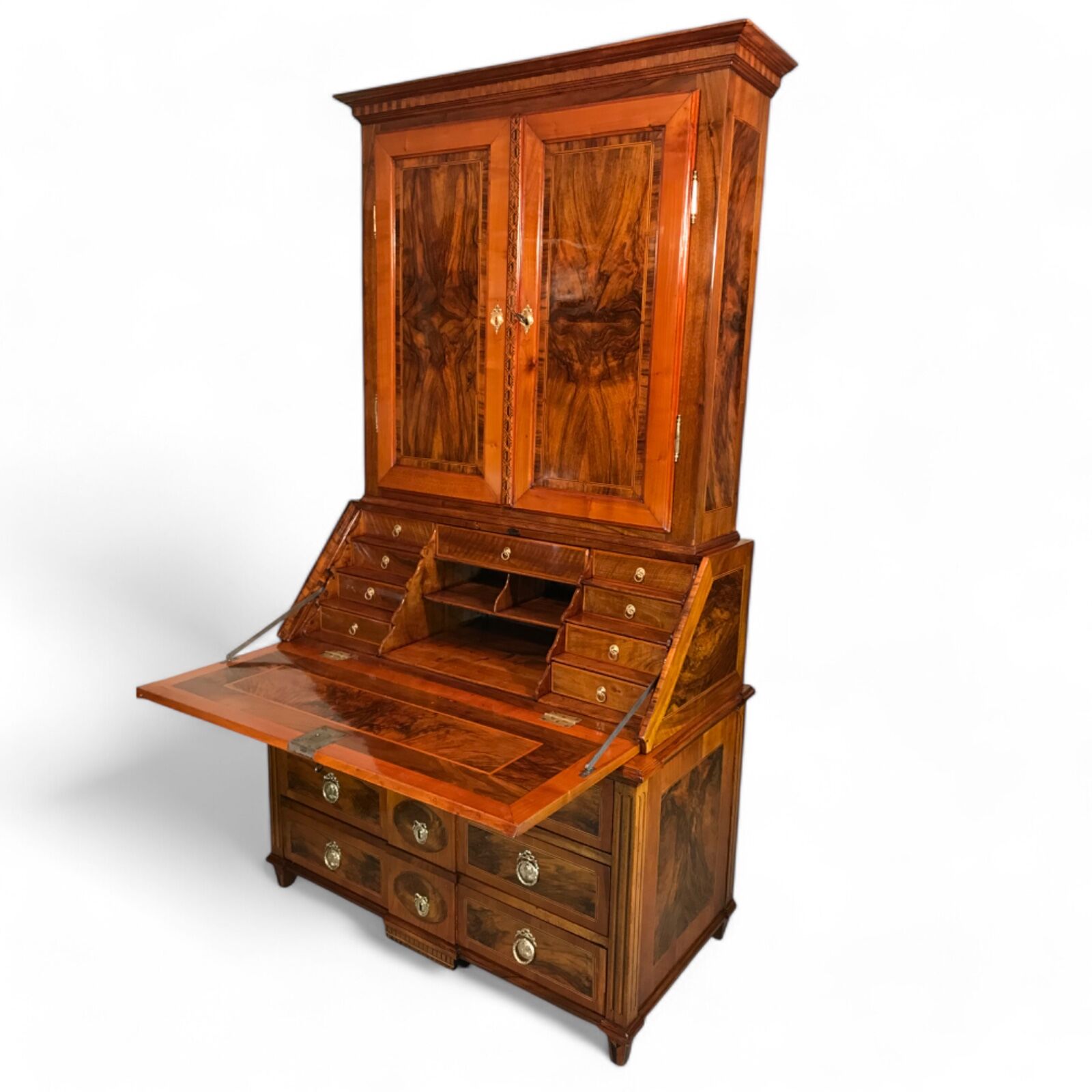 This remarkable Louis XVI secretary cabinet, crafted in South Germany around 1780, showcases a sophisticated blend of walnut, walnut root, and cherry veneer, enhanced with intricate marquetry.