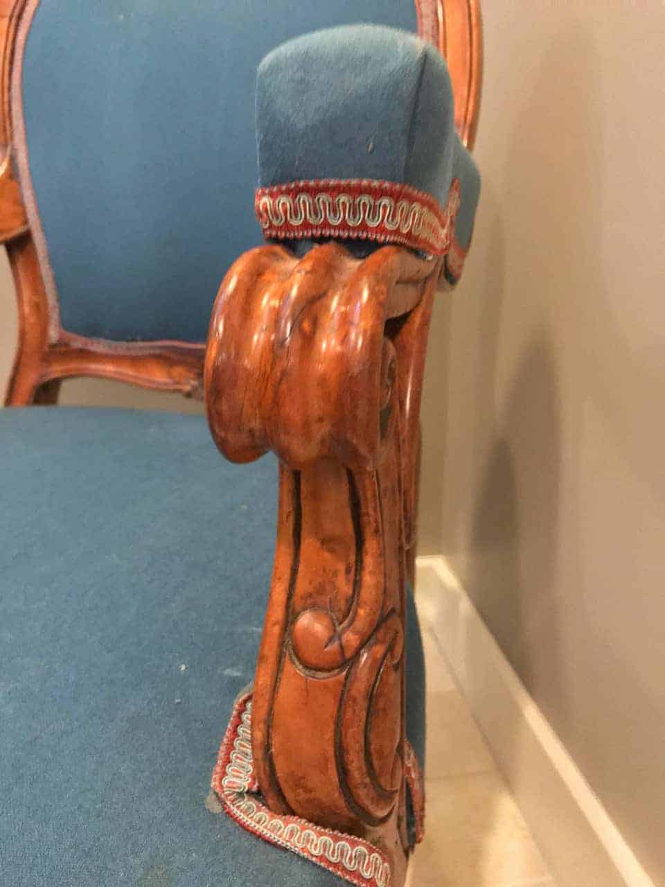 Characteristics of the Rococo or Louis XV revival pieces included: embellished and elaborate carving. Rich carvings of floral and fruit motifs decorated the curved frames.