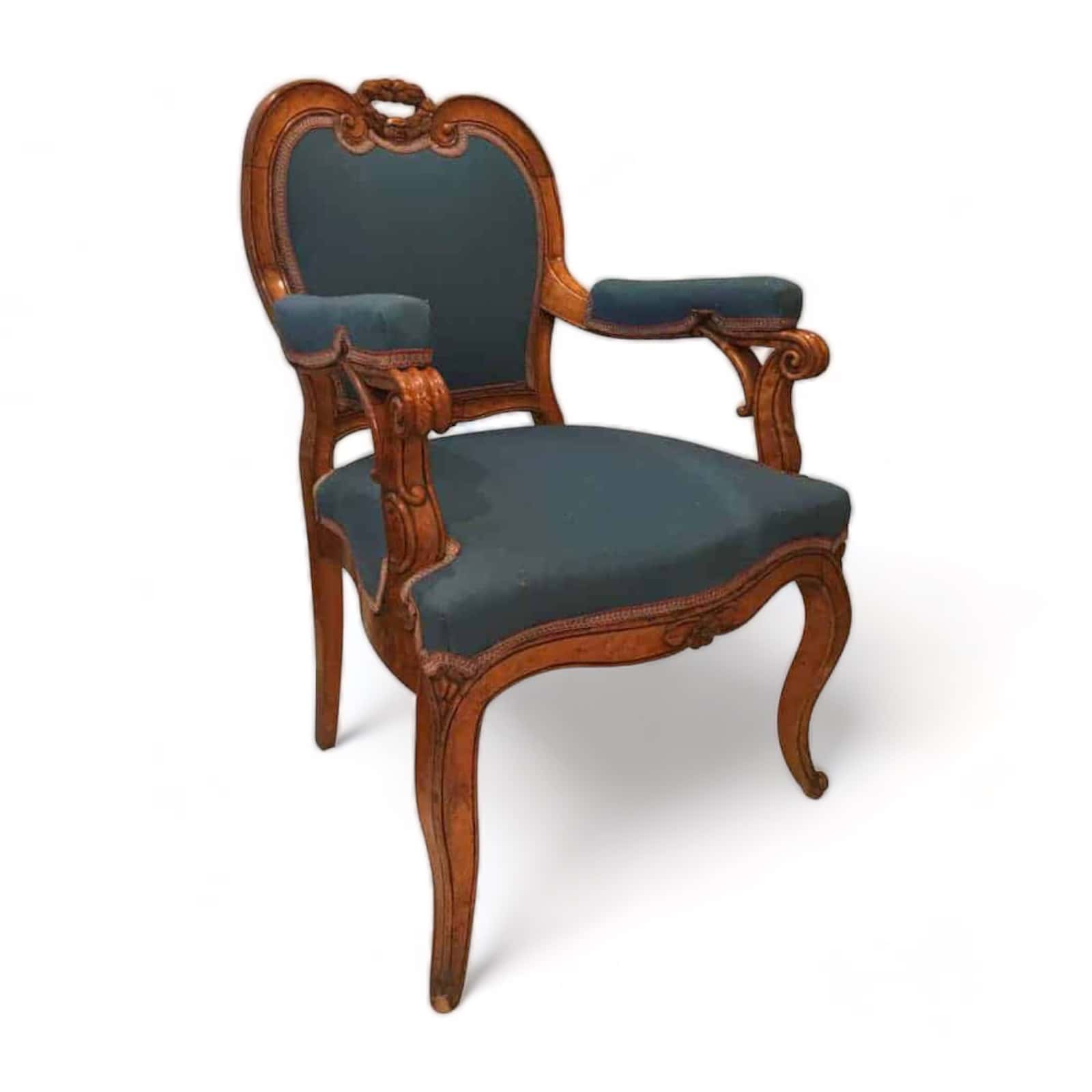 The Louis XV armchair has a relatively new upholstery and is comfortable. The fabric shows some wear and tear but is still usable.