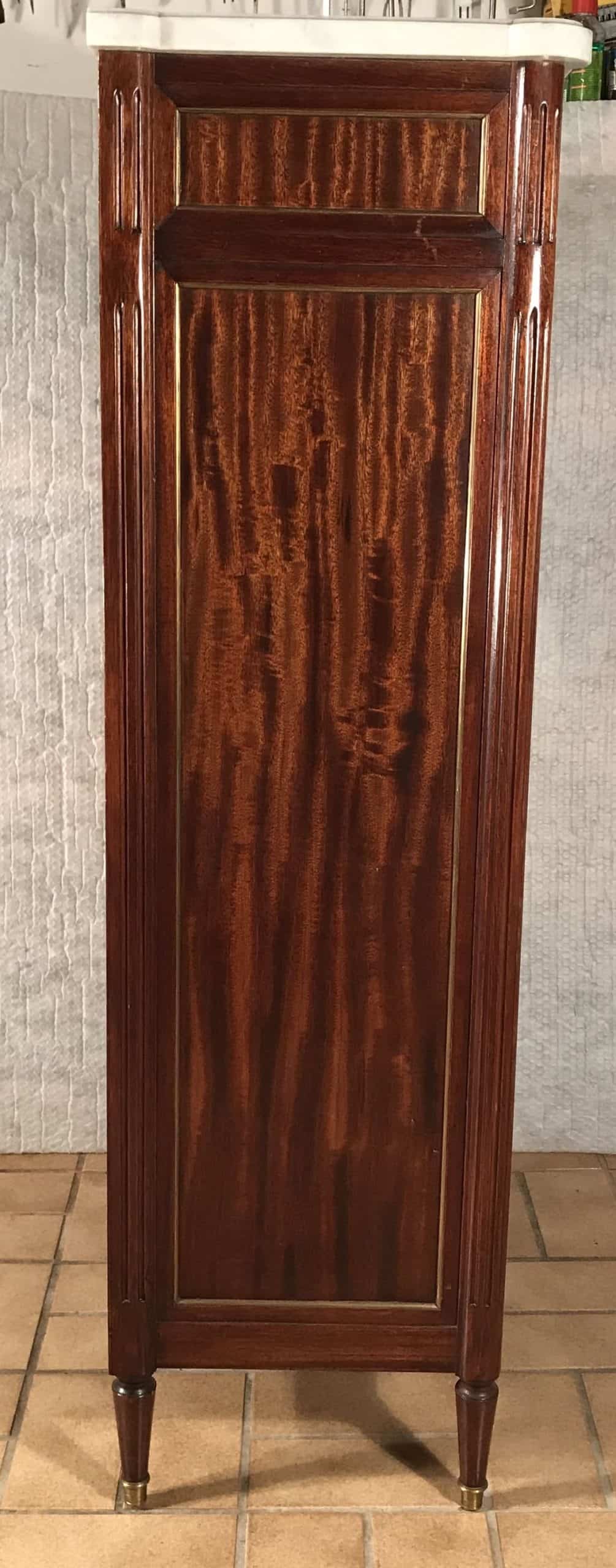 The maker used mahogany veneer and added a white marble top. The falltop desk is in very good condition. It will be shipped from Germany. Shipping costs to Boston are included.
