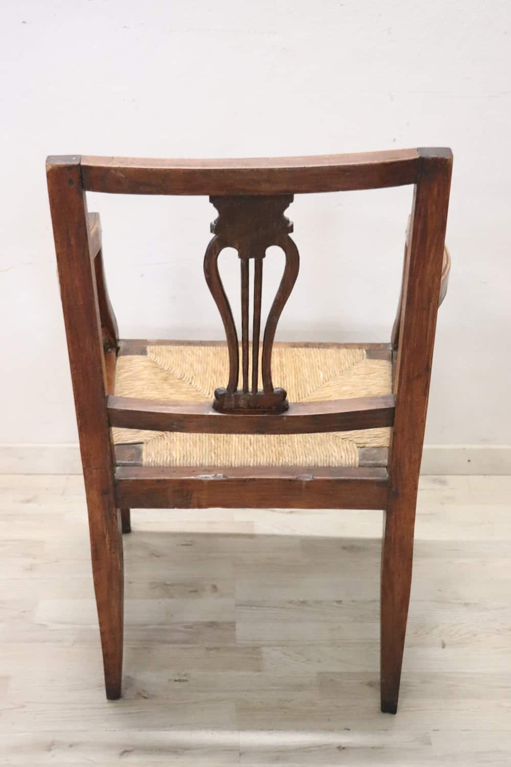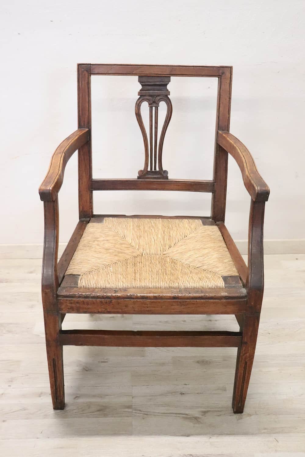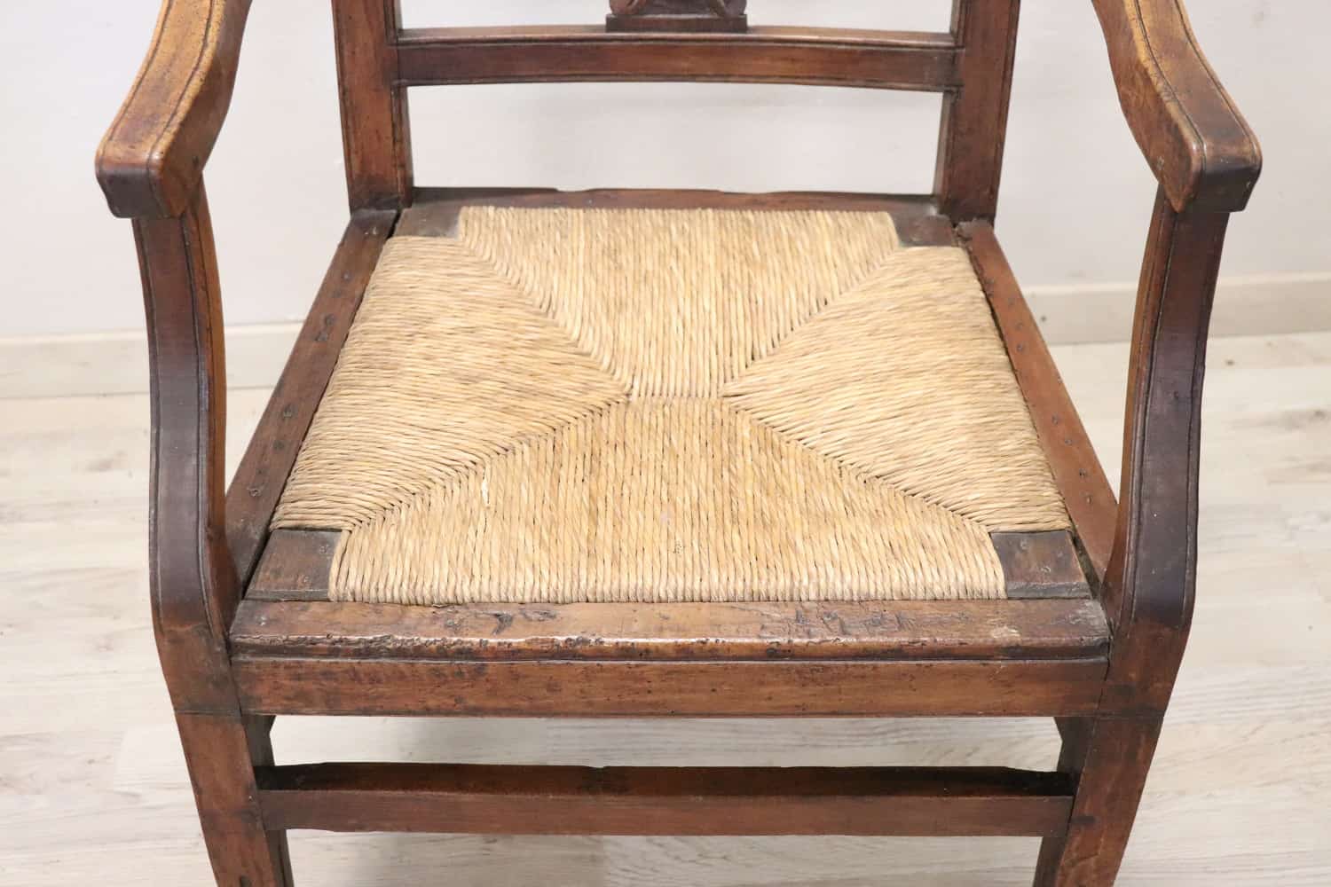 A beautiful Italian Louis XVI walnut armchair from the 18th century. This rustic armchair features a solid walnut wood frame that is beautifully decorated. The seat is wide and comfortable, showcasing vintage straw. The elegant and classic design of the armchair makes for a stately piece. The armchair is in perfect antique condition ready to be used in your home. Perfect to be placed in a country house.