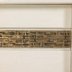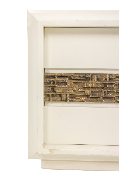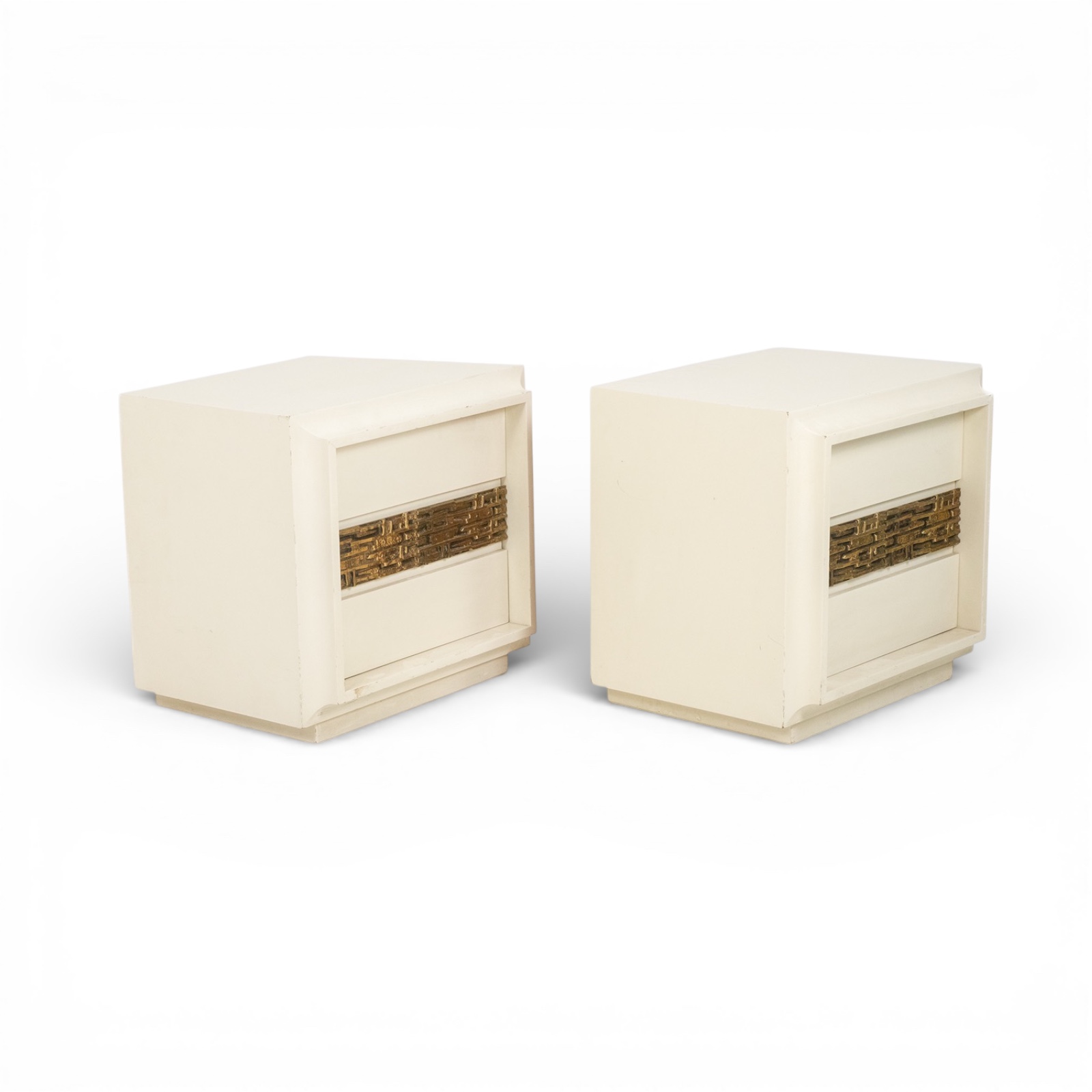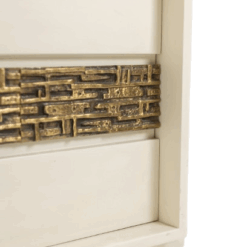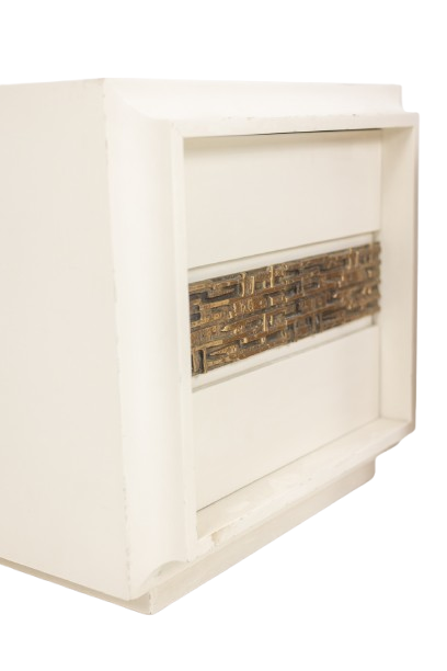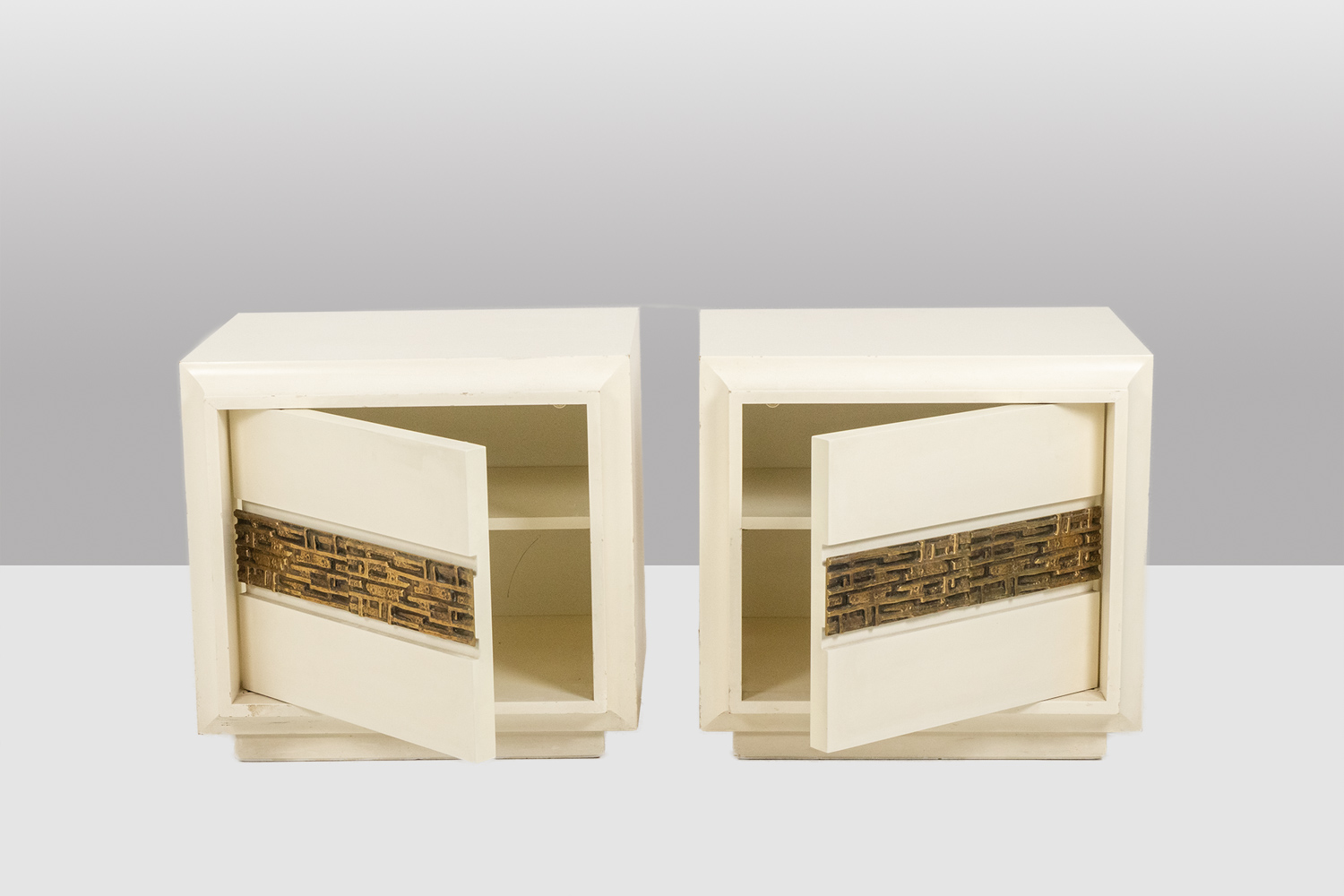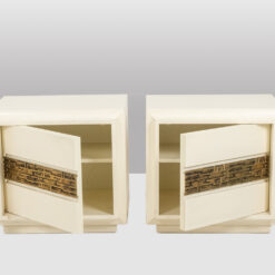 Pair of bedside tables by Luciano Frigerio, featuring a single front door. Crafted in cream lacquered wood, each piece is enhanced by a geometric motif in patinated bronze, reflecting Frigerio’s refined approach to Italian modern and decorative design.
