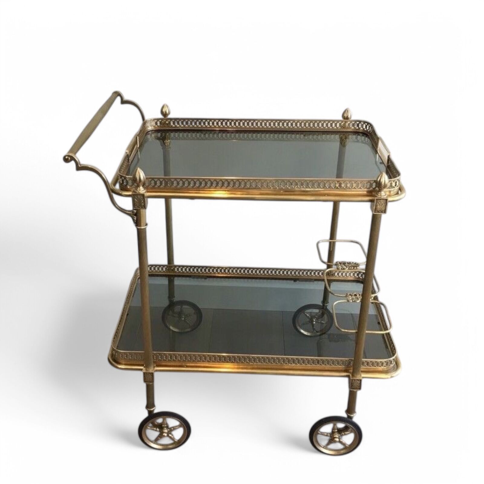 Blue-Tinted Glass Shelves: The two-tiered design features rare blue-hued glass, adding a subtle pop of color and a luminous quality to the cart’s elegant silhouette.
