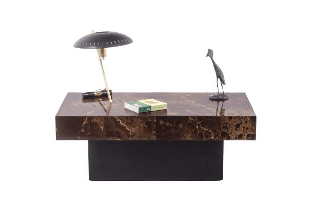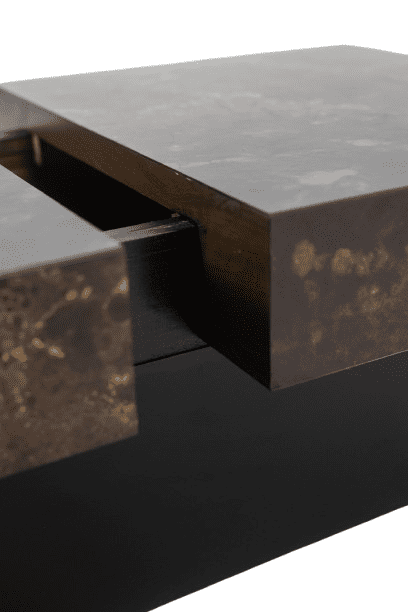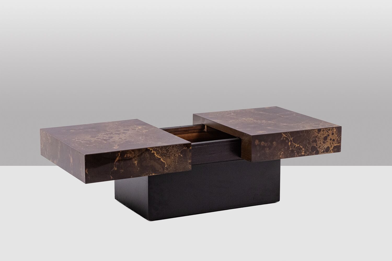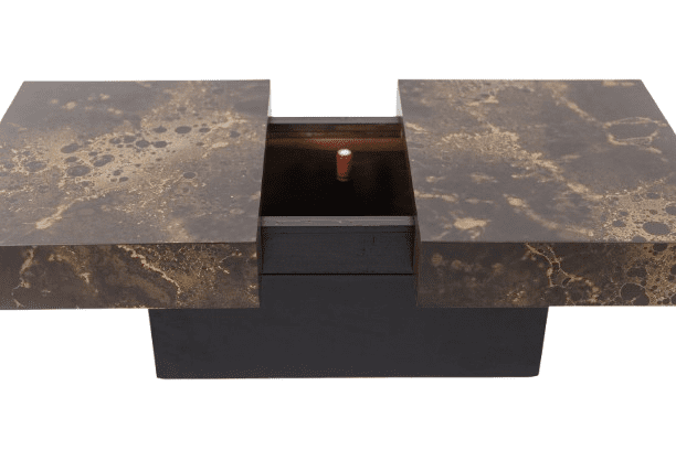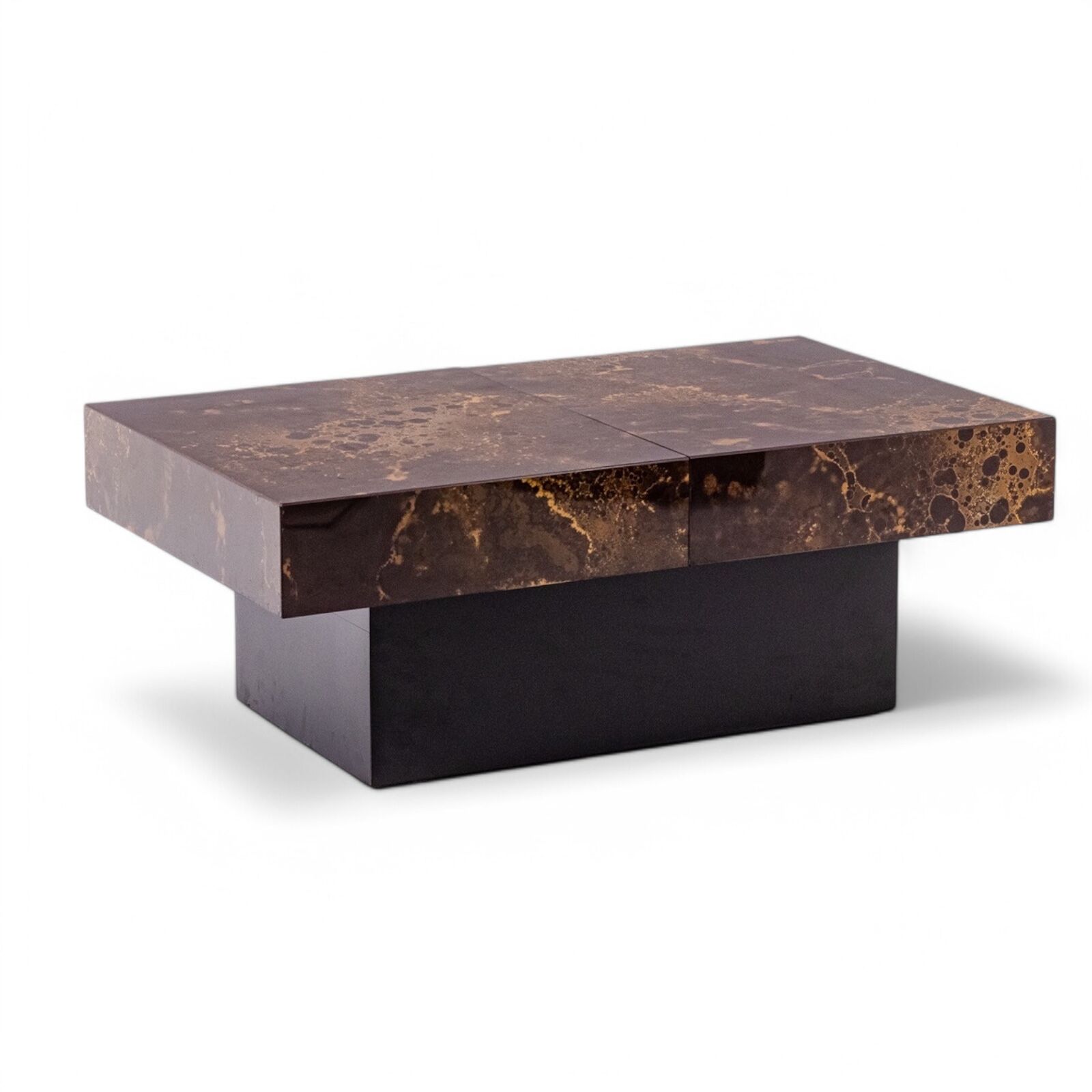 A striking Maison Jansen-style coffee table that cleverly doubles as a bar. Designed with a sliding top, this elegant piece features wood and brown melamine with a sophisticated iridescent gold decoration, adding a touch of luxury.