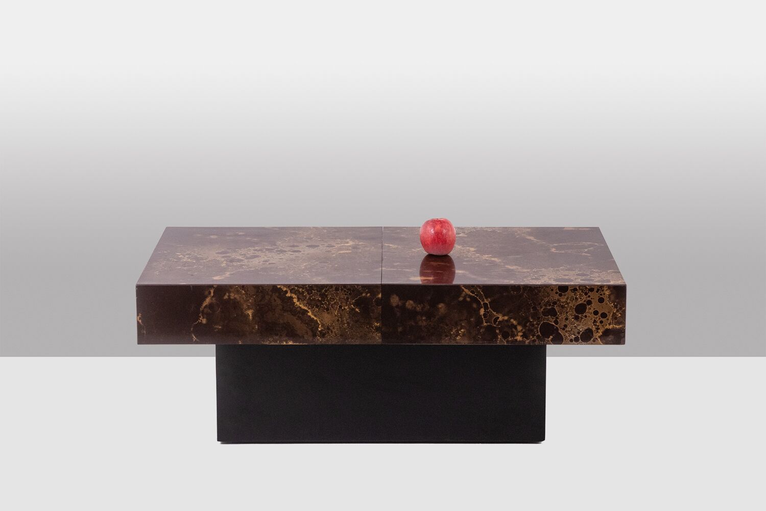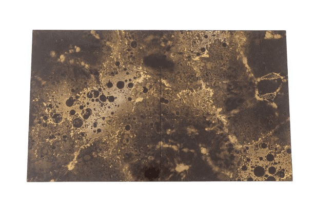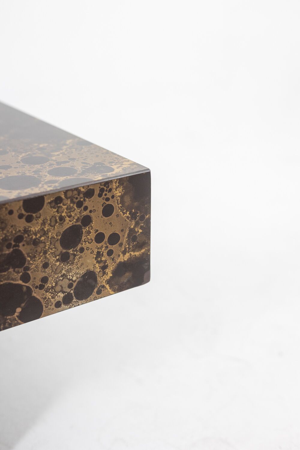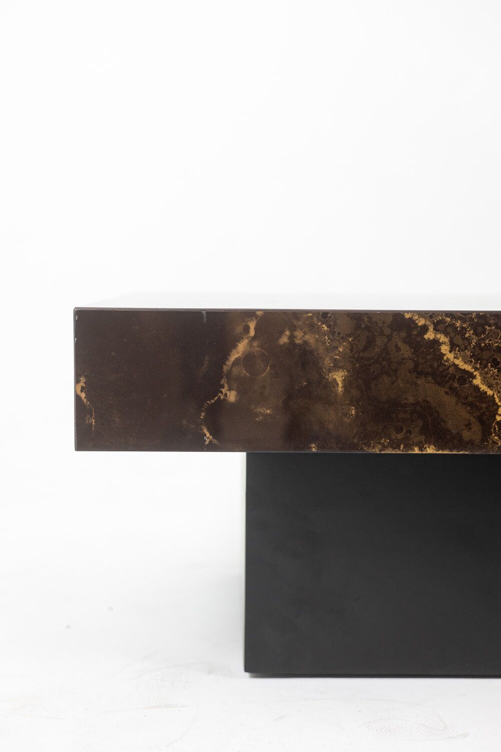 A striking Maison Jansen-style coffee table that cleverly doubles as a bar. Designed with a sliding top, this elegant piece features wood and brown melamine with a sophisticated iridescent gold decoration, adding a touch of luxury.