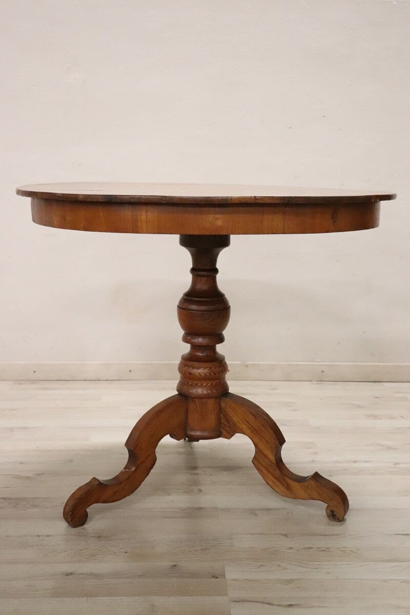 We present an elegant antique Italian round table dating back to the mid-19th century. The table features typical Louis Philippe period features.