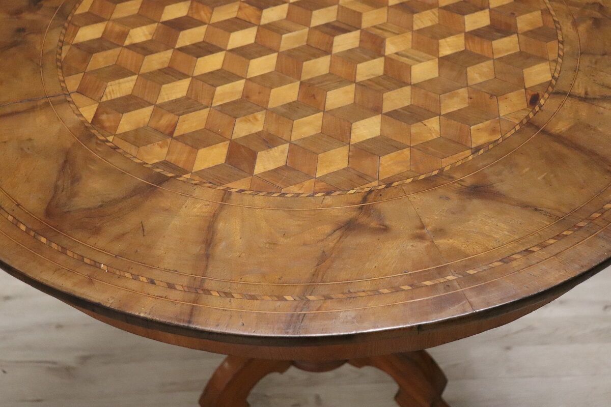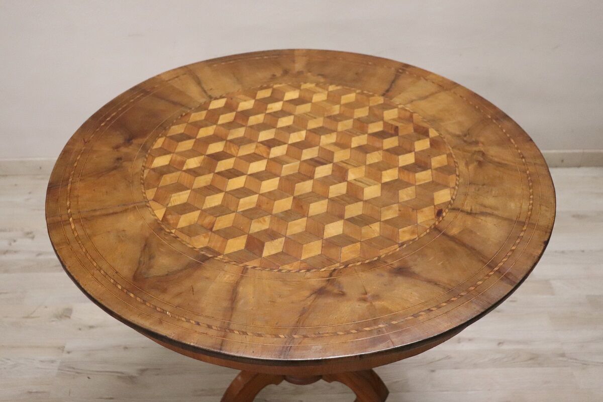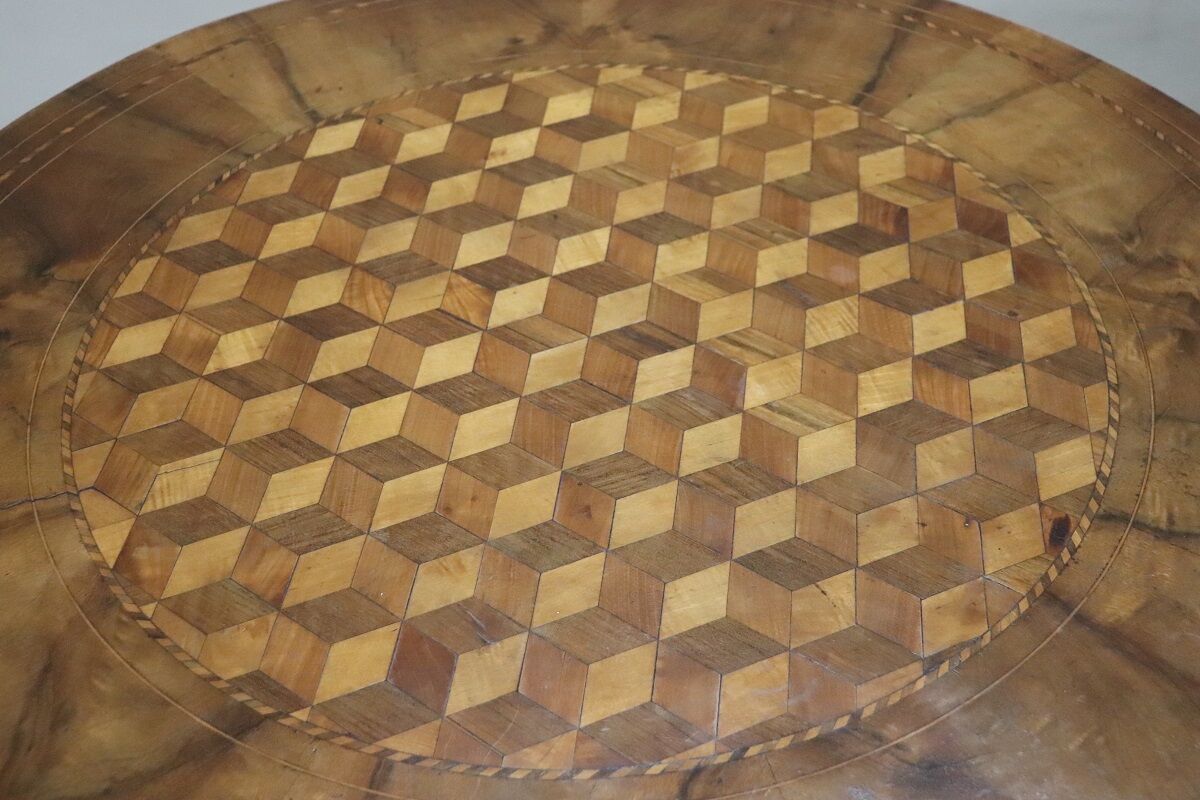 This walnut table is distinguished by its exquisite geometric inlay decoration, which features a three-dimensional checkerboard pattern on the top; it becomes a true work of art that captivates the observer. The tabletop is supported by a single, finely turned central leg resting on three feet.