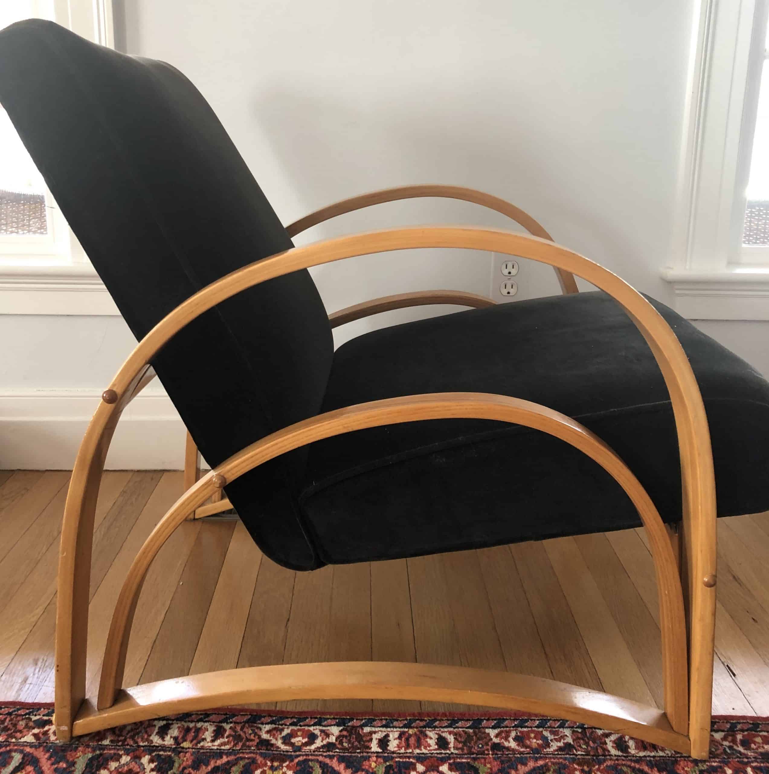 The chair is in original condition and shows signs of wear on the black velvet fabric. This armchair can give any living space a modern accent. You can use it as a lounge chair or in a reading nook as a comfortable accent piece.