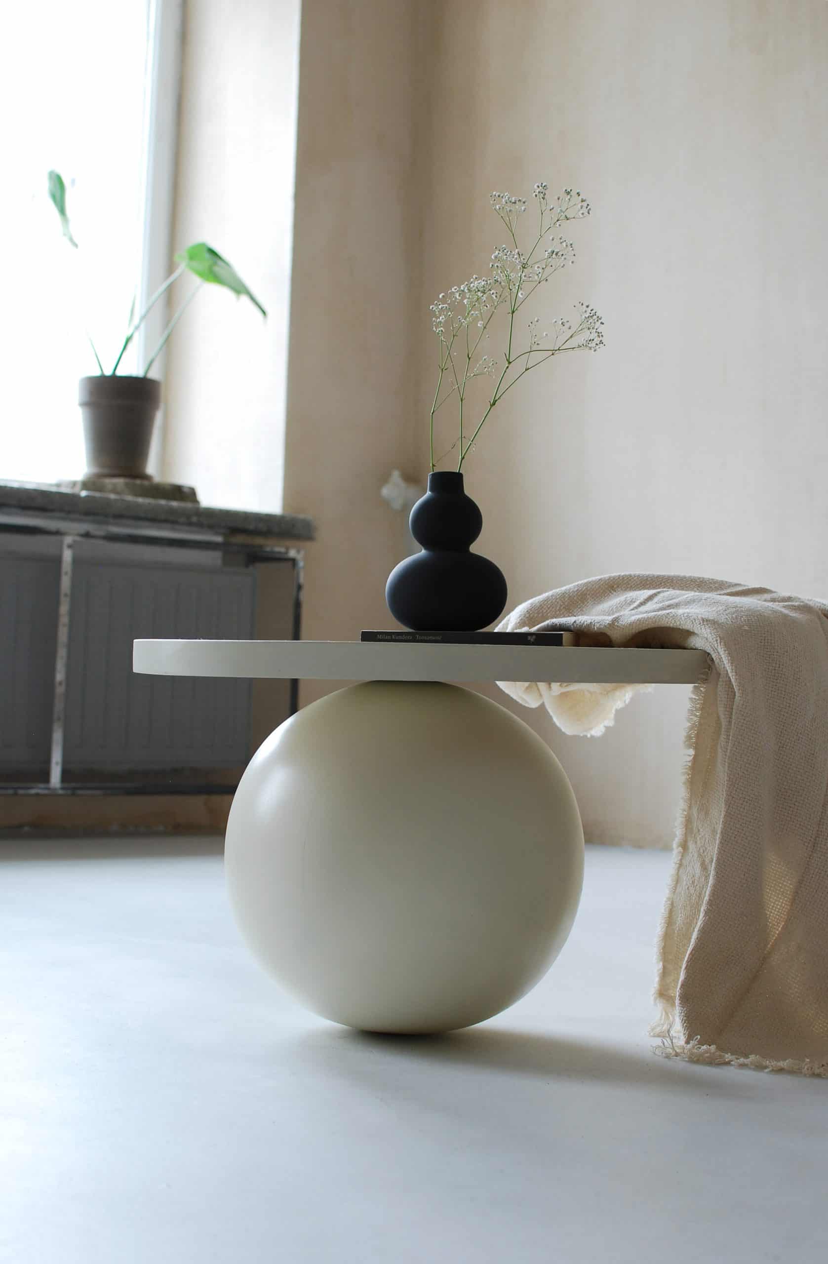 Materials: Ash wood top, metal legs, pine wood ball detail