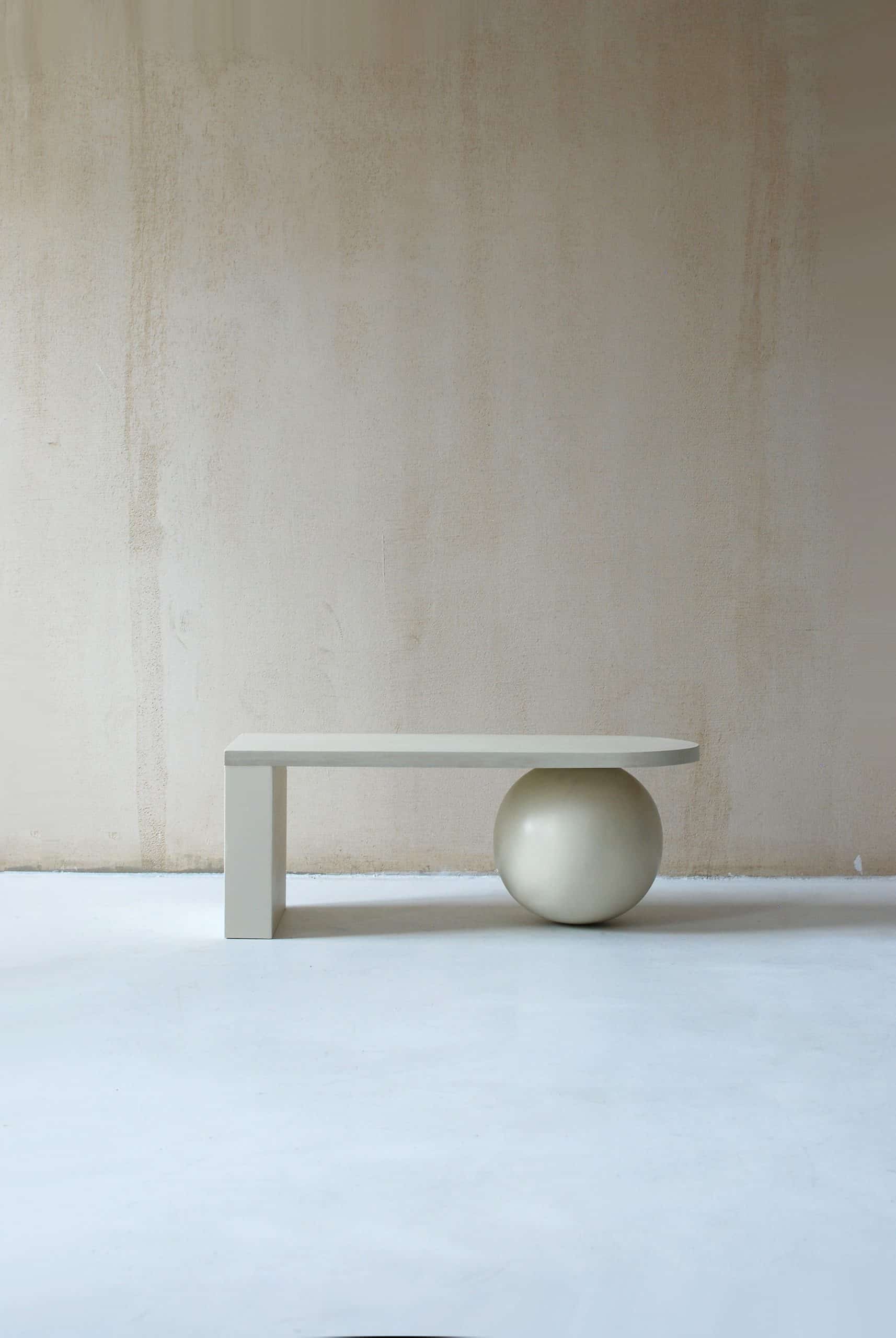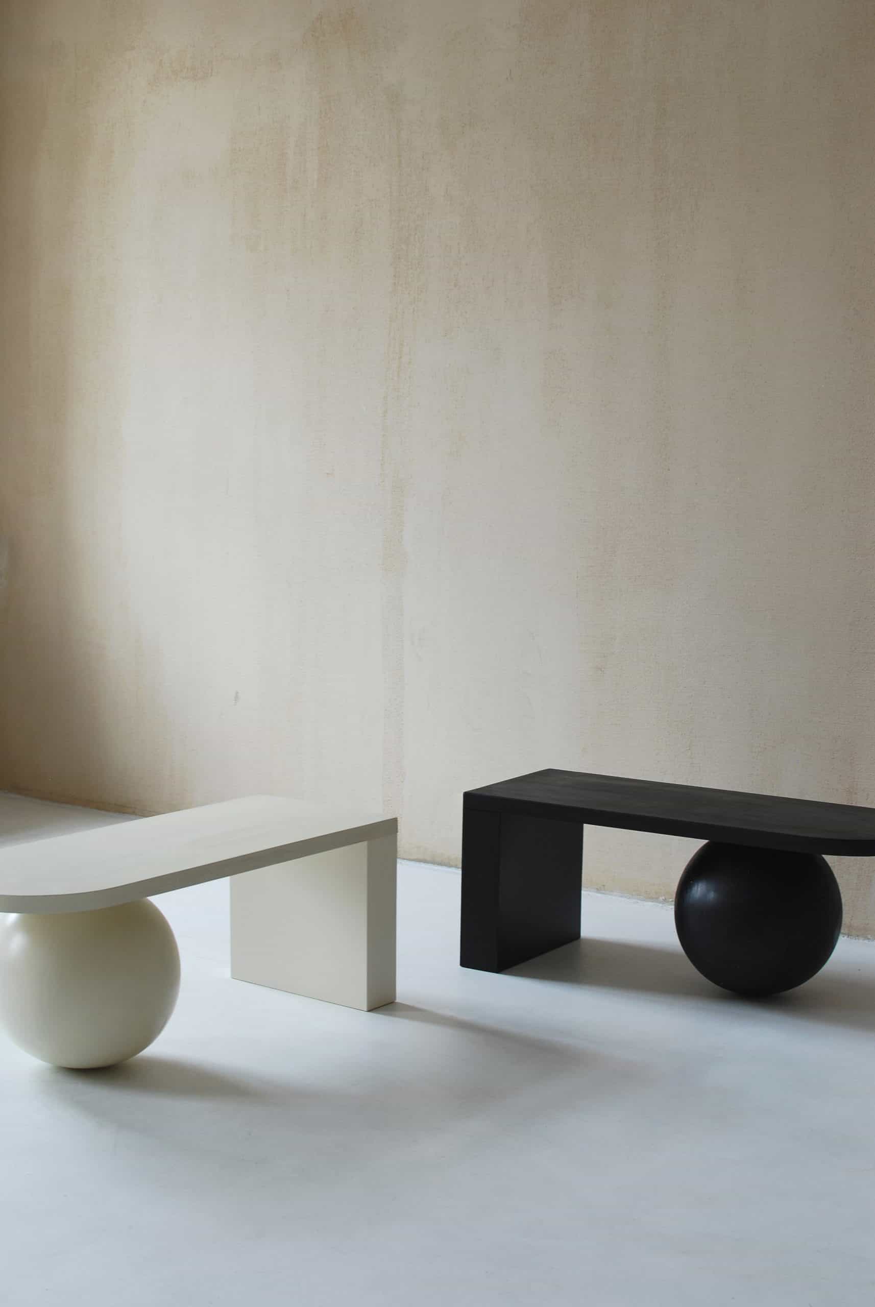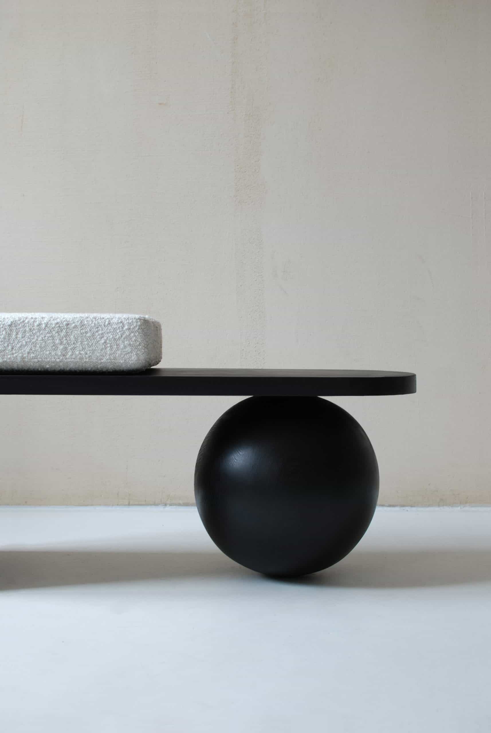 Clean lines define the Modern Bench “Hen.” Neutral tones allow easy pairing with antique or contemporary furniture. The design highlights natural ash wood and a sculptural pine wood ball detail.