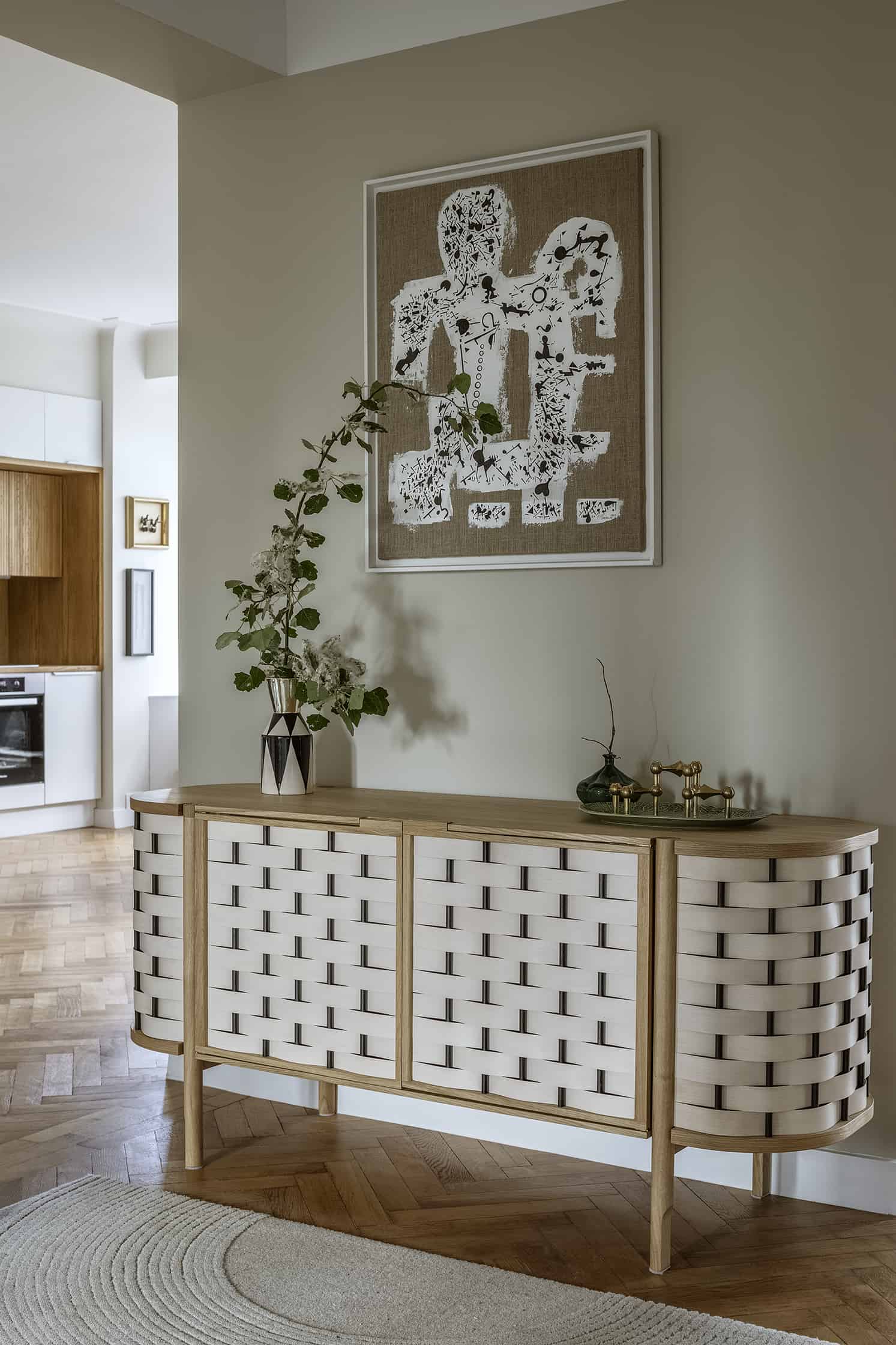 This modern credenza “hide your things” is a multitasking furniture. You can keep there literally each and every item you need to have within your reach but do not necessarily wish to be out there in the open. It has one spacious, closed cabinet with a shelf which will help you to organize your belongings. The woven fronts are opened by double doors – this guarantees easy access to the whole storage space.