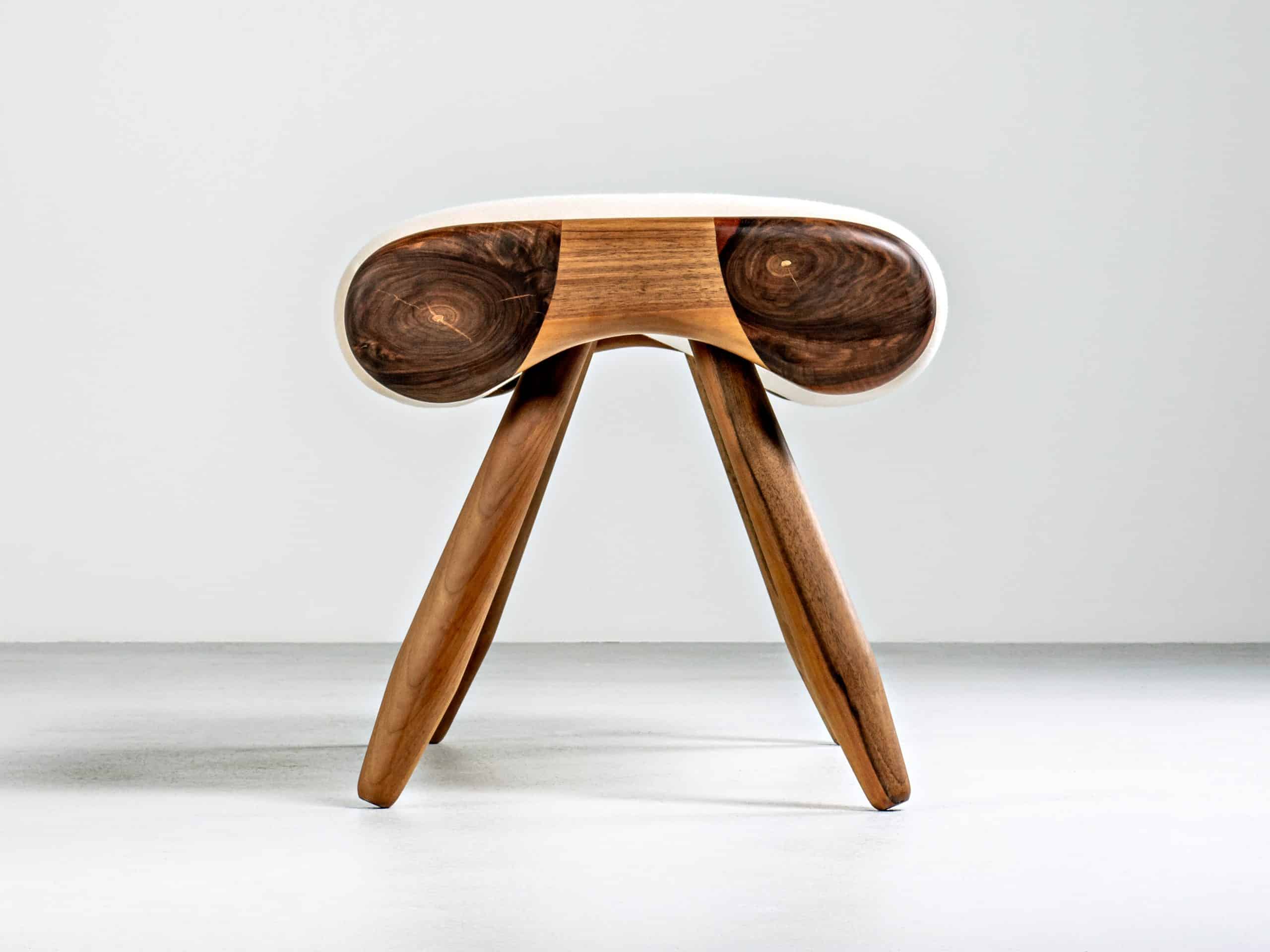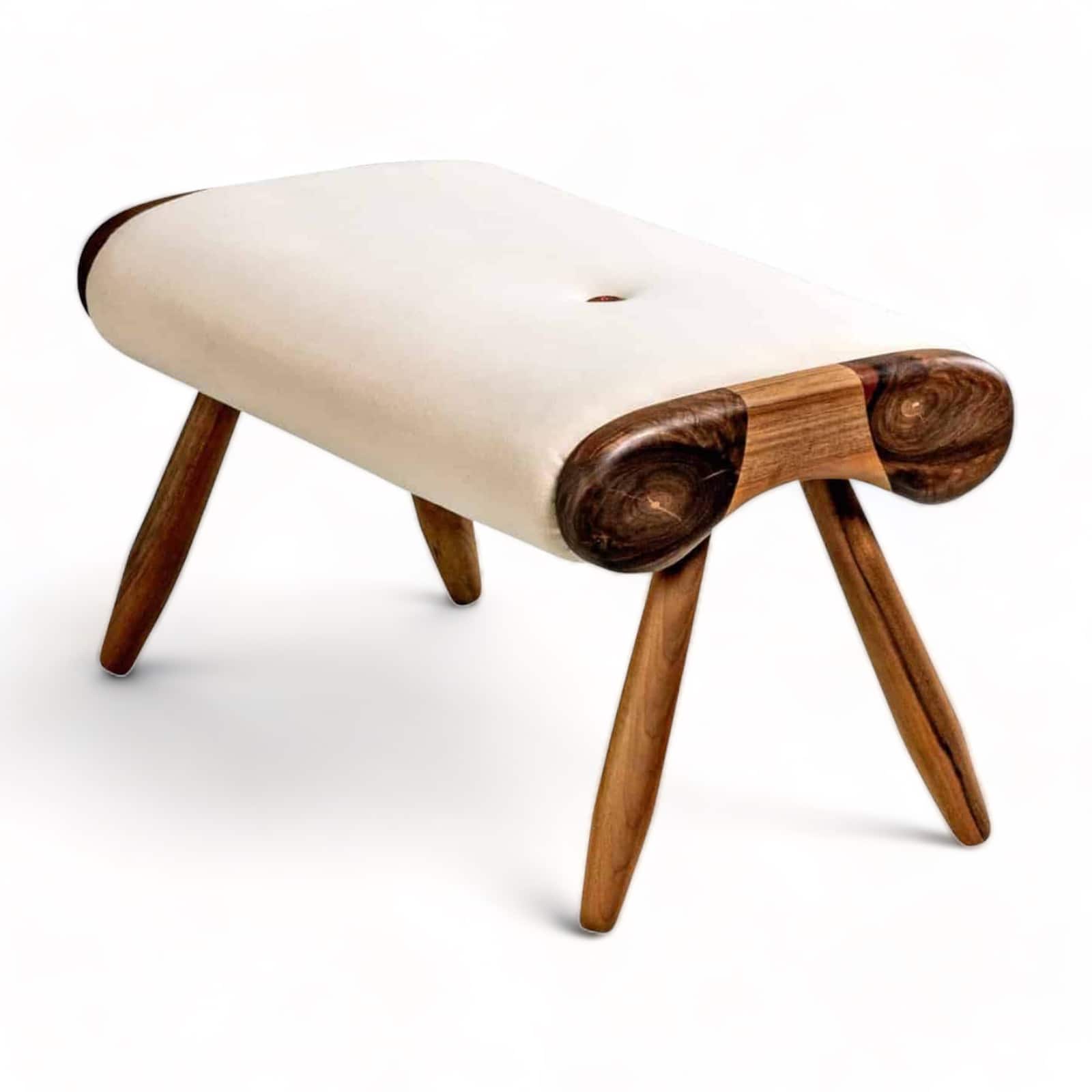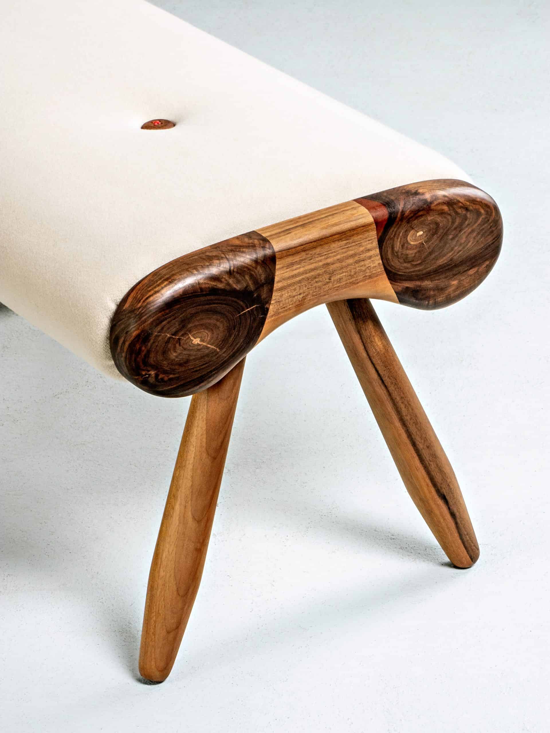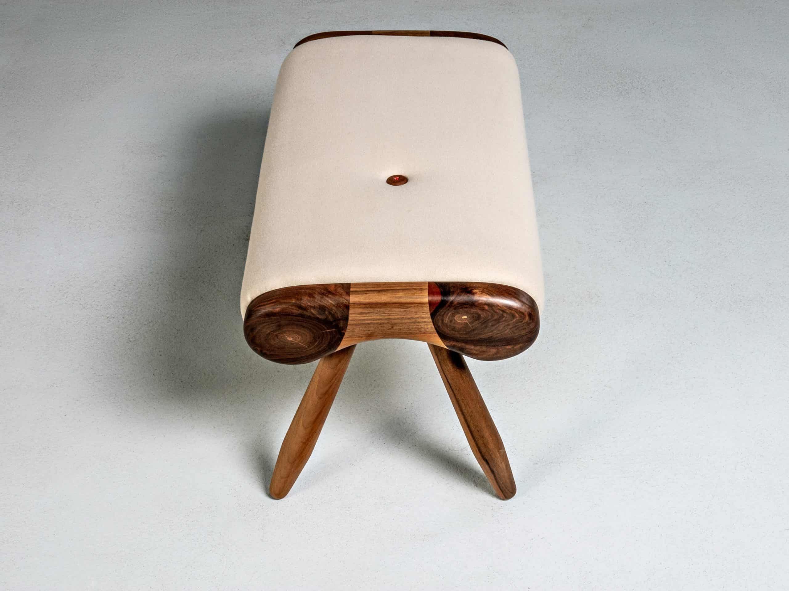As with the matching lounge chair “Eye” the main features of this modern ottoman are the emphasized spherical sides made of solid wood. Slightly conical legs give additional aesthetics. Furthermore, the asymmetrically placed handmade wooden button with a decorative thread in a different color, is a fancy detail.