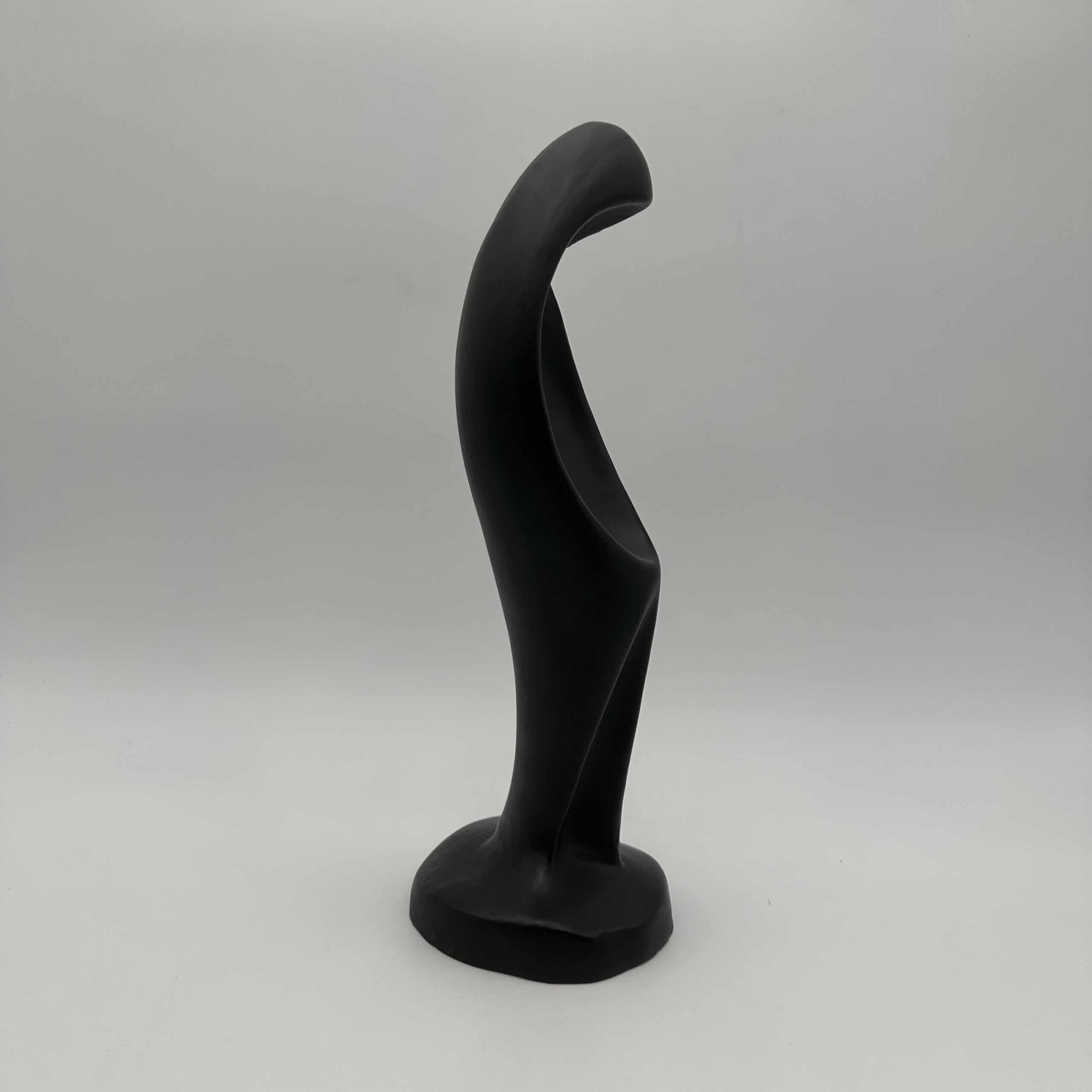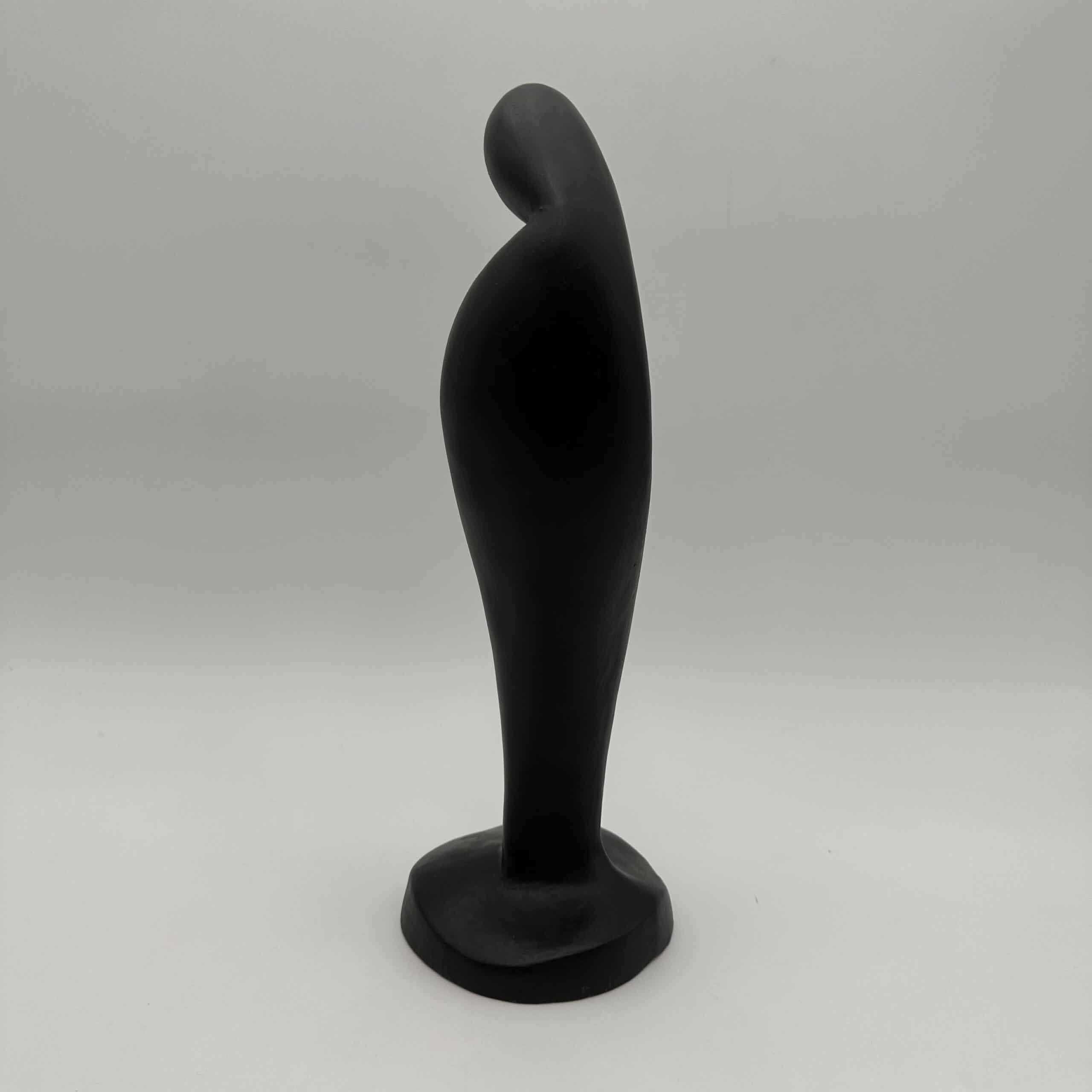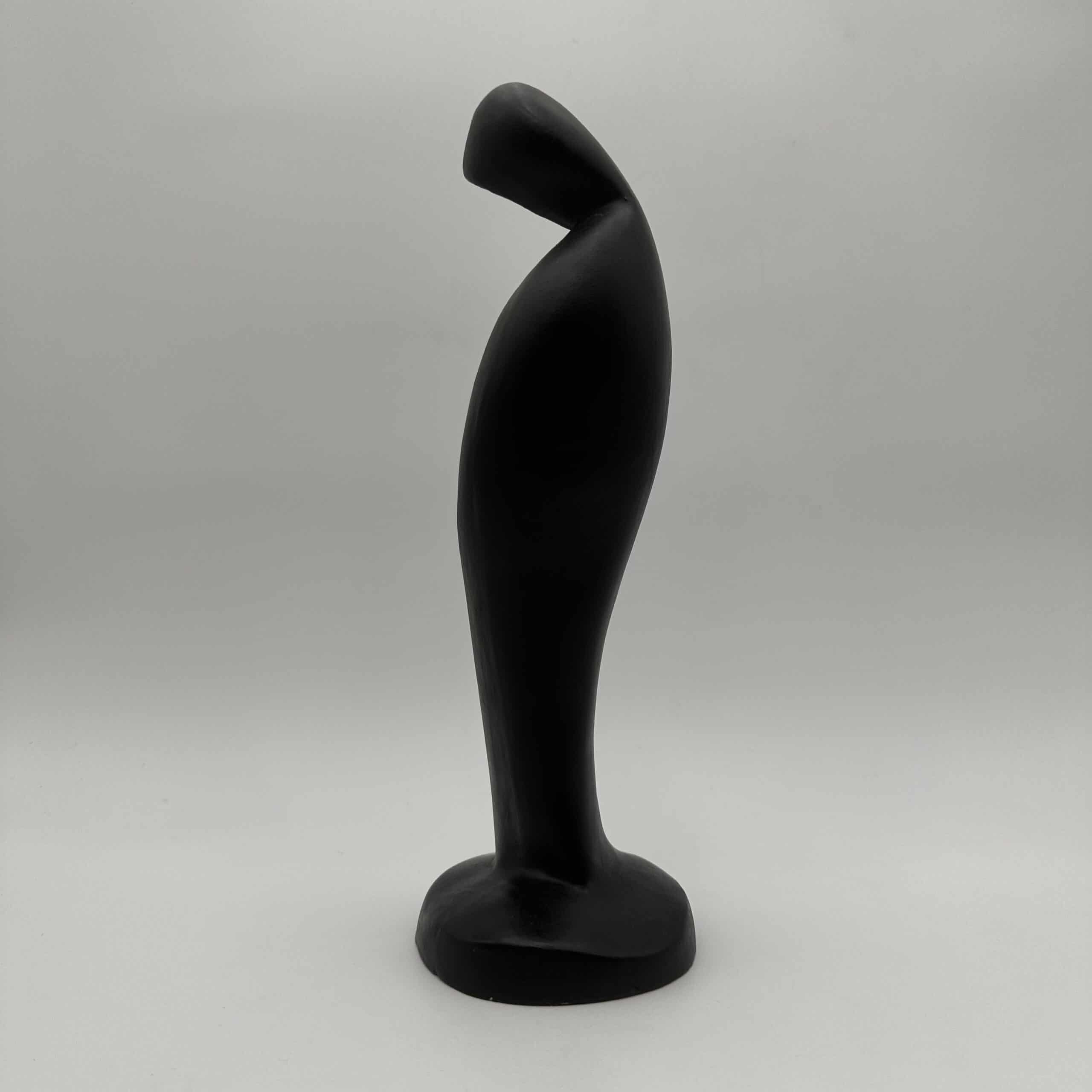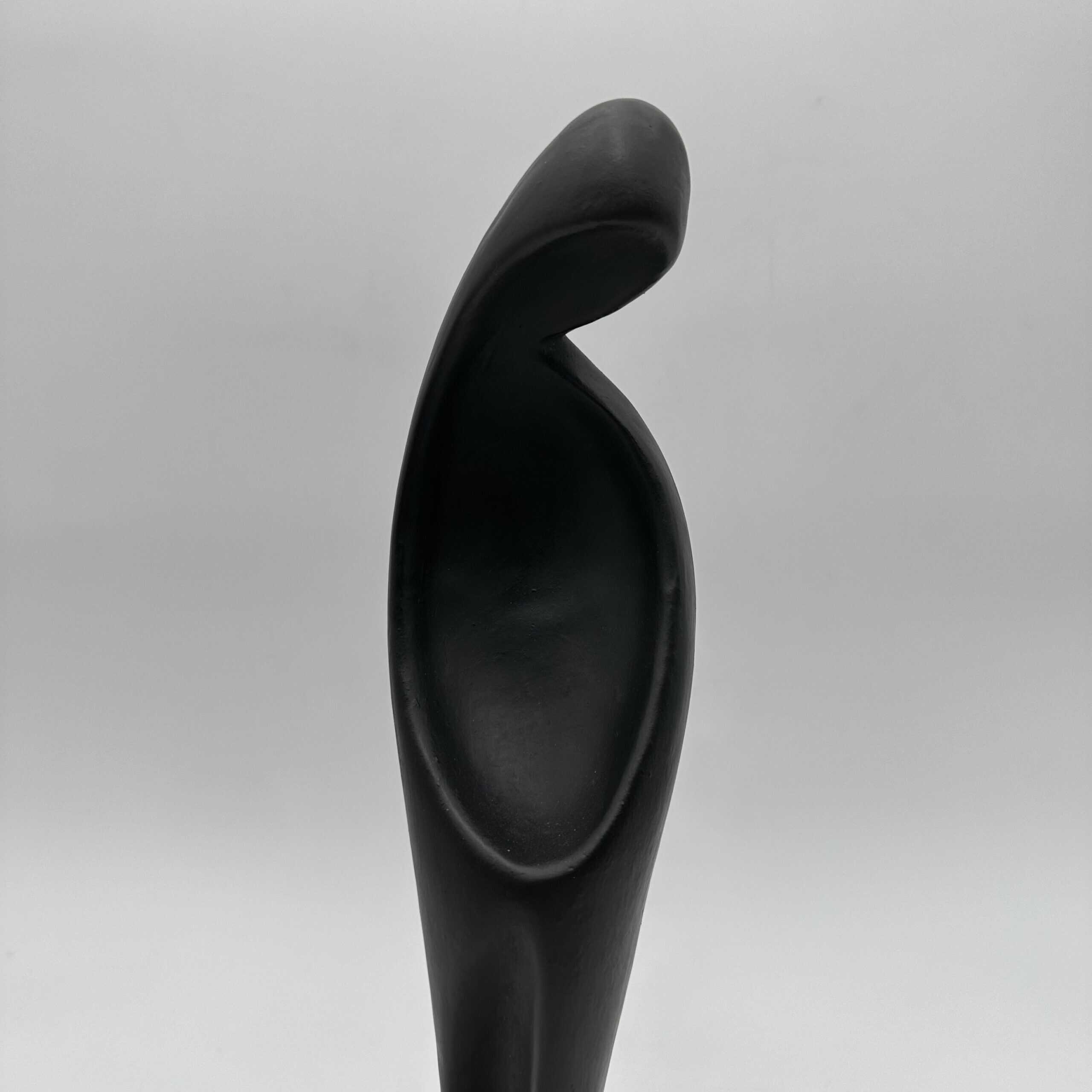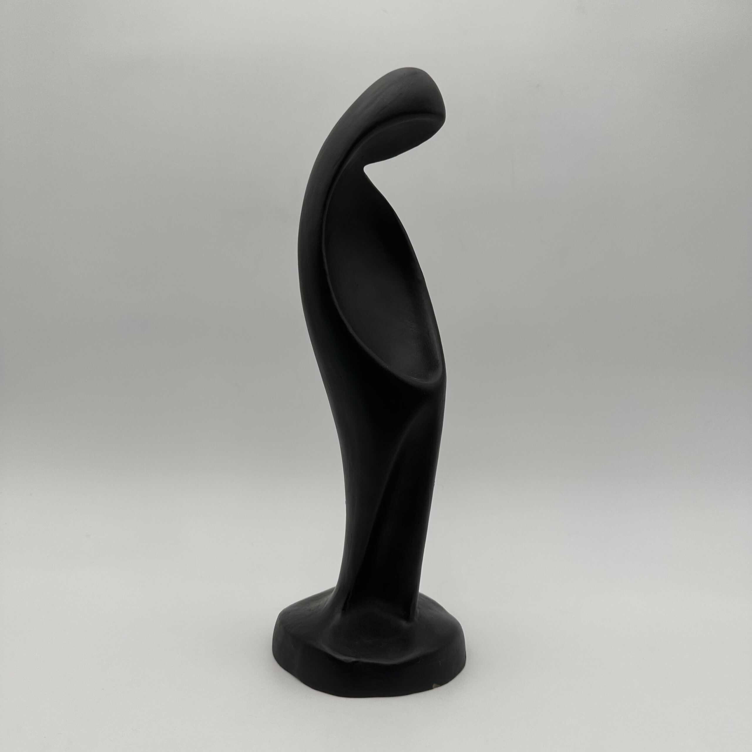 The sculpture features a deep black glaze with a soft satin finish. This surface highlights the purity of the form and the precision of the modeling. This sculpture delivers both visual strength and quiet elegance. The piece stands on a circular base and creates a strong vertical presence. This piece suits modern and mid-century interiors. Place it on a console, sideboard, or in a lit niche.