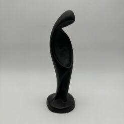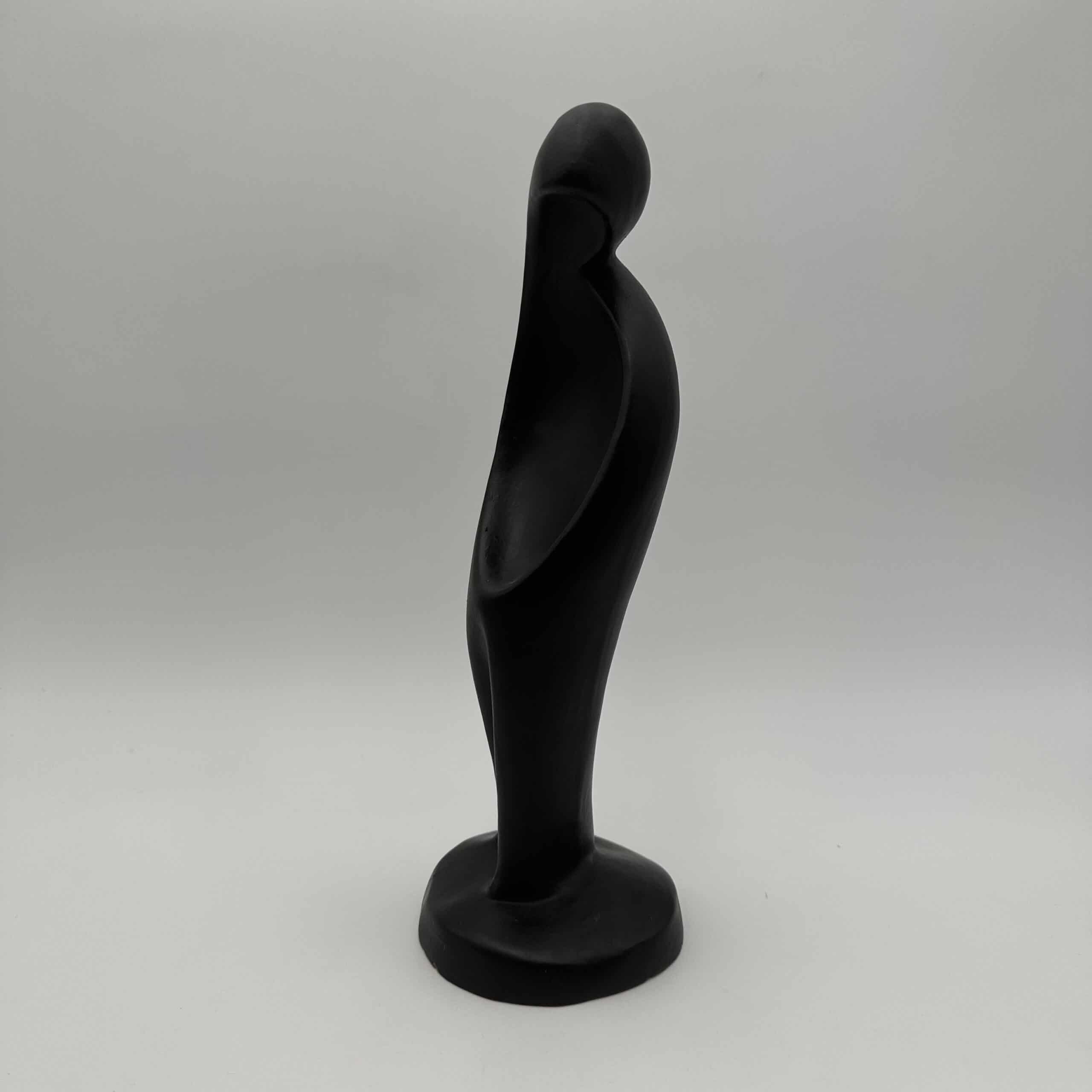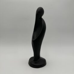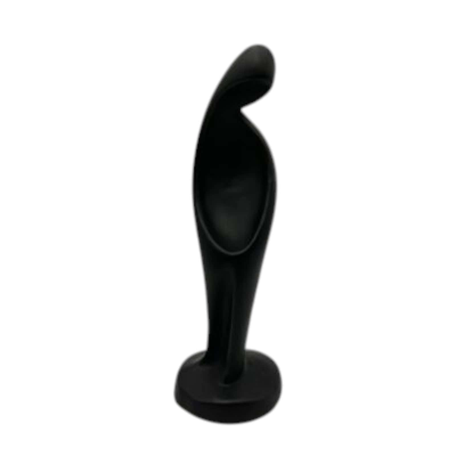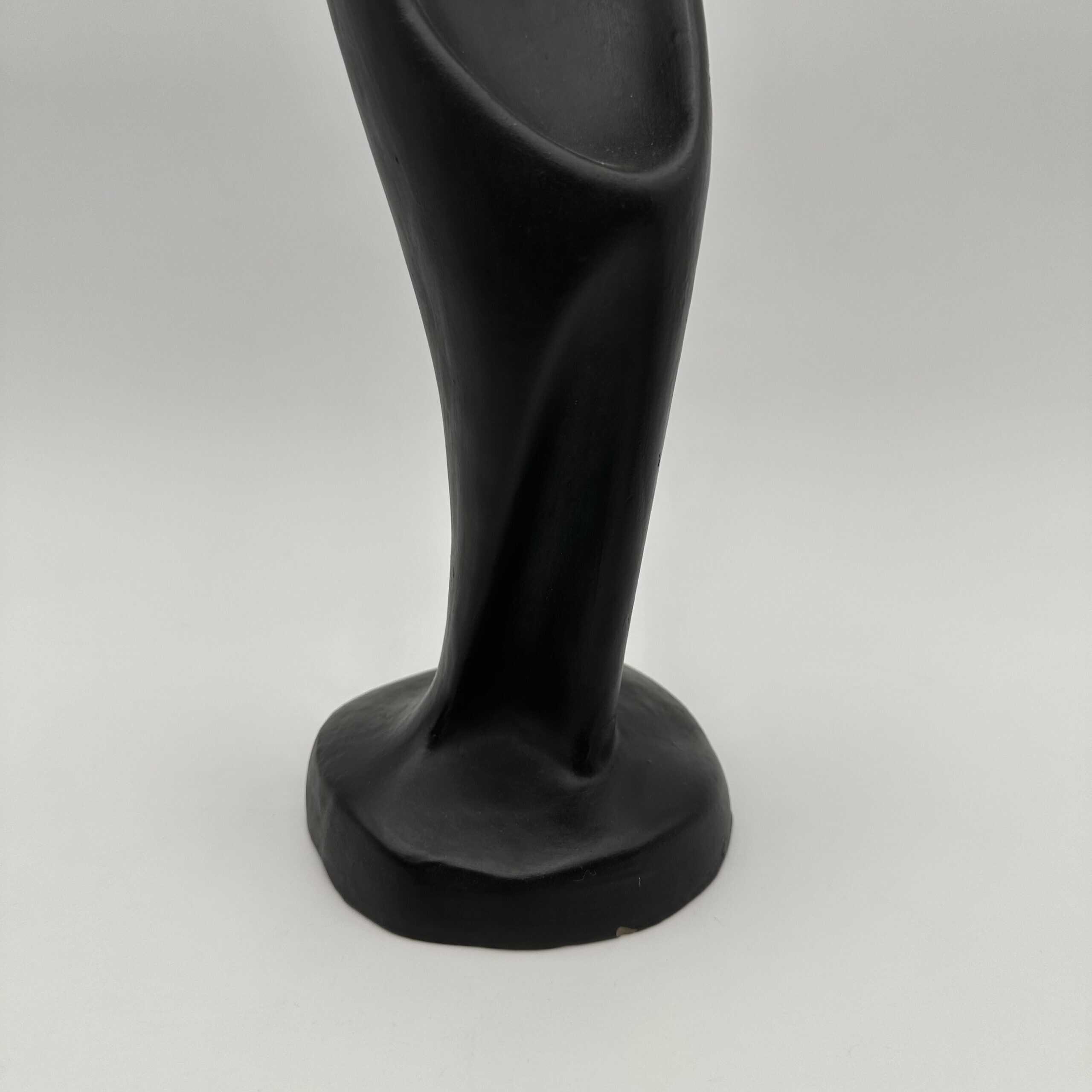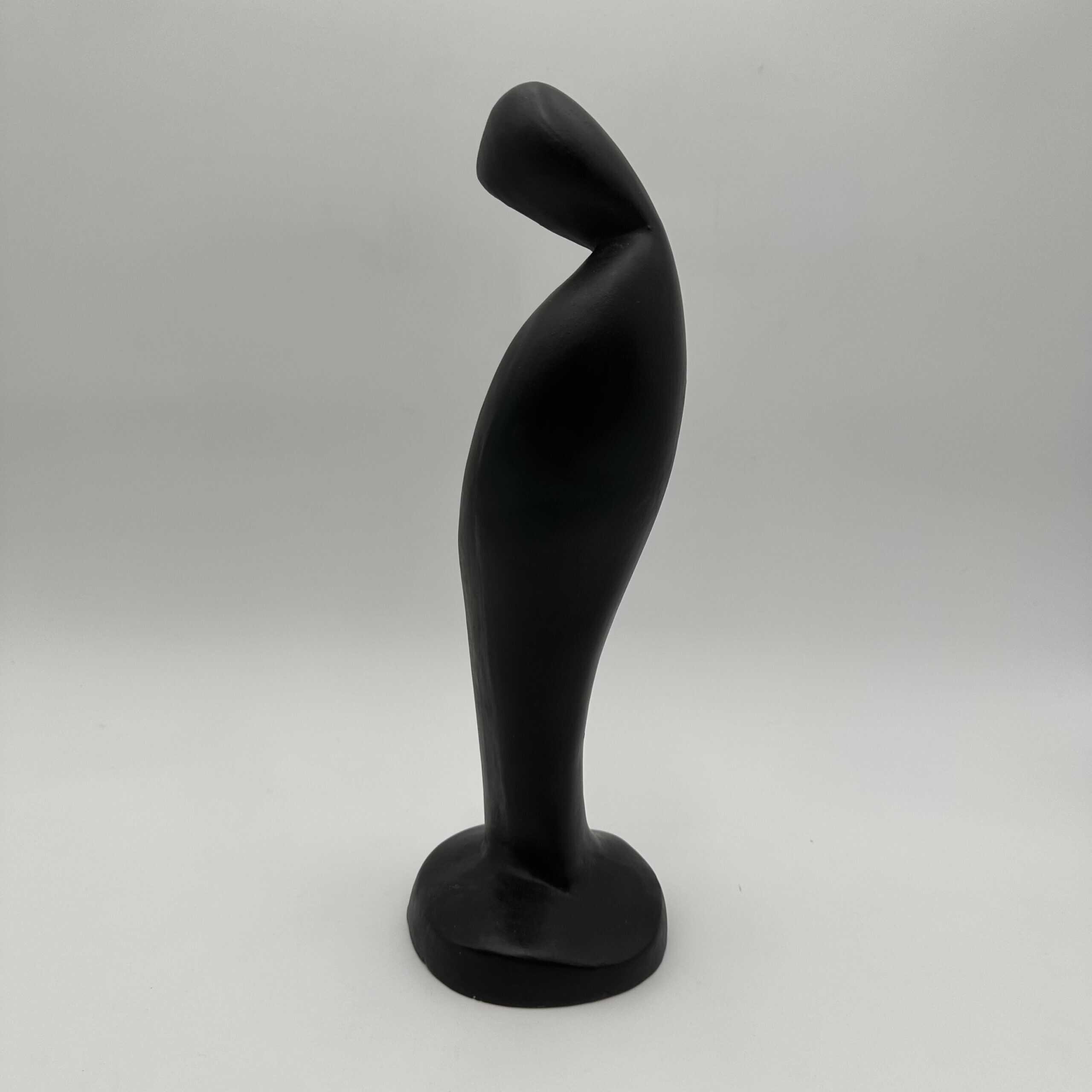 The sculpture features a deep black glaze with a soft satin finish. This surface highlights the purity of the form and the precision of the modeling. This sculpture delivers both visual strength and quiet elegance. The piece stands on a circular base and creates a strong vertical presence. This piece suits modern and mid-century interiors. Place it on a console, sideboard, or in a lit niche.
