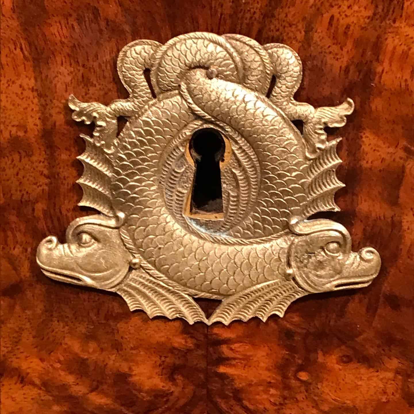 The upper most smaller drawers are decorated with their original beautiful brass acanthus vine decor. The original brass escutcheons of the three larger drawers consist of two interlacing dolphins The drawers are framed with brass ribbons and rose vines decorate the original brass handles.