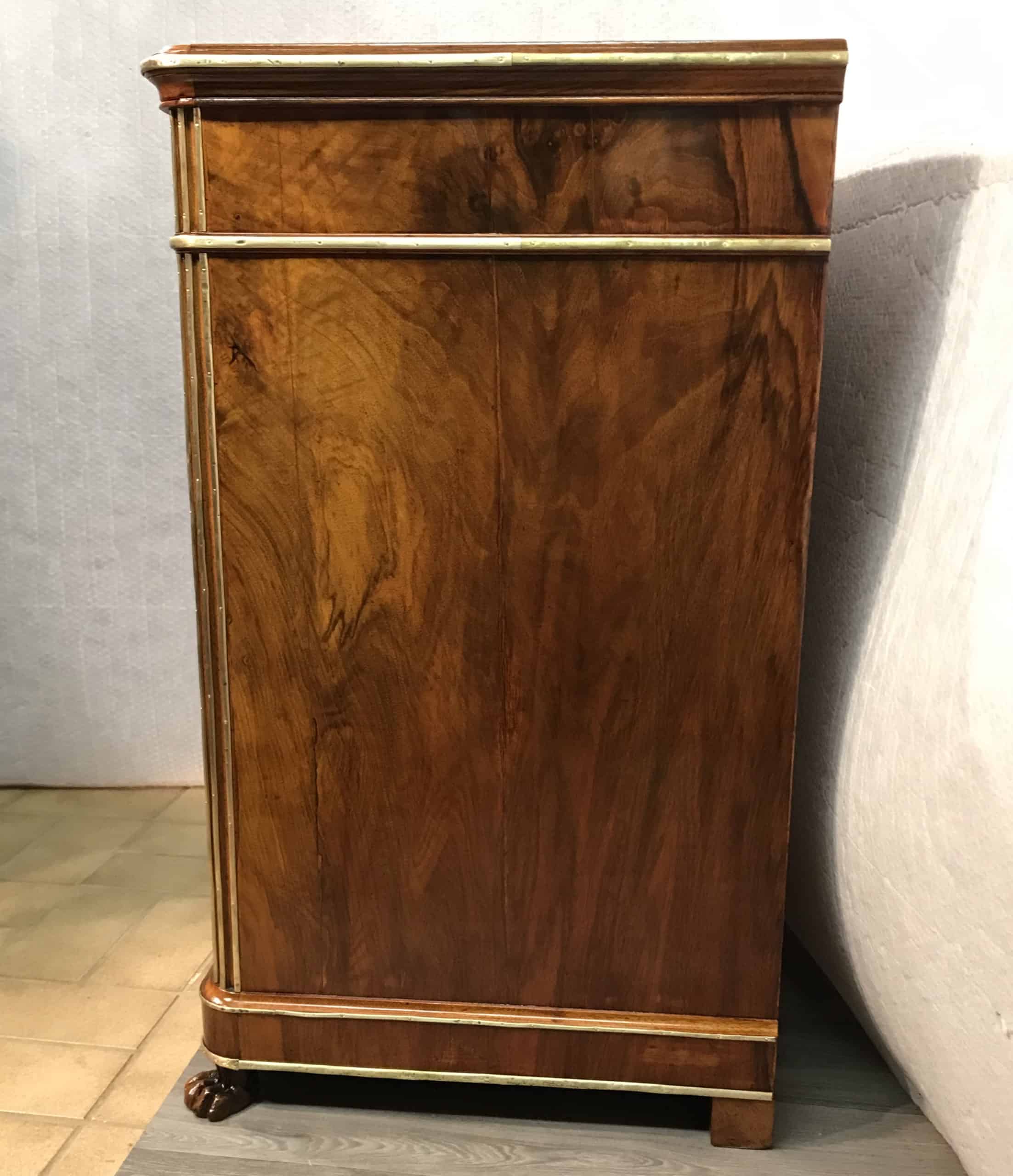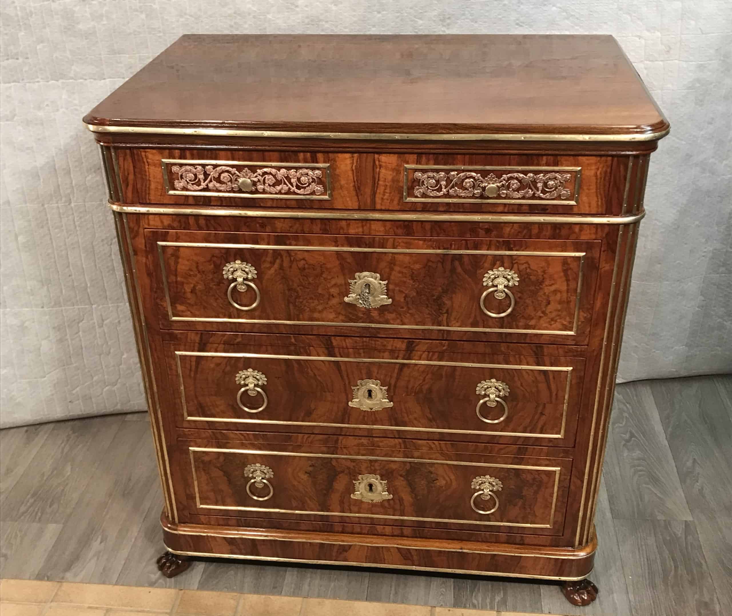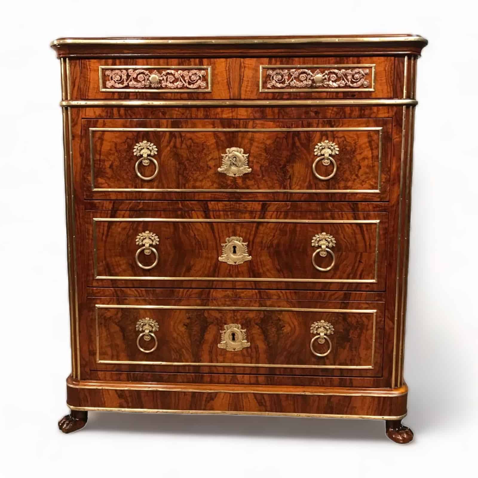 This Neoclassical chest of drawers is an outstanding piece. The five drawer chest has a gorgeous walnut veneer and stands on lion claw feet.