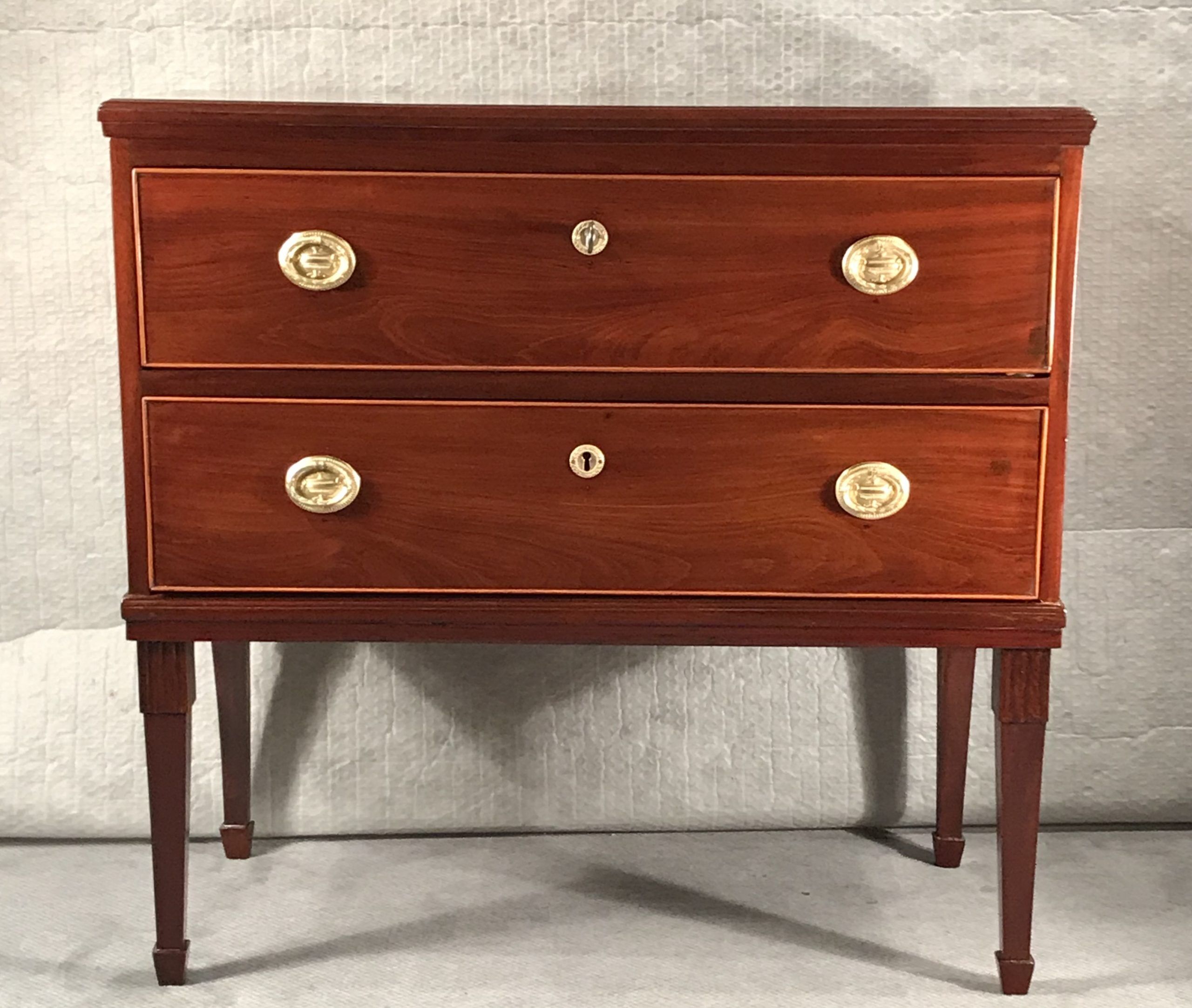 This elegant Neoclassical commode dates back to around 1810 and comes from Northern Germany. The two drawer chest has a beautiful mahogany veneer on top, sides and front with additional satinwood decorations on the top. The chest of drawers stands on slender legs and has very pretty brass fittings.