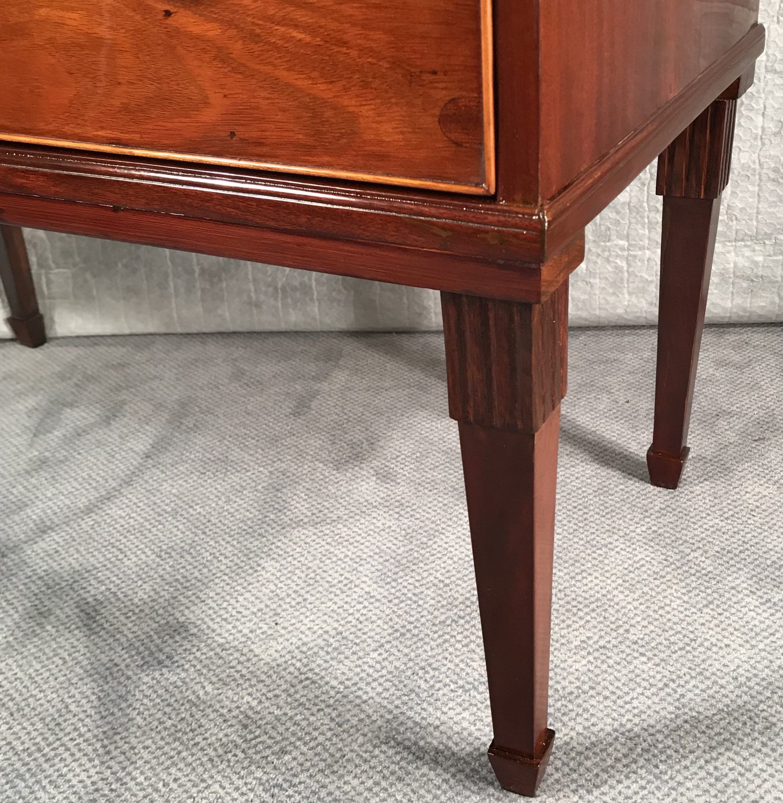 The neoclassical commode comes refinished and measures Height: 30.12 in. (76.5 cm), Width: 31.5 in. (80 cm), Depth: 17.13 in. (43.5 cm).