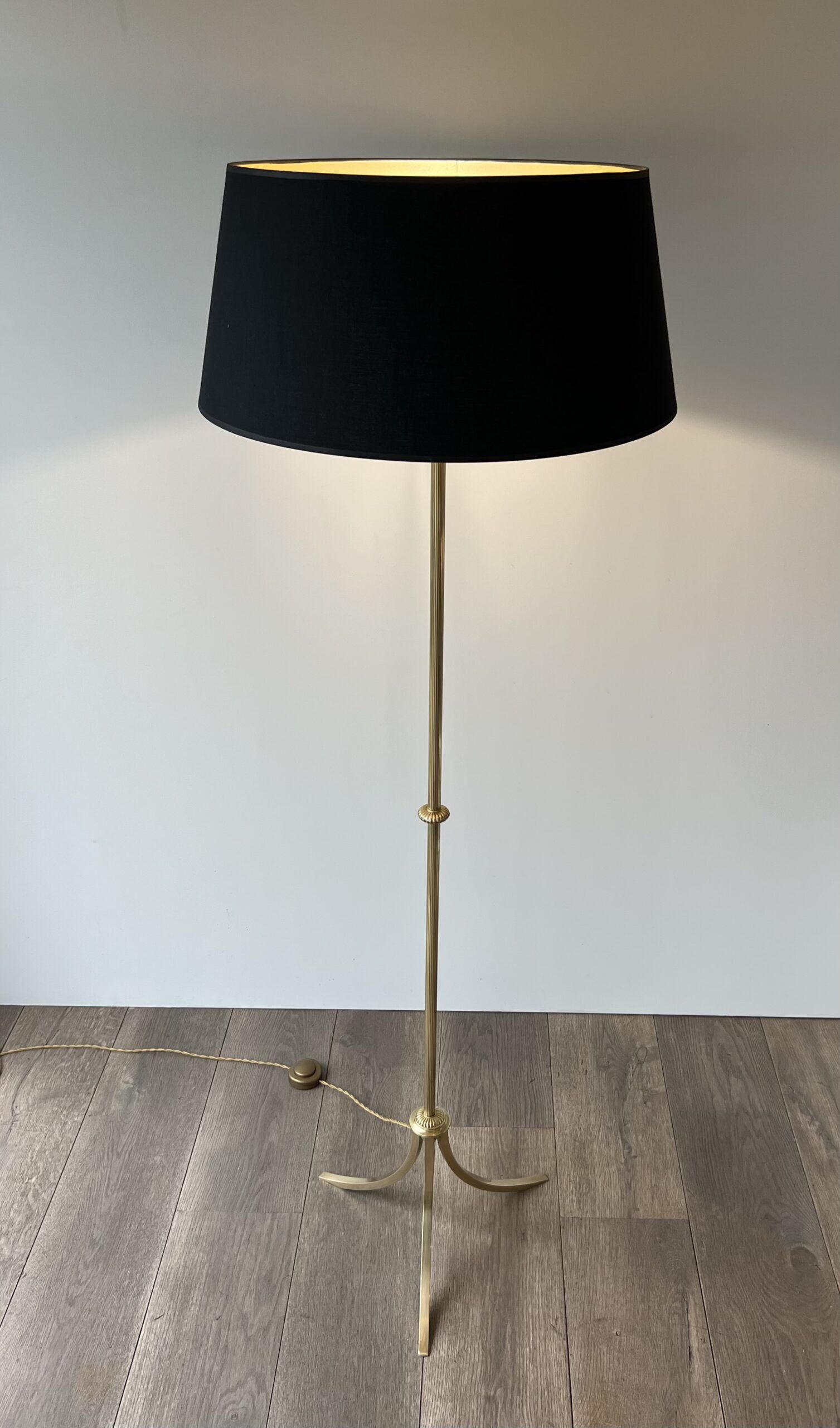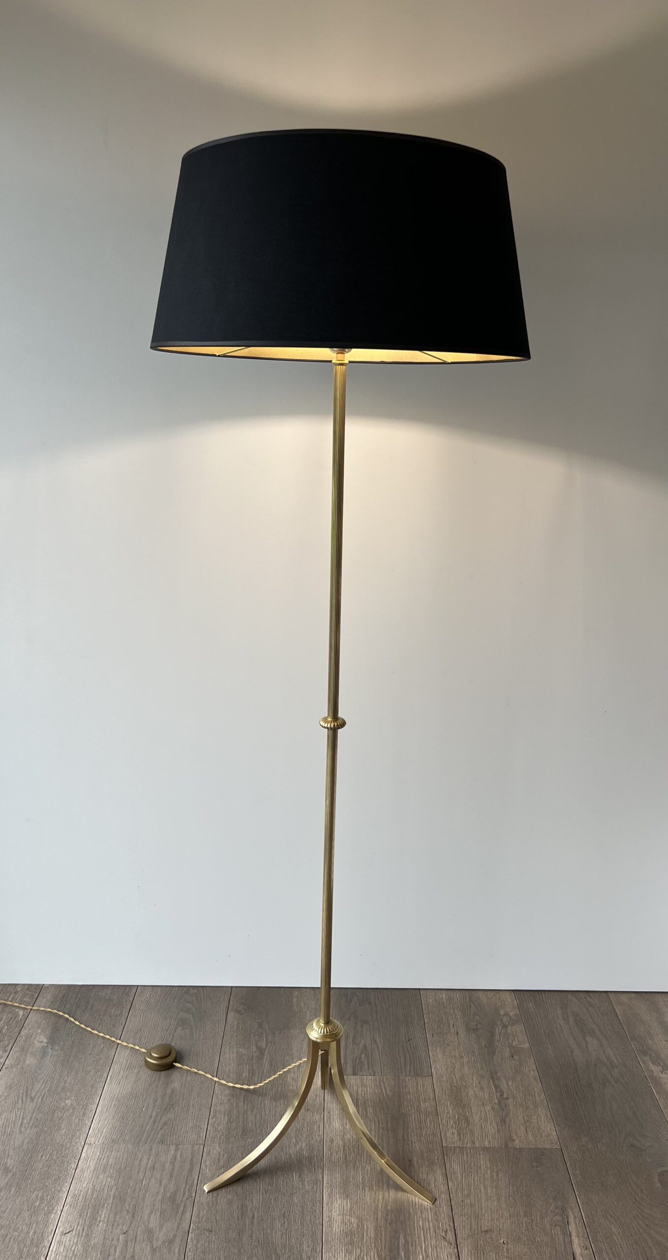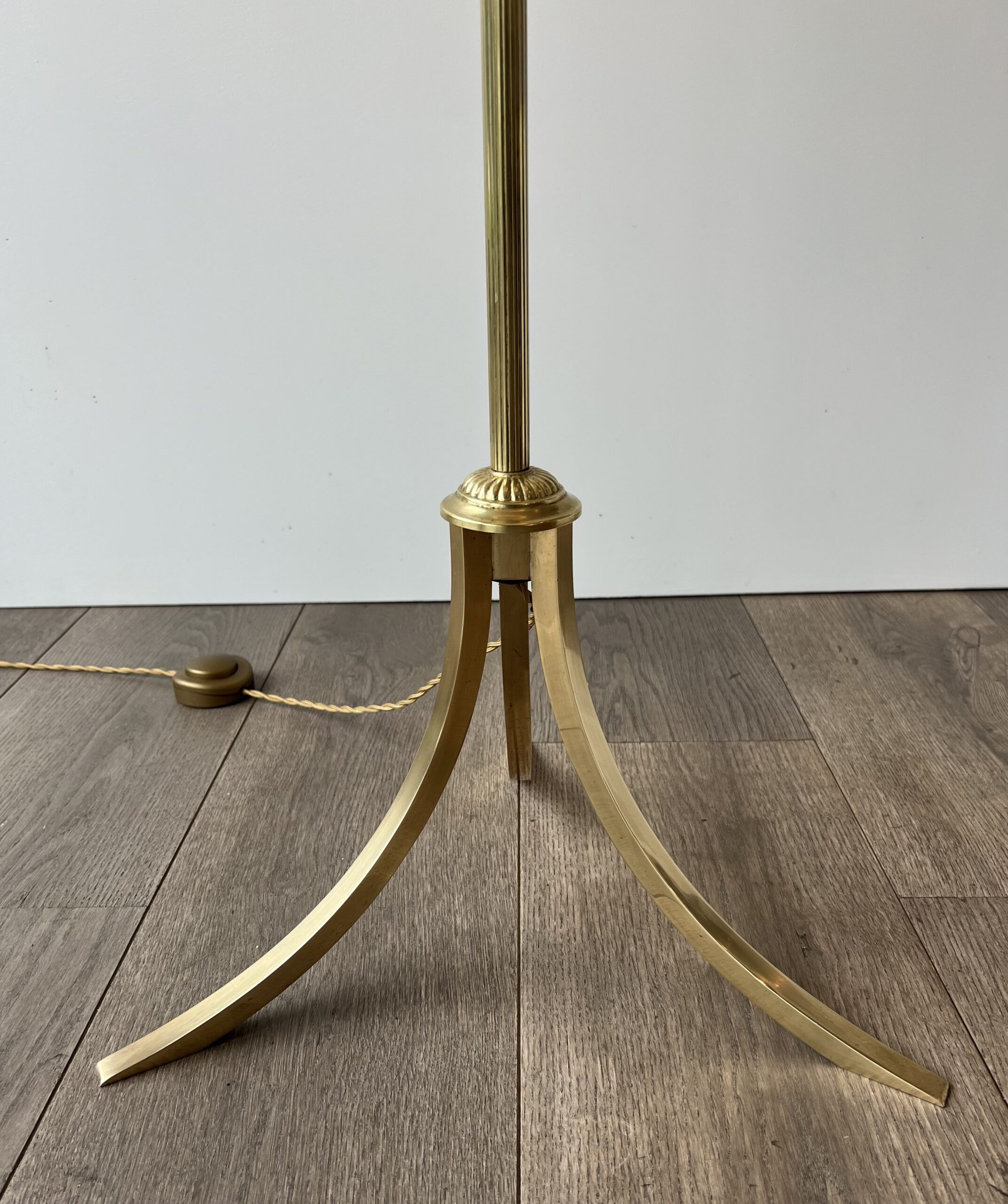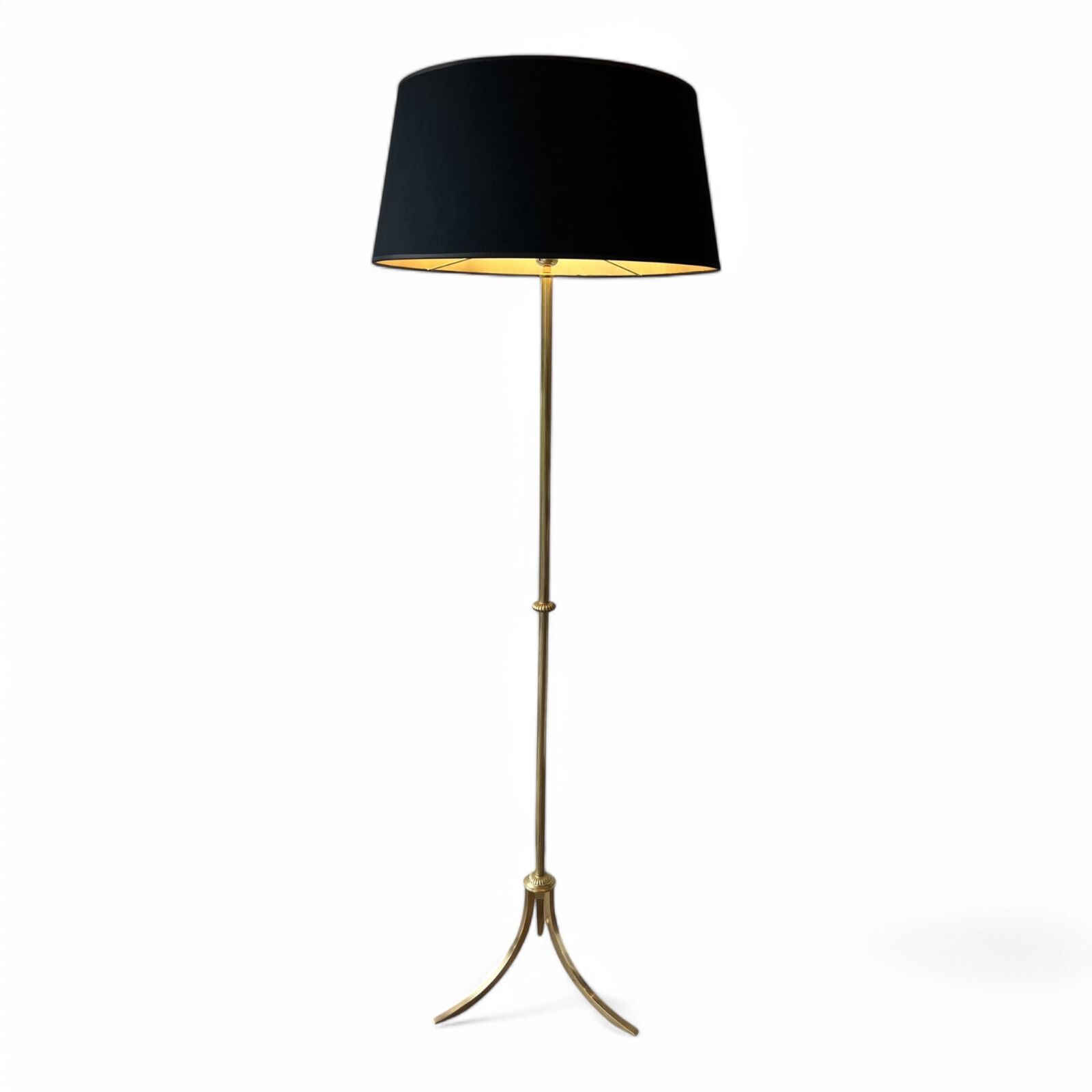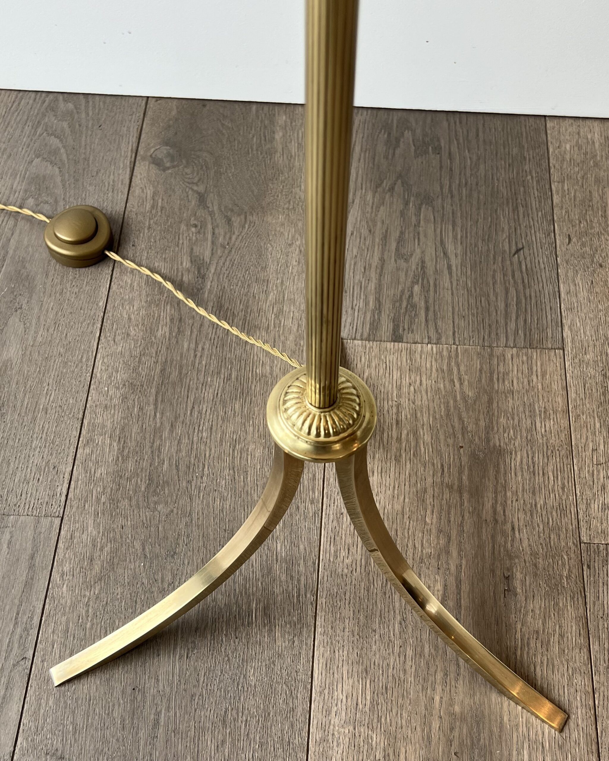 Elegant neoclassical style brass floor lamp designed by Maison Jansen, a renowned French design house known for its refined craftsmanship. This French work, circa 1940, features a sleek and timeless silhouette with classical influences, embodying both sophistication and functionality. The warm patina of the brass structure enhances its vintage charm, making it a perfect addition to traditional and contemporary interiors alike. Ideal for creating a cozy yet stylish ambiance, this floor lamp pairs beautifully with various décor styles.