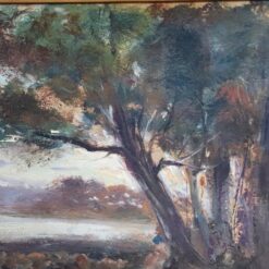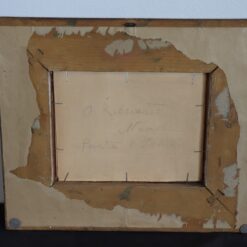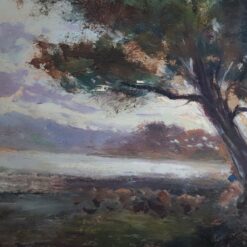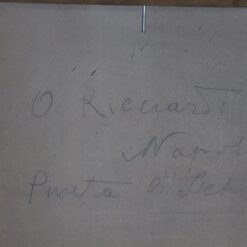 Oil Painting on Board from the early 20th century with strong Mediterranean character. The painting depicts the island of Ischia with sea, sky, and lush coastal vegetation. The artist signed the work Ricciardi at the lower left. The painting likely relates to Italian painter Oscar Ricciardi, Naples 1864–1935, without authentication. Dense pine trees overlook the coastline and open toward a luminous horizon.