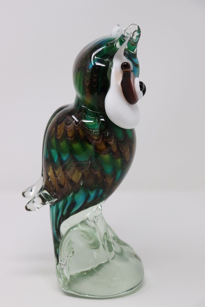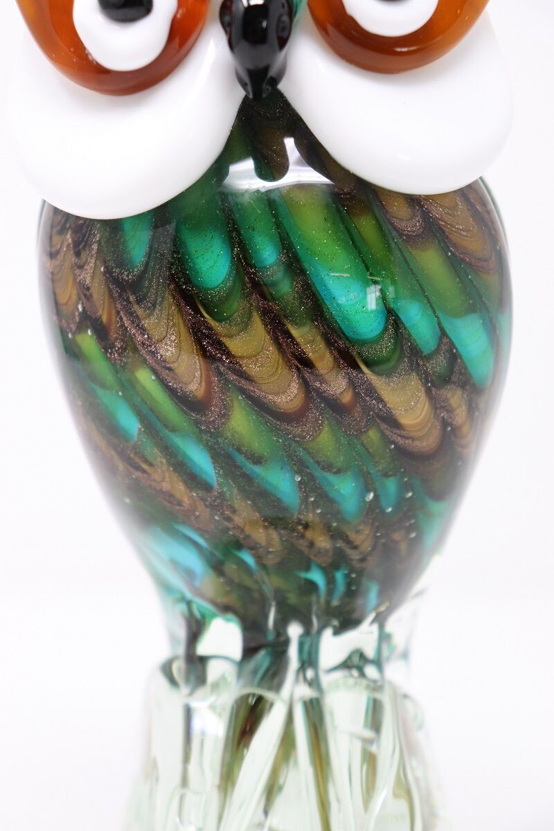 This hand-blown Murano glass owl sculpture stands as a testament to the exceptional artistry and craftsmanship synonymous with Murano glass making. Characterized by a harmonious blend of traditional techniques and imaginative design. This piece is an embodiment of both heritage and innovation.